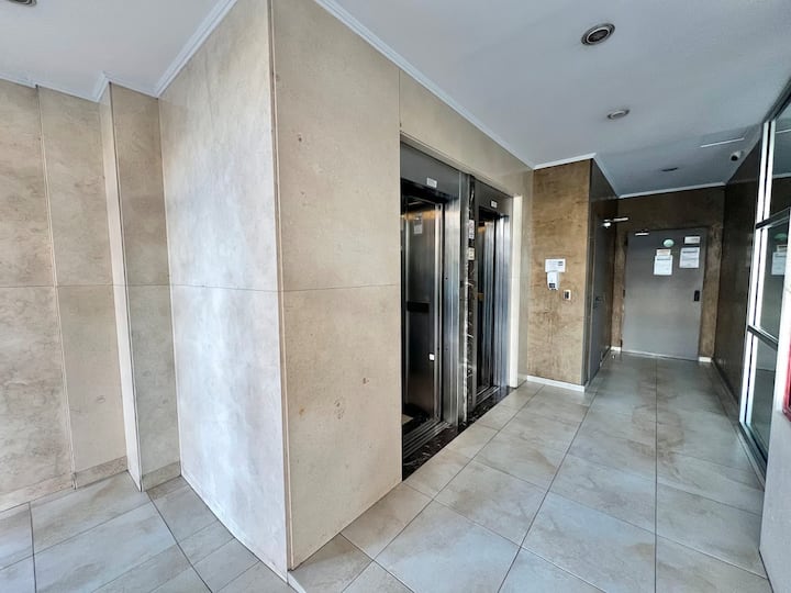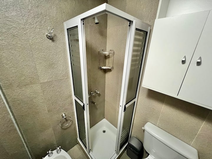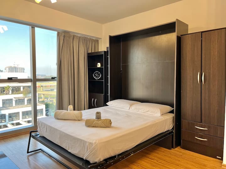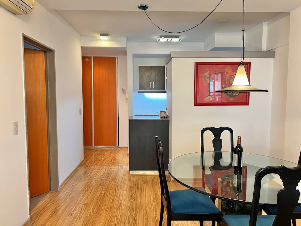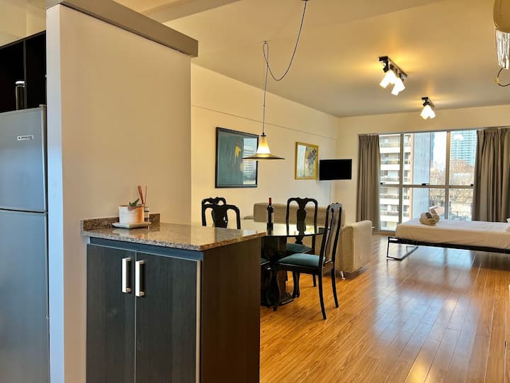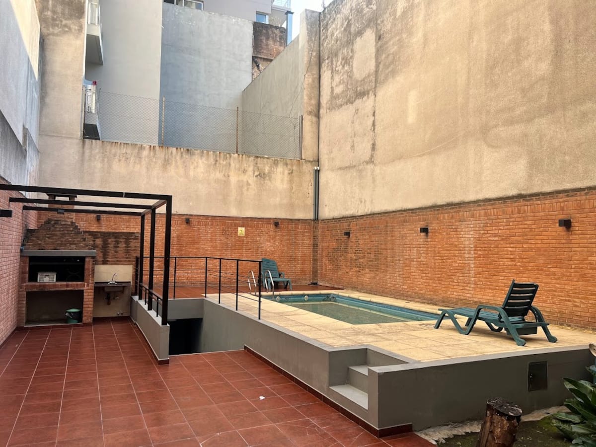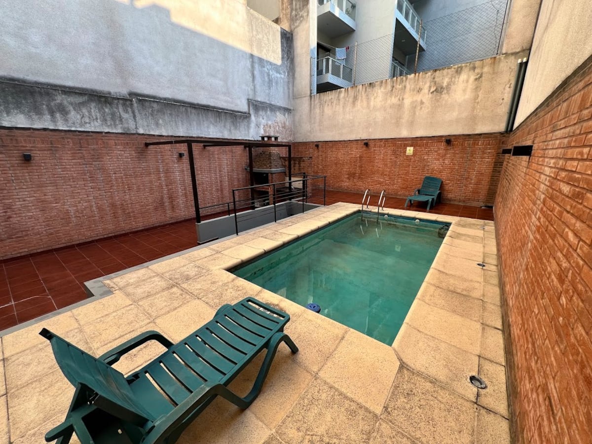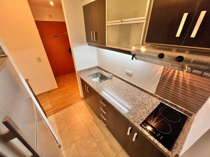 Furnished studio apartment with a wide view over Av. Paseo Colón, in central San Telmo. Equipped with a double bed, split hot/cold air conditioning, smart TV and an all-electric kitchen (cooktop, oven, toaster and electric kettle), with utensils and tableware. The building has a sun terrace, a ground-floor pool with a grill area, laundry with a washer and dryer, and monitored security.