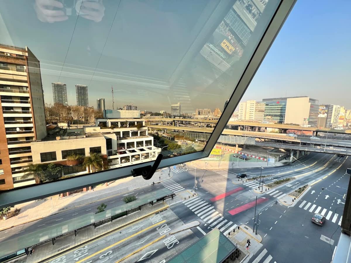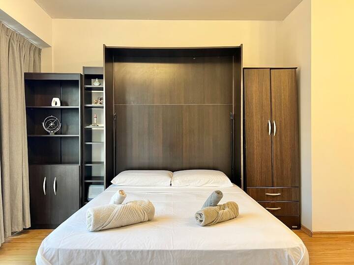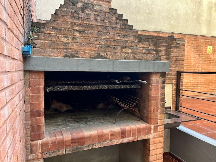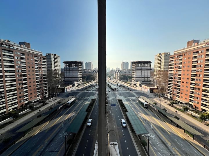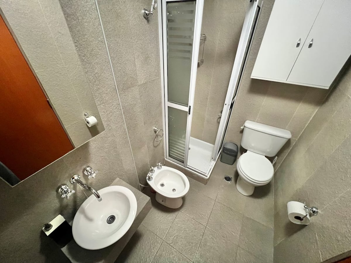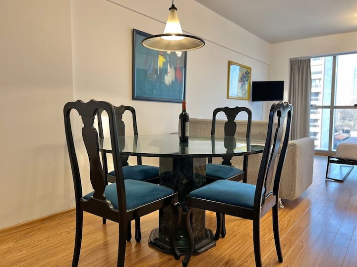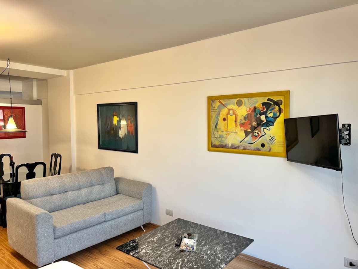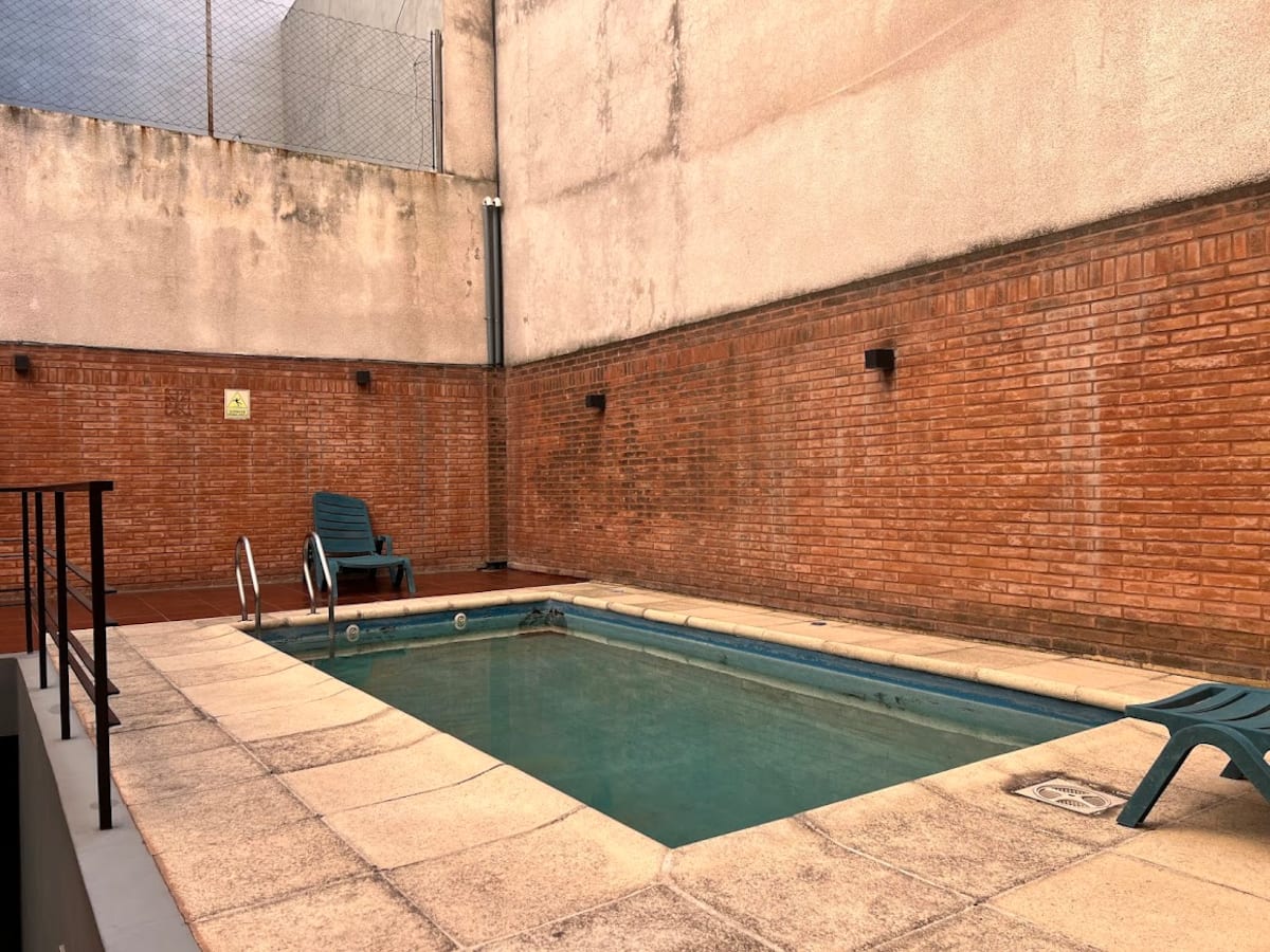 Furnished studio apartment with a wide view over Av. Paseo Colón, in central San Telmo. Equipped with a double bed, split hot/cold air conditioning, smart TV and an all-electric kitchen (cooktop, oven, toaster and electric kettle), with utensils and tableware. The building has a sun terrace, a ground-floor pool with a grill area, laundry with a washer and dryer, and monitored security.