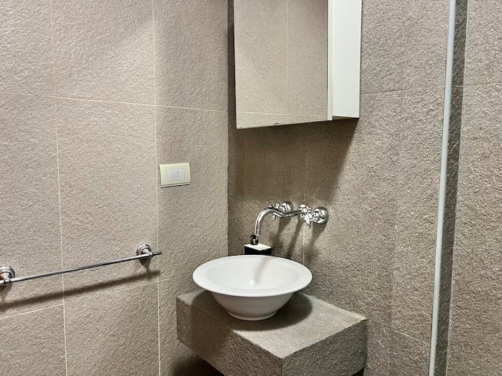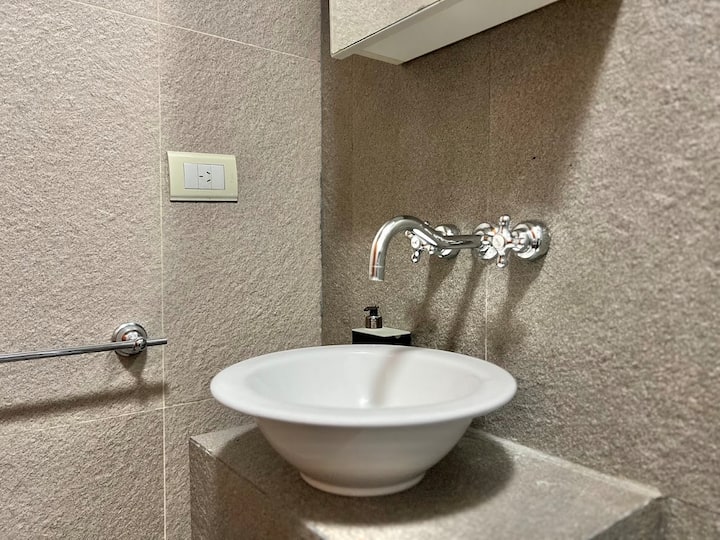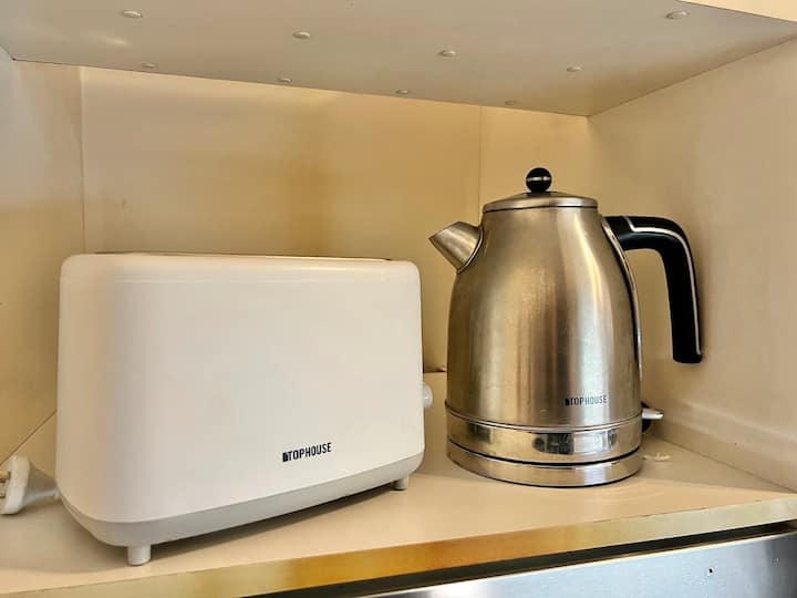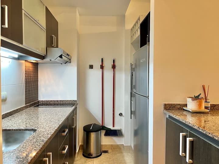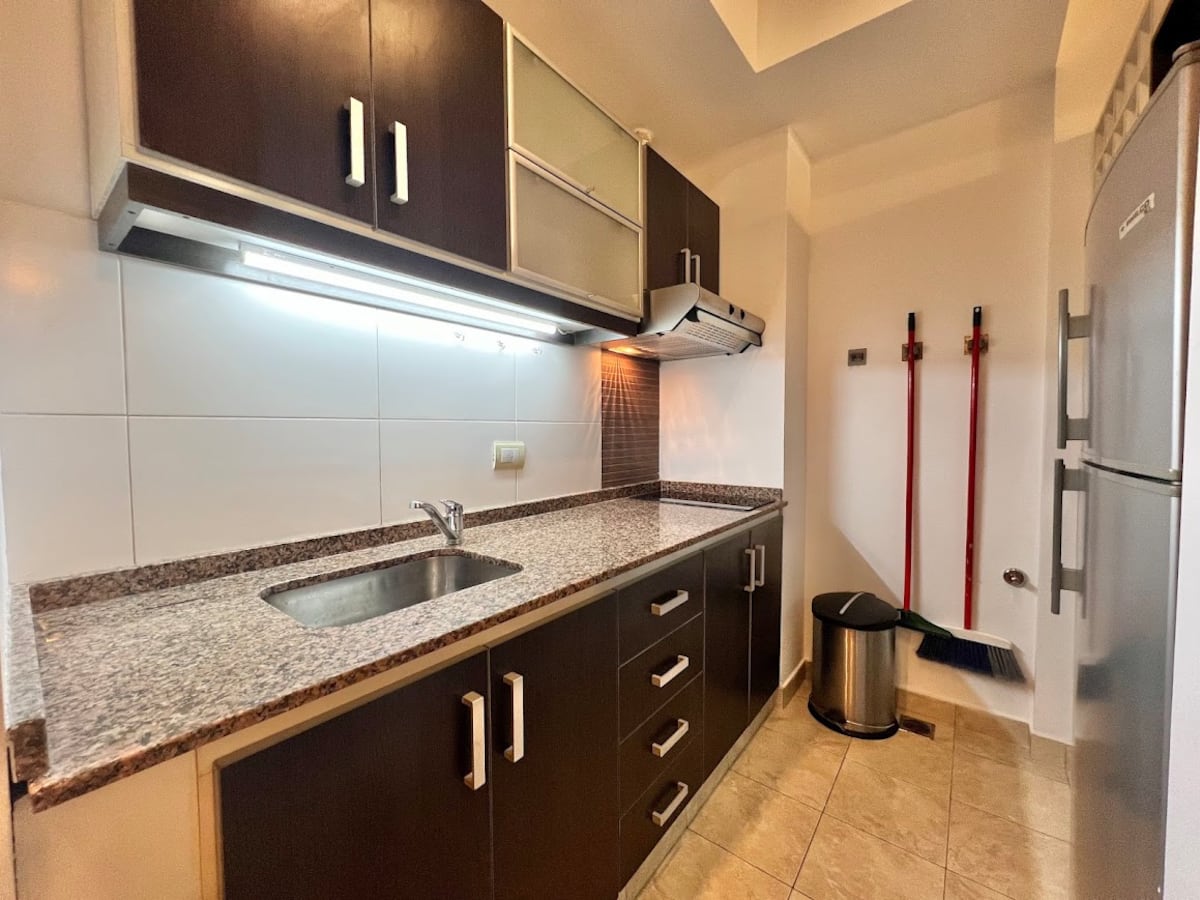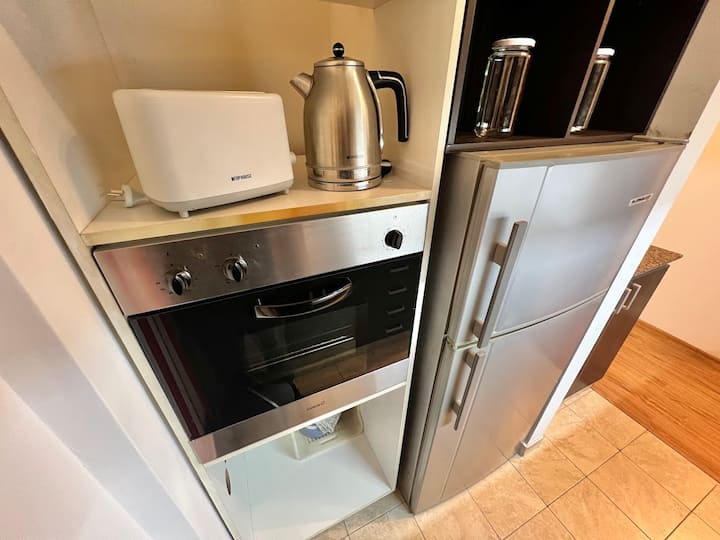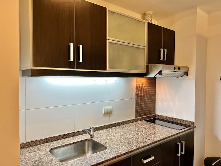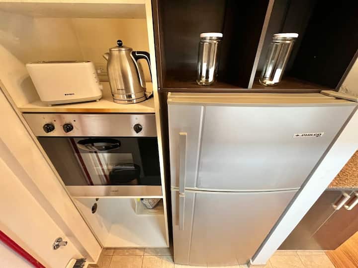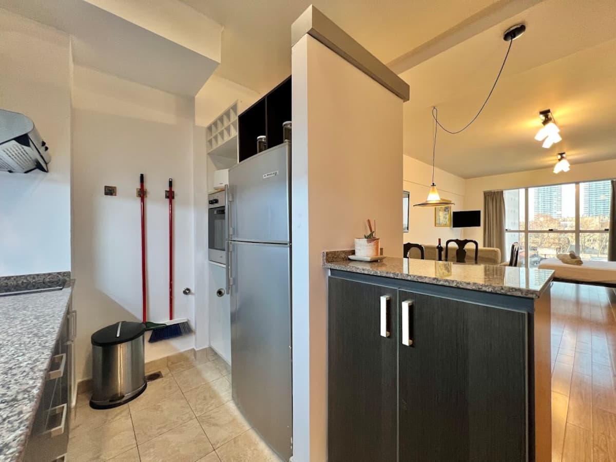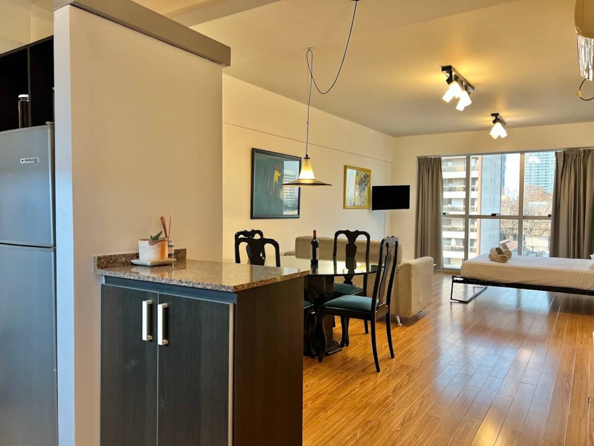Furnished studio apartment with a wide view over Av. Paseo Colón, in central San Telmo. Equipped with a double bed, split hot/cold air conditioning, smart TV and an all-electric kitchen (cooktop, oven, toaster and electric kettle), with utensils and tableware. The building has a sun terrace, a ground-floor pool with a grill area, laundry with a washer and dryer, and monitored security.
