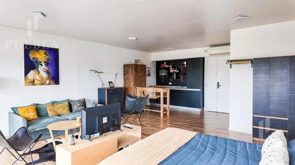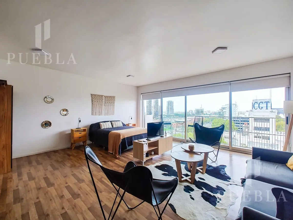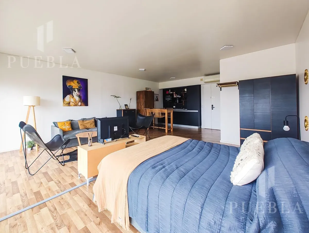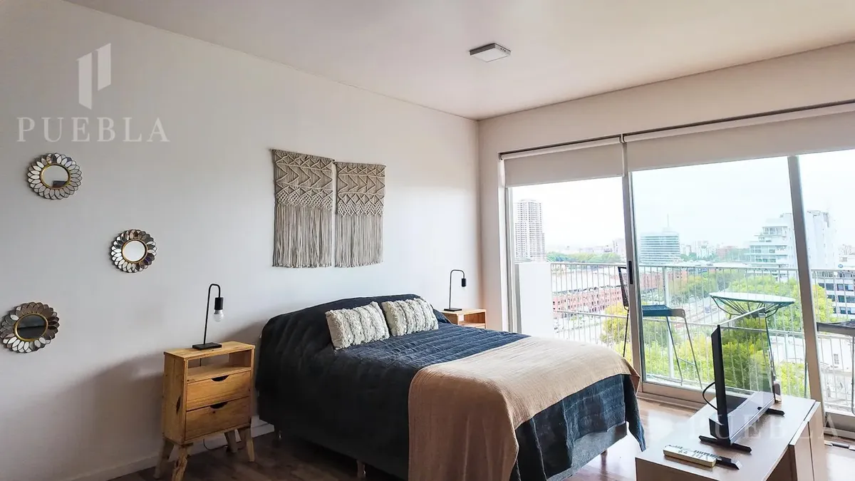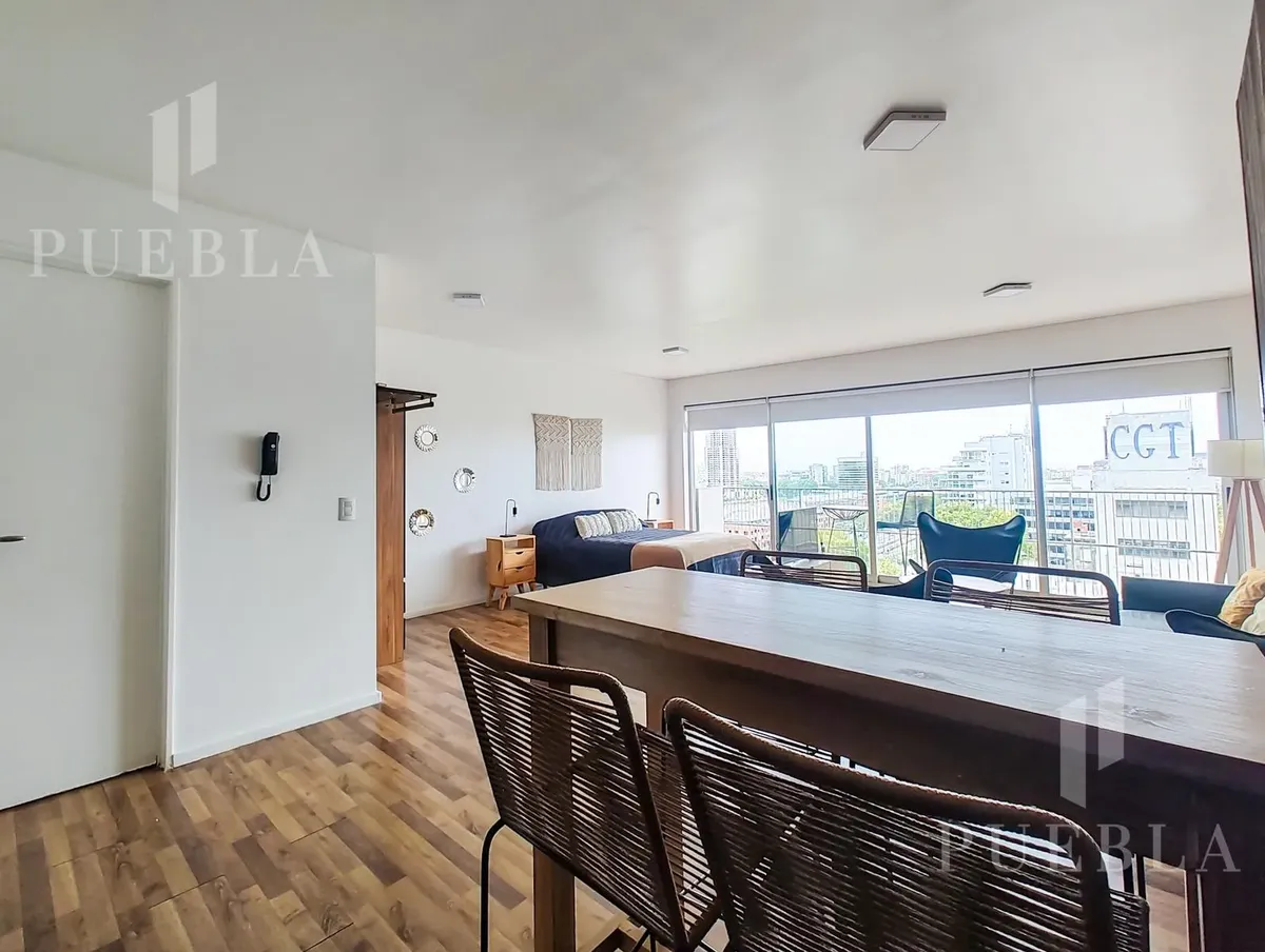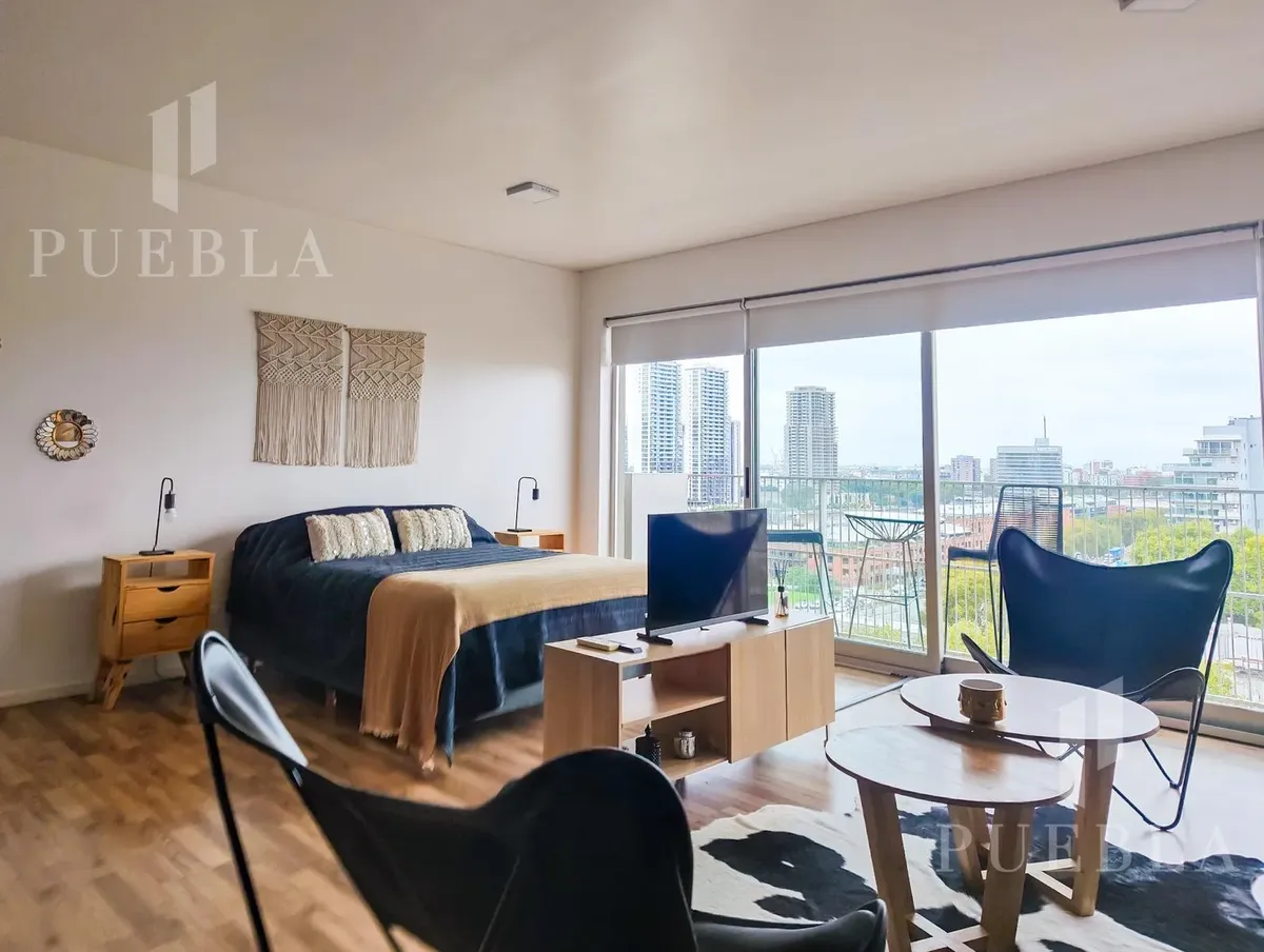 Furnished studio apartment for rent in Puerto Madero, 49 m². Double-glazed (DVH) floor-to-ceiling windows with open views of the river and the city. The building has a 25-metre pool, fully equipped gym, meeting room, jacuzzi, sauna, spa, laundry, on-site restaurant and 24-hour security. Rent is packaged at USD 1,250 per month, including building fees and services except electricity, billed via an individual meter (Edesur). An (assigned) parking space is optional for USD 100 per month.