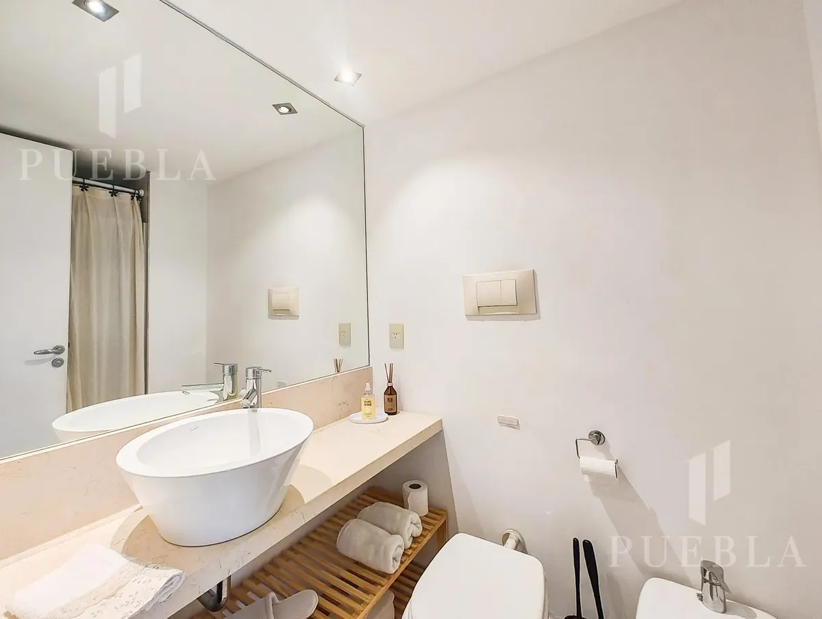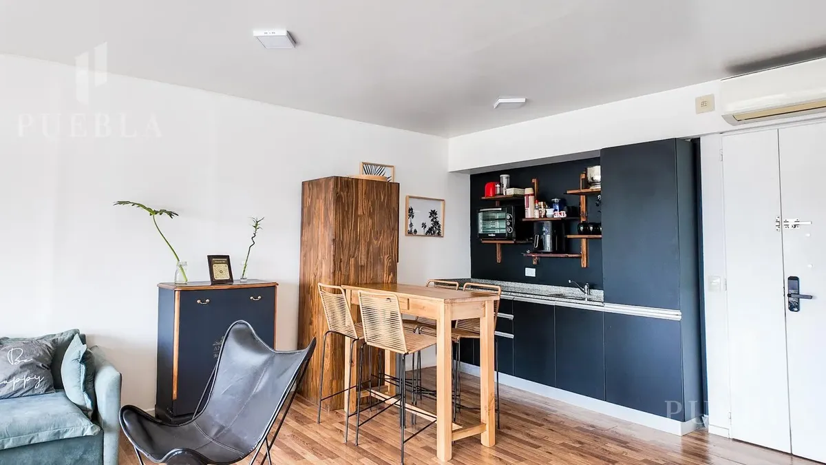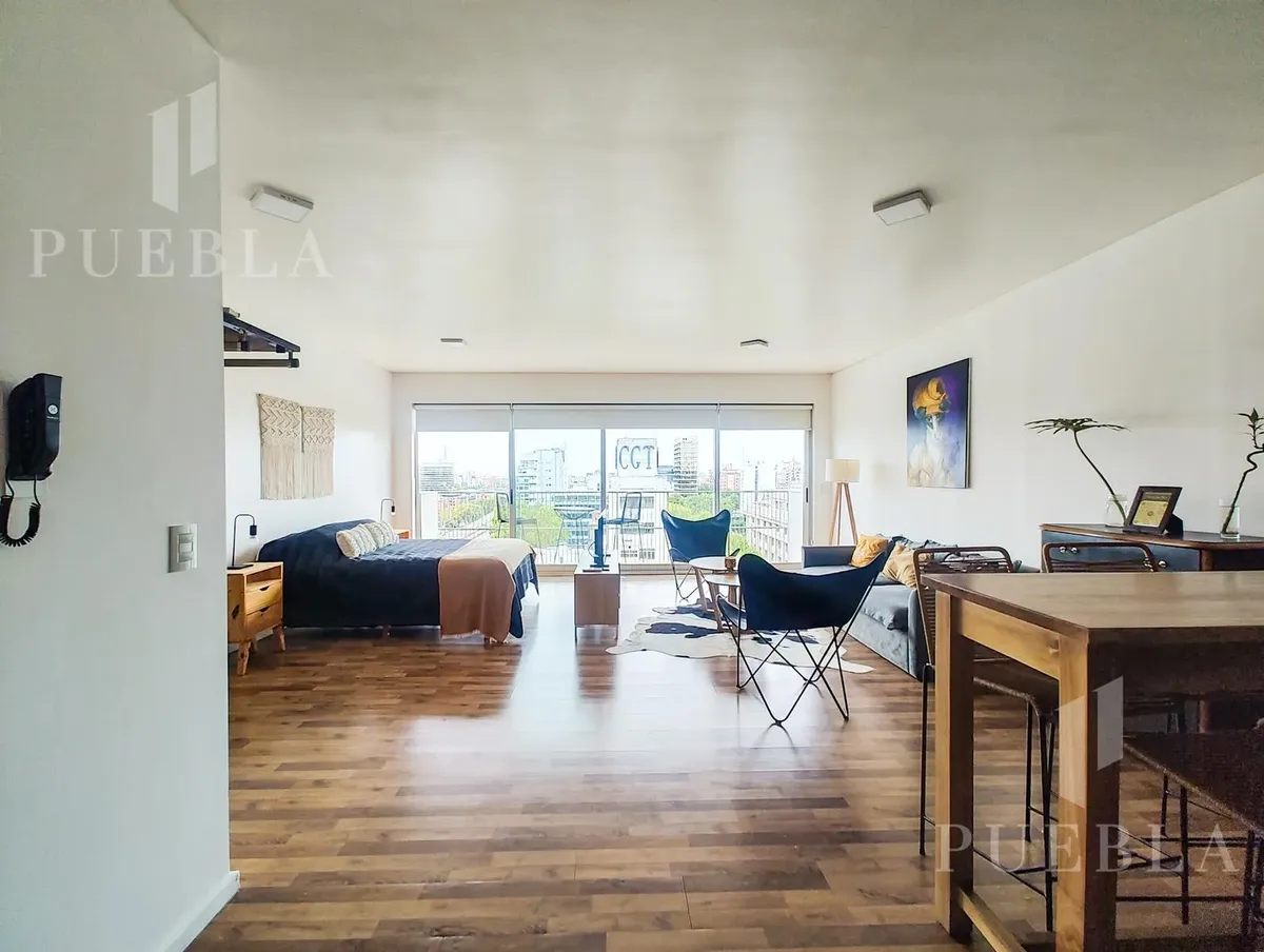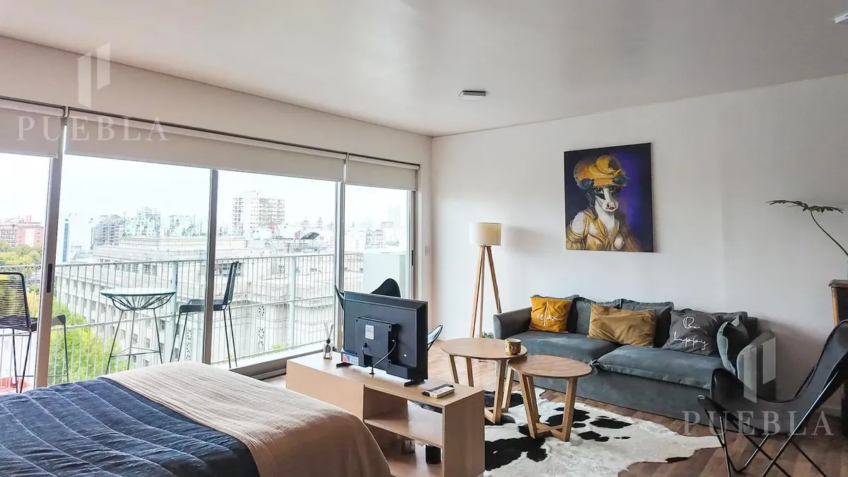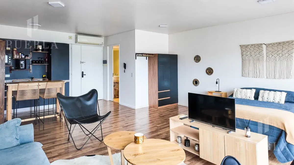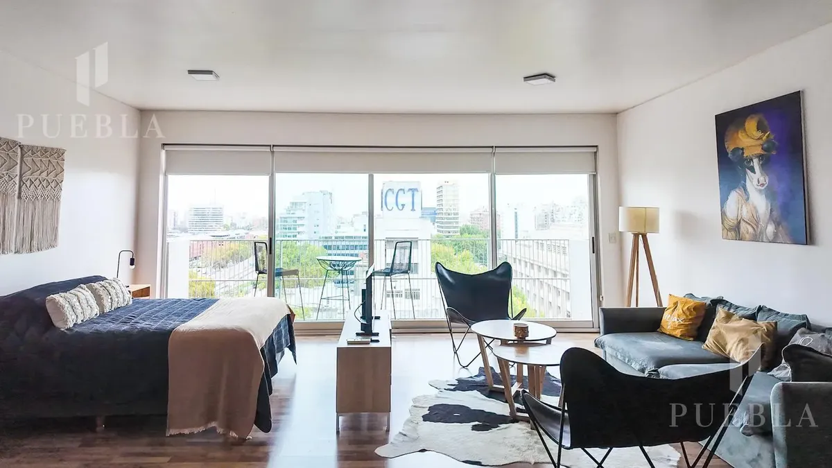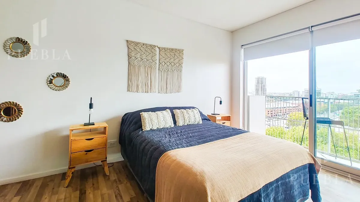 Furnished studio apartment for rent in Puerto Madero, 49 m². Double-glazed (DVH) floor-to-ceiling windows with open views of the river and the city. The building has a 25-metre pool, fully equipped gym, meeting room, jacuzzi, sauna, spa, laundry, on-site restaurant and 24-hour security. Rent is packaged at USD 1,250 per month, including building fees and services except electricity, billed via an individual meter (Edesur). An (assigned) parking space is optional for USD 100 per month.