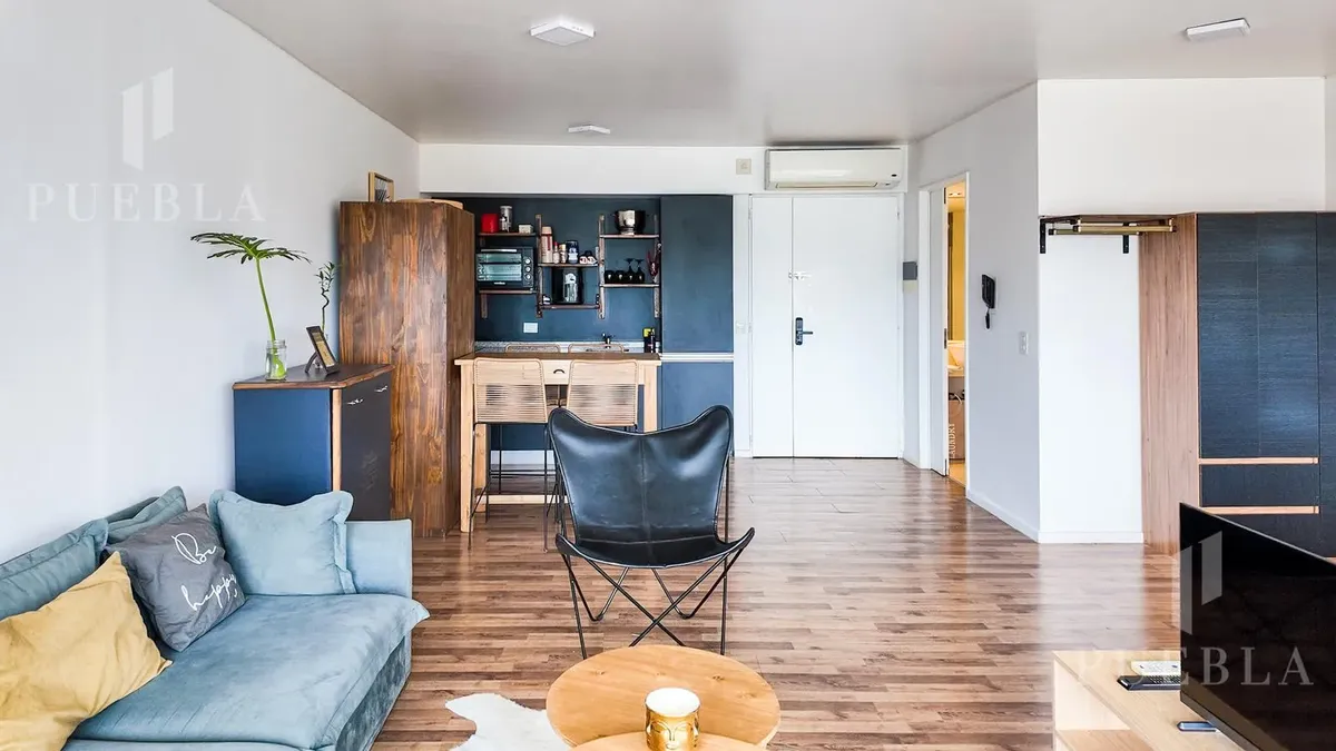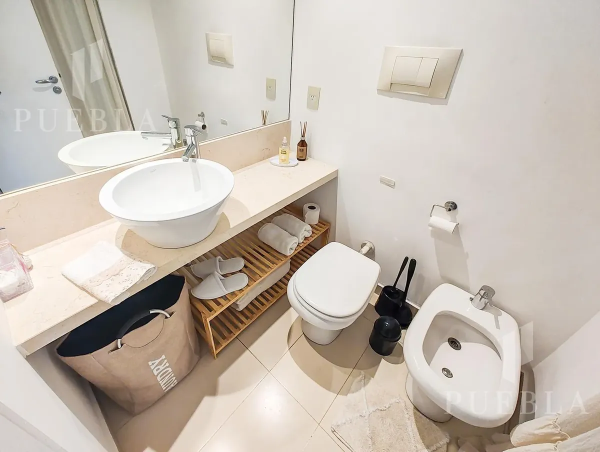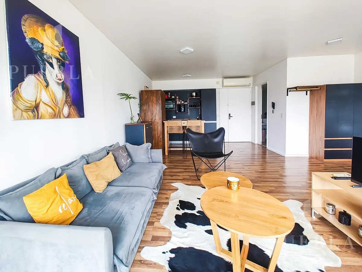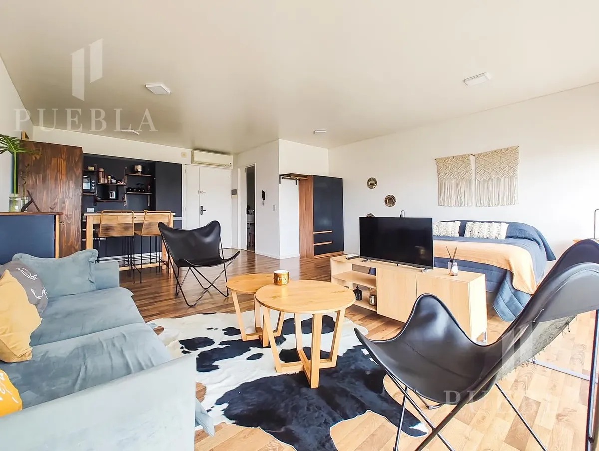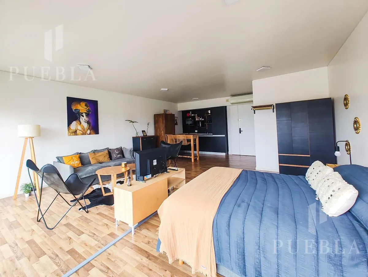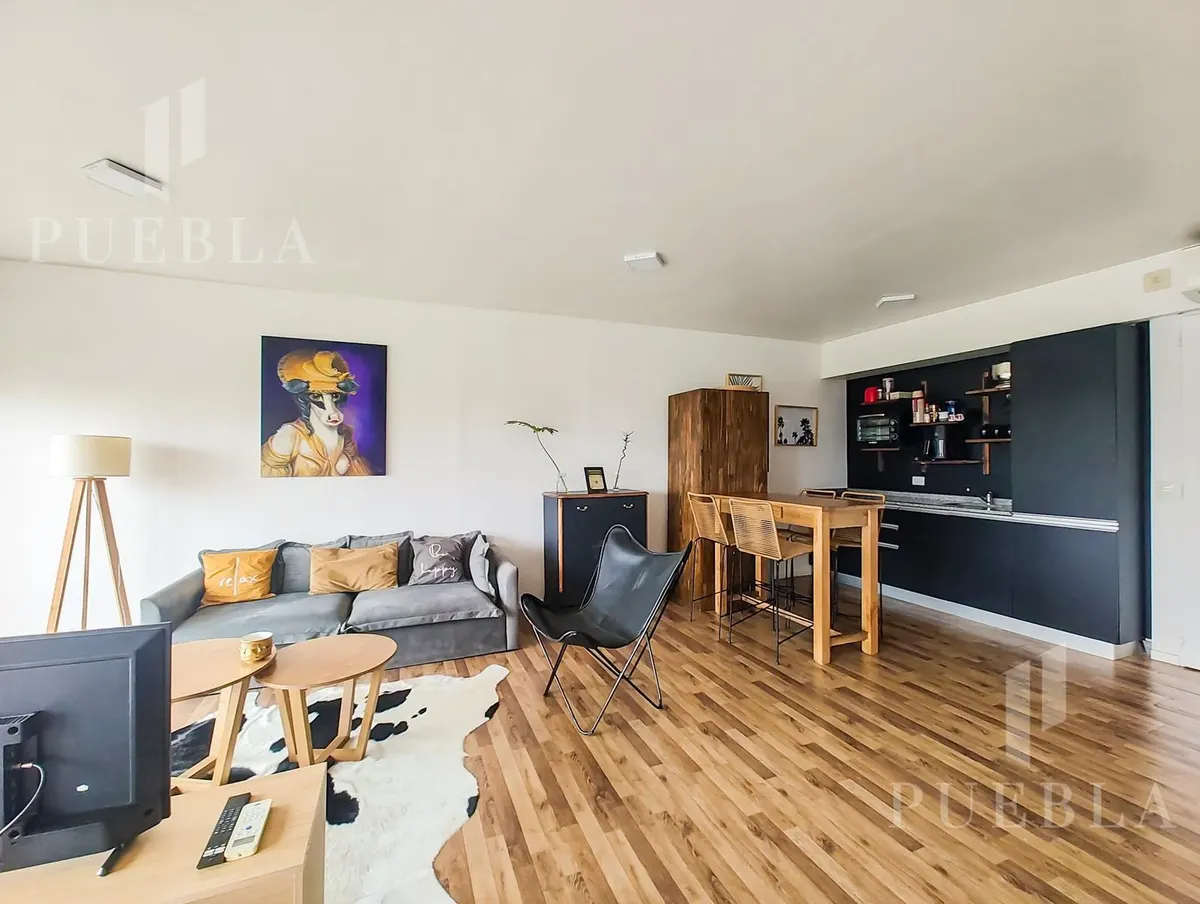 Furnished studio apartment for rent in Puerto Madero, 49 m². Double-glazed (DVH) floor-to-ceiling windows with open views of the river and the city. The building has a 25-metre pool, fully equipped gym, meeting room, jacuzzi, sauna, spa, laundry, on-site restaurant and 24-hour security. Rent is packaged at USD 1,250 per month, including building fees and services except electricity, billed via an individual meter (Edesur). An (assigned) parking space is optional for USD 100 per month.