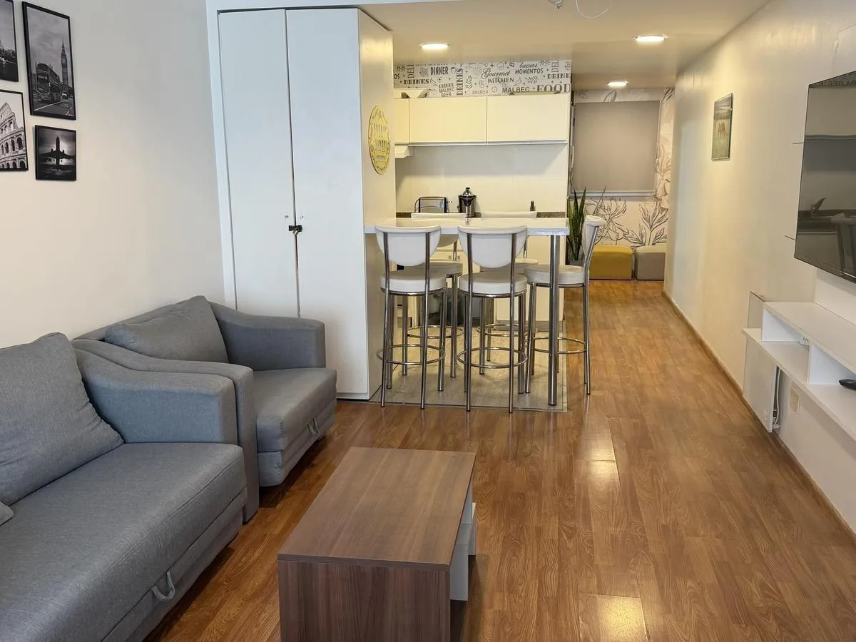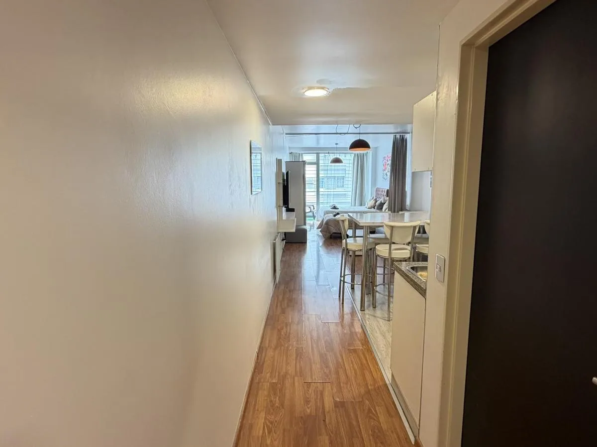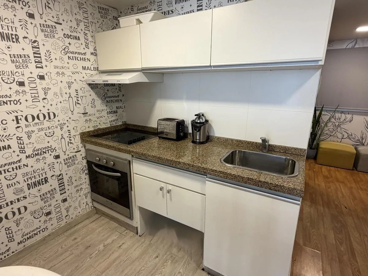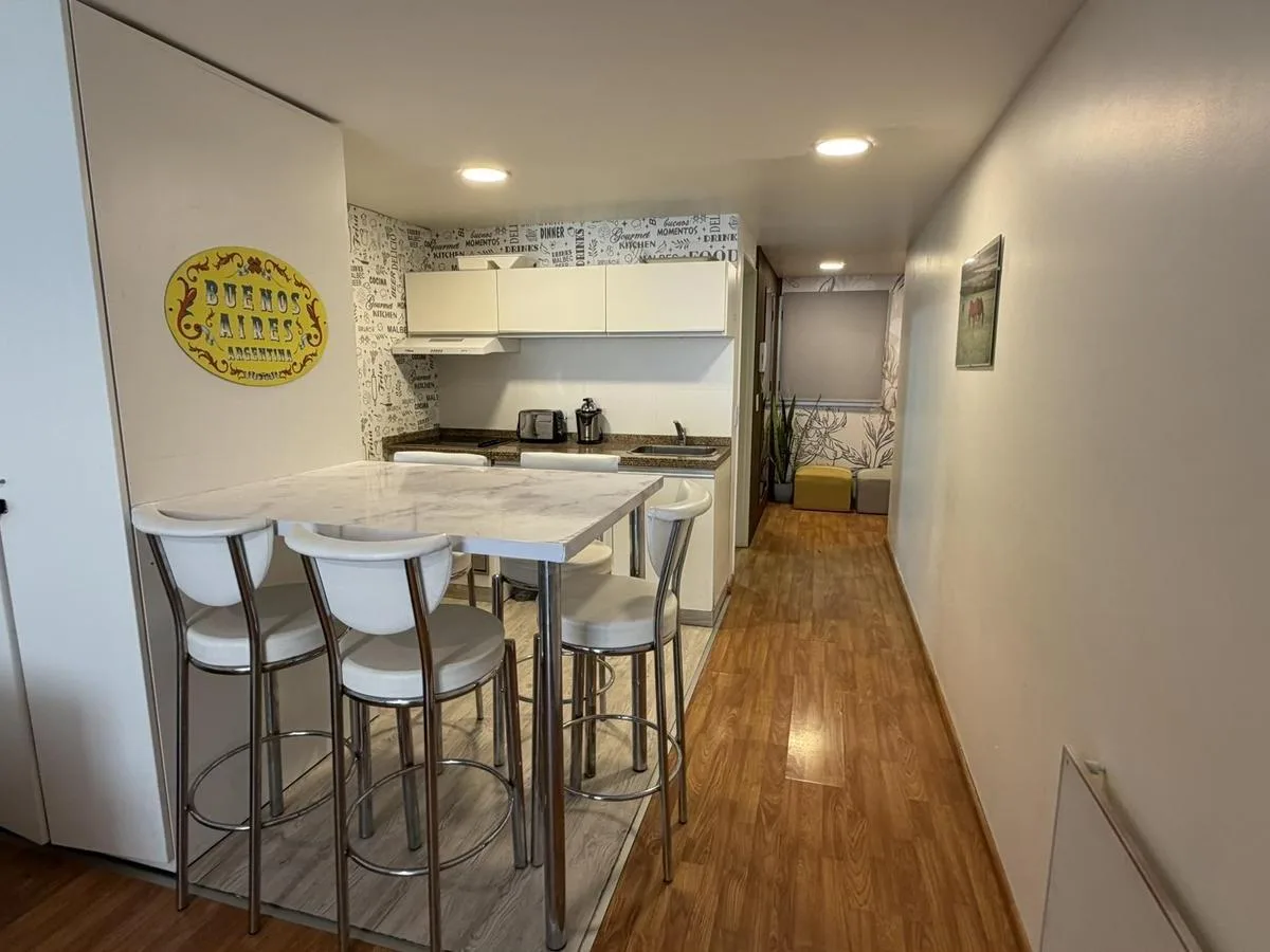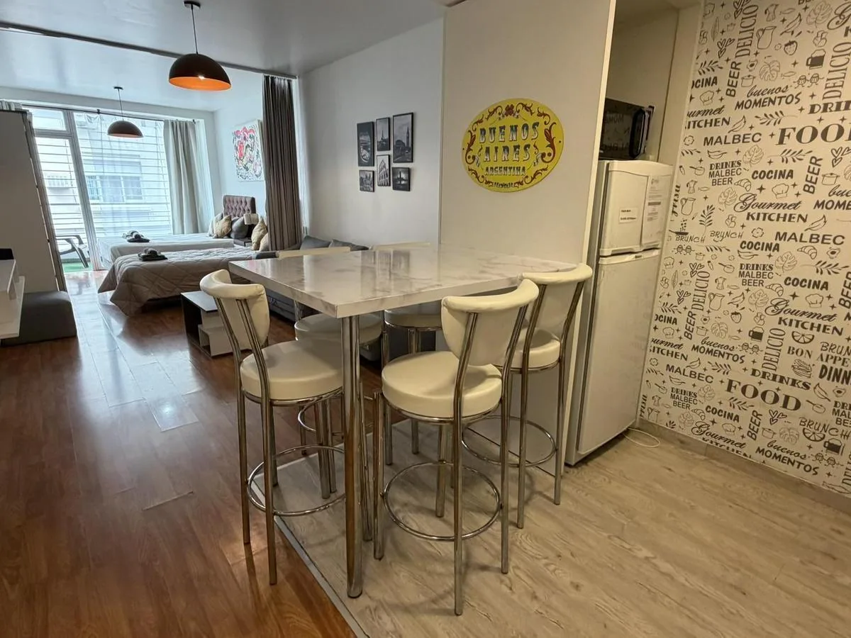 Studio apartment on the 1st floor in San Telmo with an east-facing balcony. Fully furnished, with sliding panels separating the sleeping area from the living area. Includes an integrated kitchen, a full bathroom, and air conditioning. Building amenities include a pool, a BBQ/grill area, laundry and a doorman, and the rent includes an (assigned) parking space; temporary rental is offered with all services included.