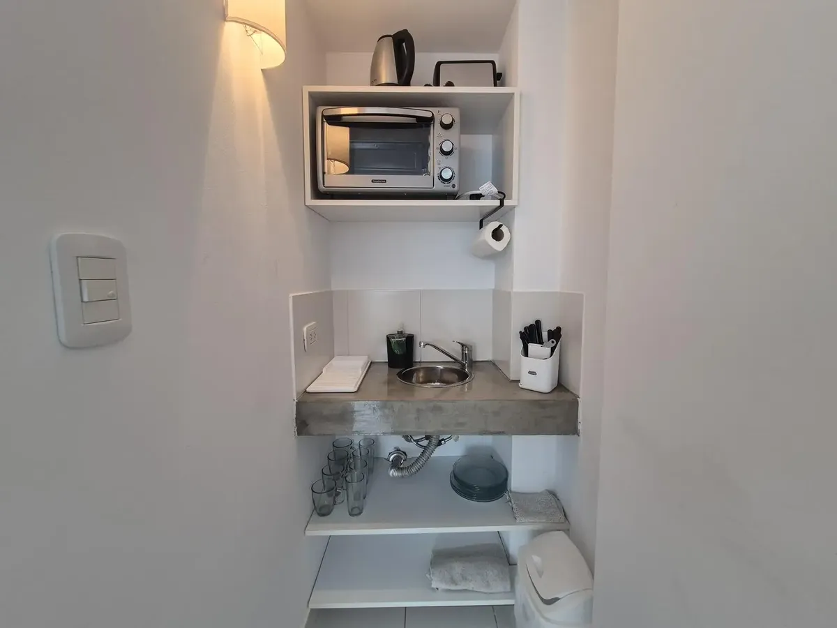 Furnished studio apartment of 31 m², street-facing in Tigre Centro. It includes a kitchenette with electric kettle, toaster, electric oven and a small refrigerator, plus tableware and cutlery, complete bathroom, blackout curtains, and assigned parking. The rental price does not include water, Wi-Fi, electricity, municipal taxes or building fees, and pets are not allowed.