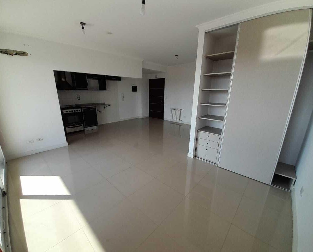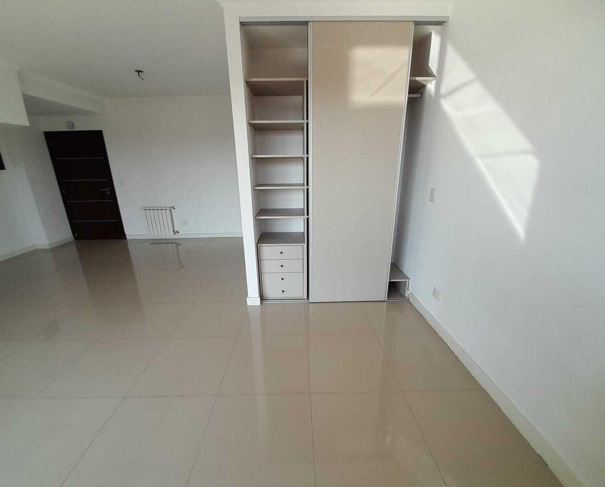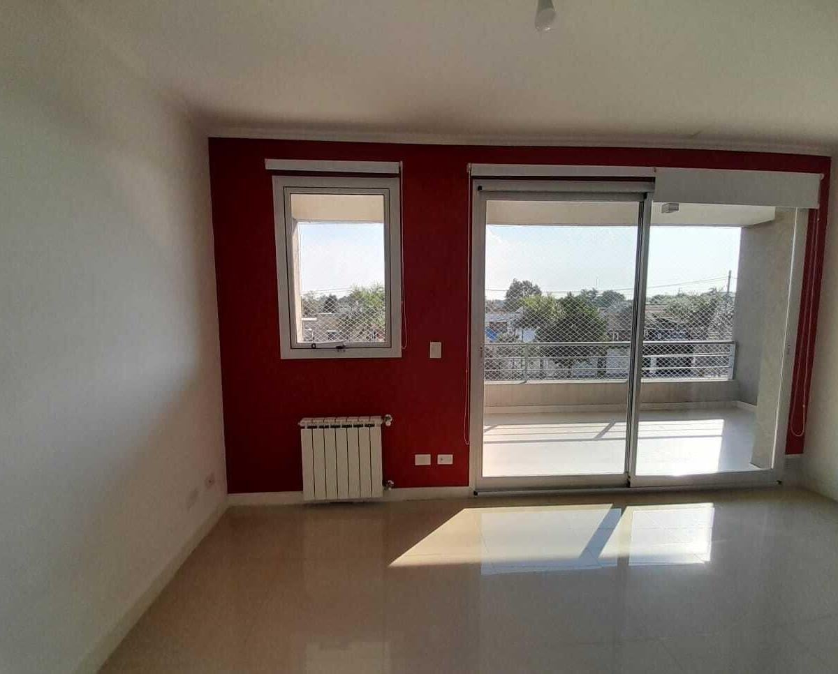 Studio apartment for rent in General Pacheco Centro. Located on the first floor at the front of a building on Av. Boulogne Sur Mer, about 400 metres from Ruta 197. Features include built-in wardrobe with sliding doors, radiator heating with electric boiler, kitchen with lower and upper cabinets, space for a front-loading washing machine, pre-installation for air conditioning, and windows opening onto a small balcony with roller blinds. The building has uncovered parking, automatic gate, storage