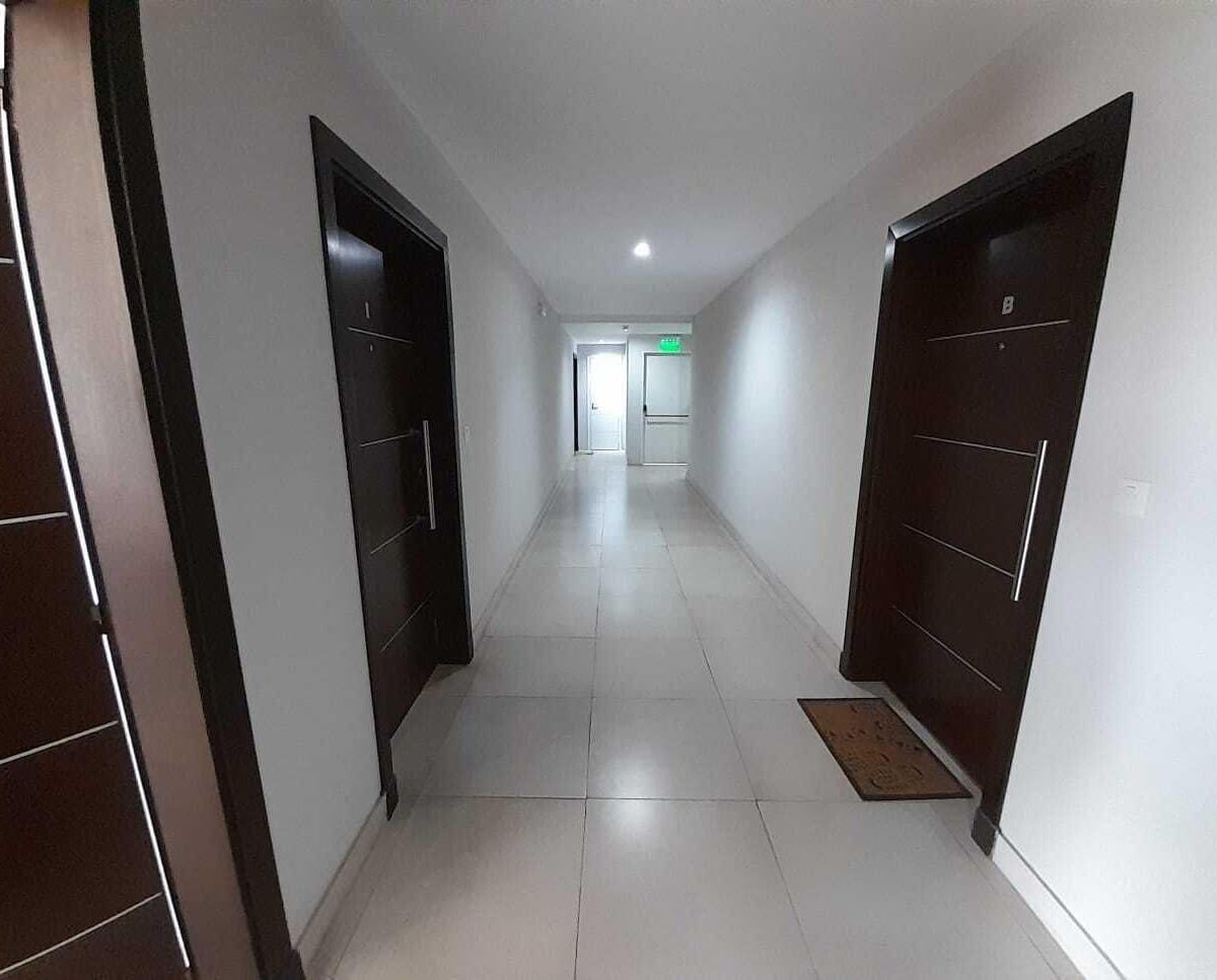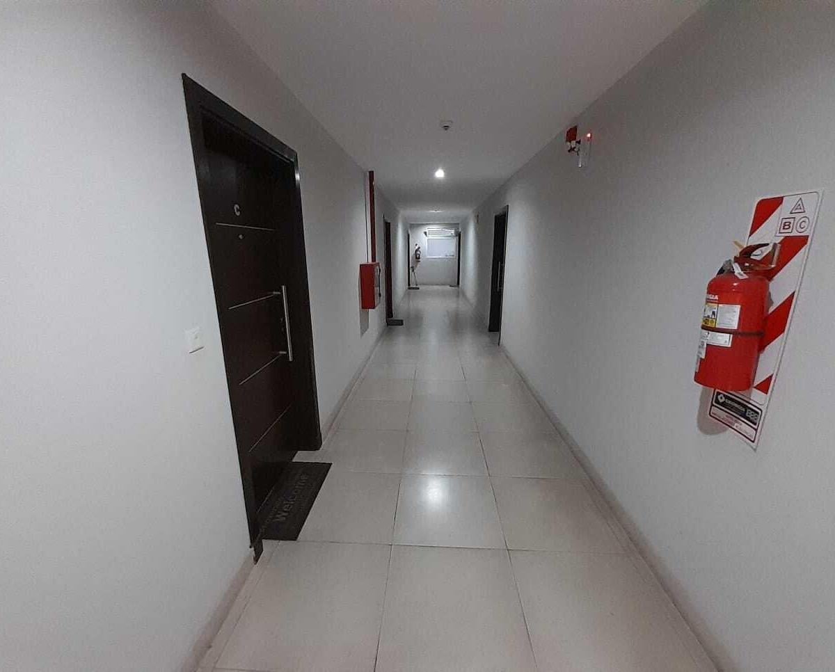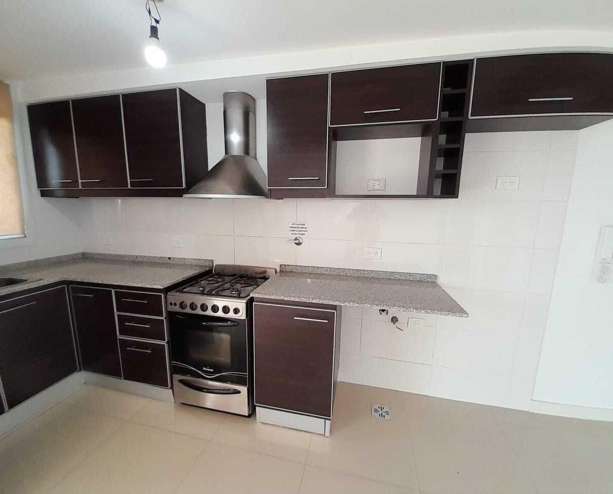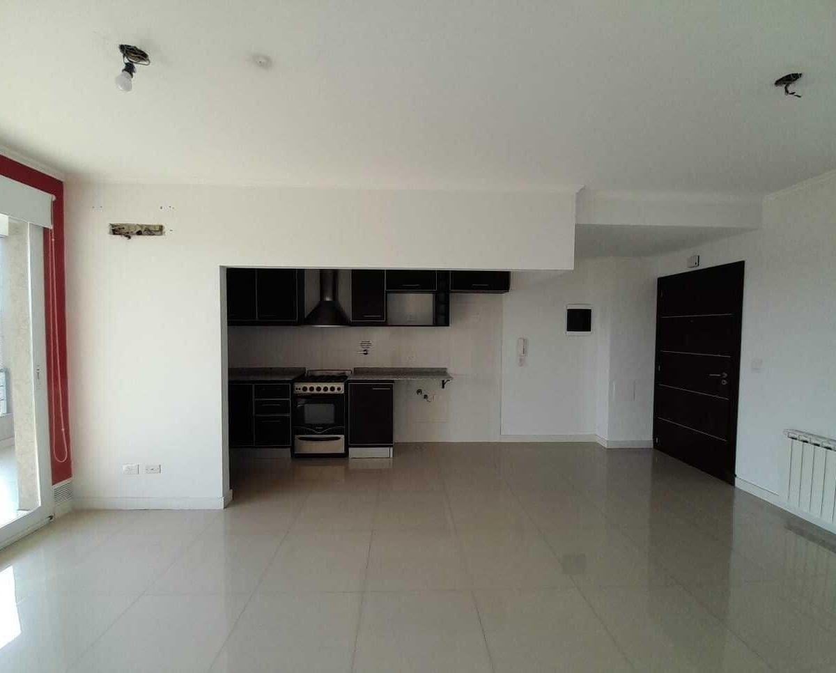 Studio apartment for rent in General Pacheco Centro. Located on the first floor at the front of a building on Av. Boulogne Sur Mer, about 400 metres from Ruta 197. Features include built-in wardrobe with sliding doors, radiator heating with electric boiler, kitchen with lower and upper cabinets, space for a front-loading washing machine, pre-installation for air conditioning, and windows opening onto a small balcony with roller blinds. The building has uncovered parking, automatic gate, storage