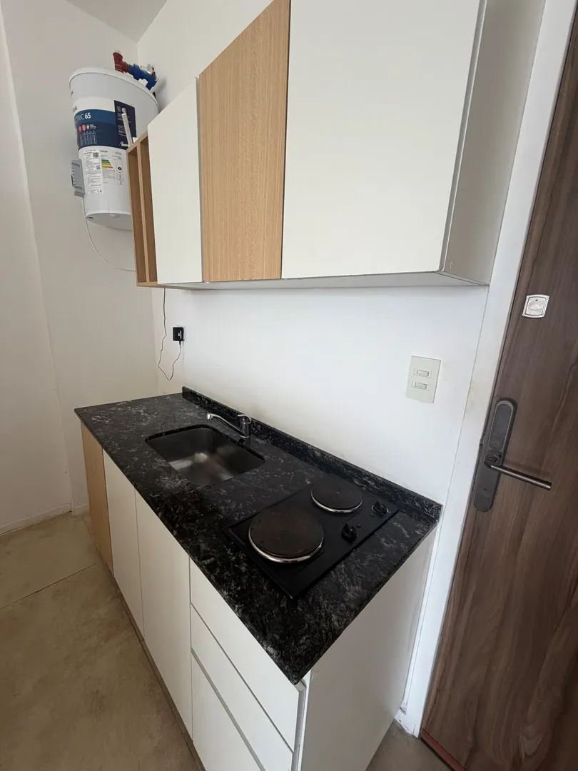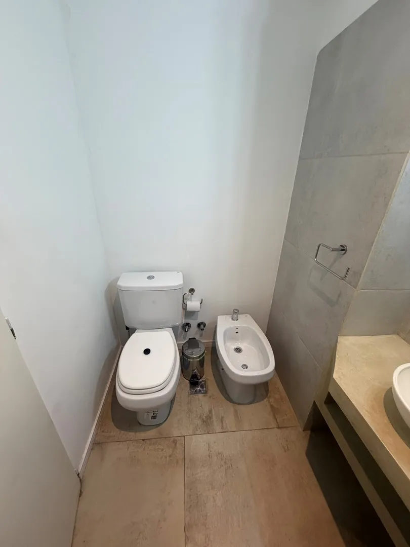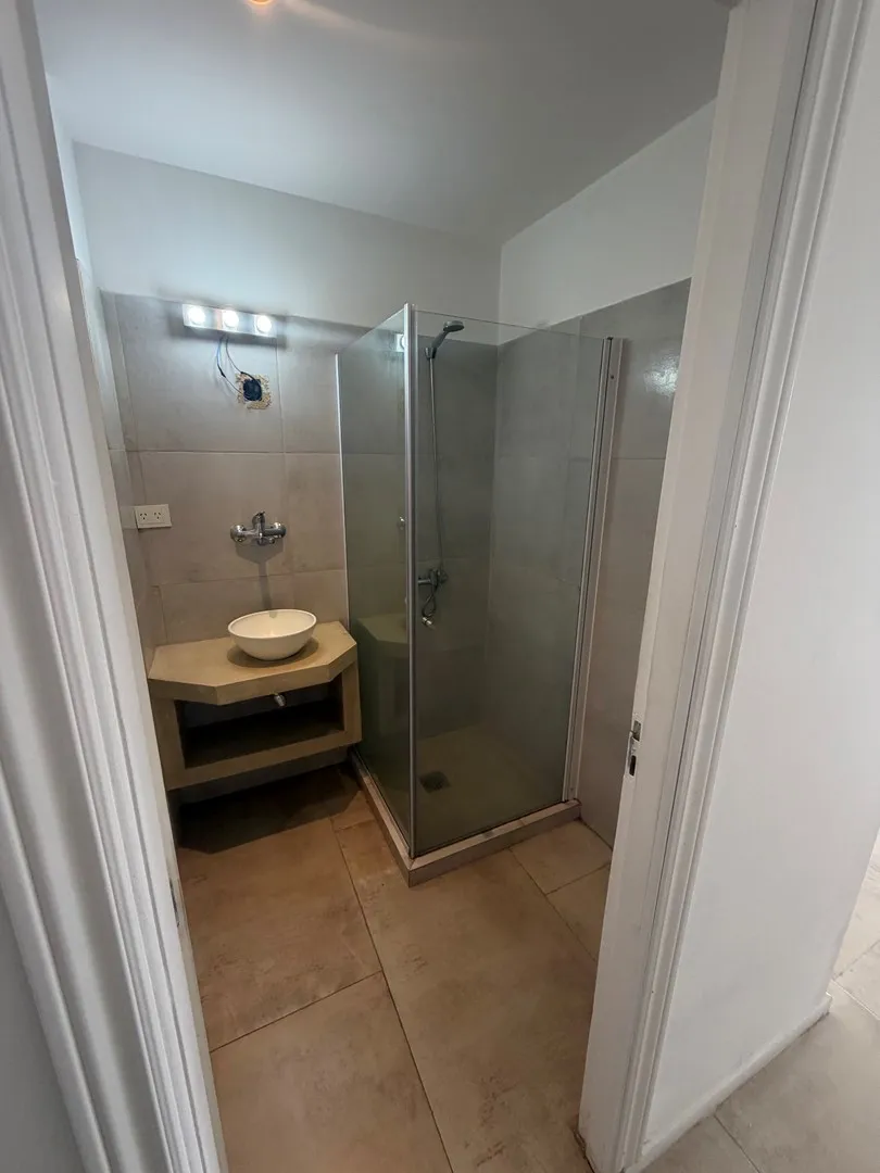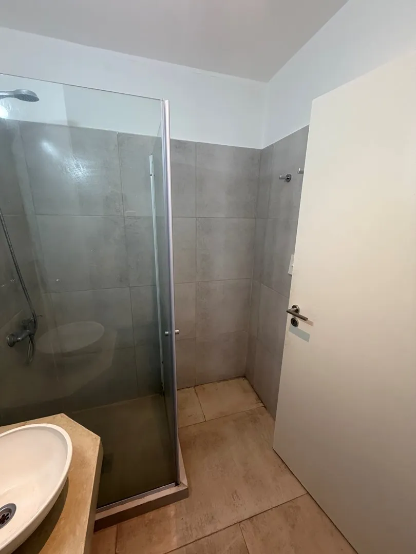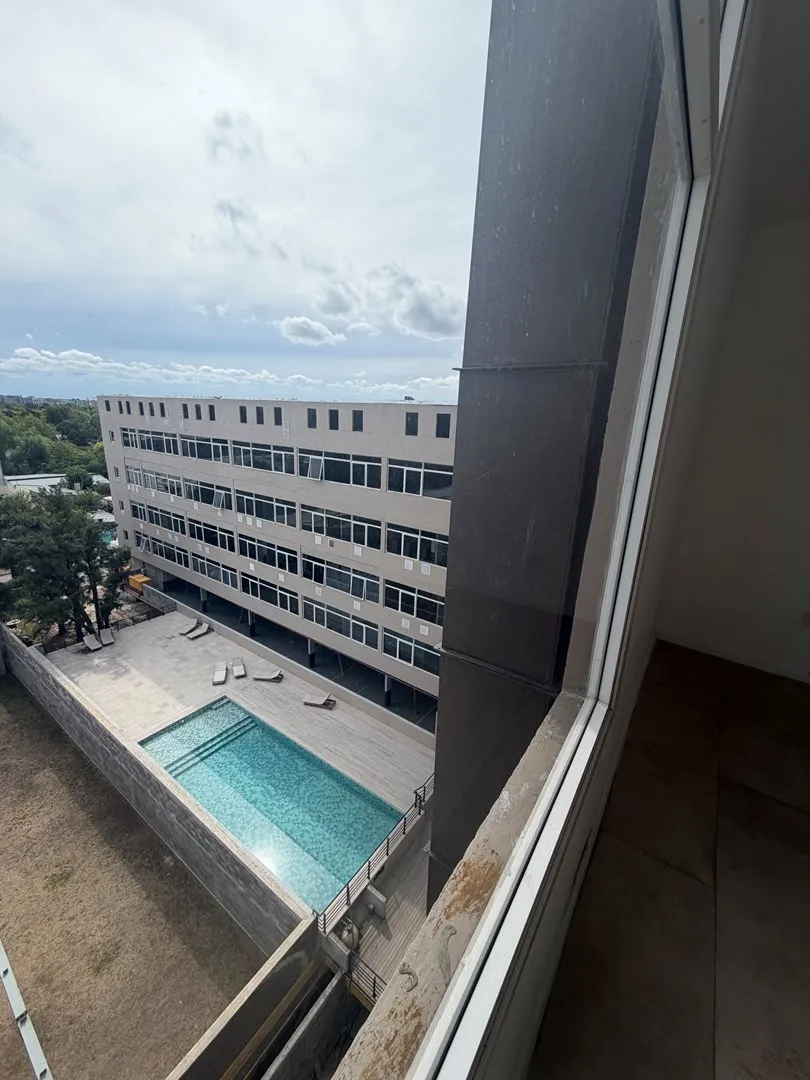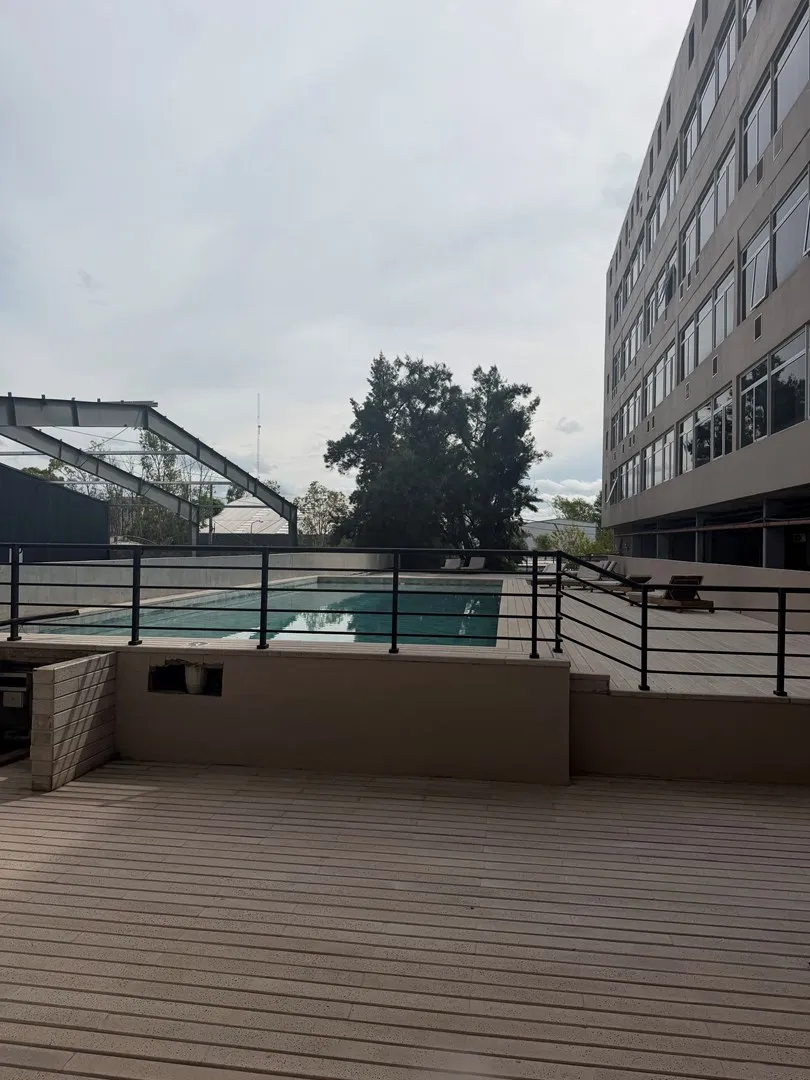 Studio apartment for rent in Delta Center, Rincón de Milberg, Tigre, located on the 1st floor with a private bathroom and an assigned parking space. Building amenities include 24-hour security, an uncovered pool, solarium, valet parking, a sky bar on the top floor, and an integrated backup generator. The complex is described as an “intelligent building” and “green building,” including its own wastewater treatment plant, reuse tanks for irrigation, and 500 solar panels. Access to the unit is via