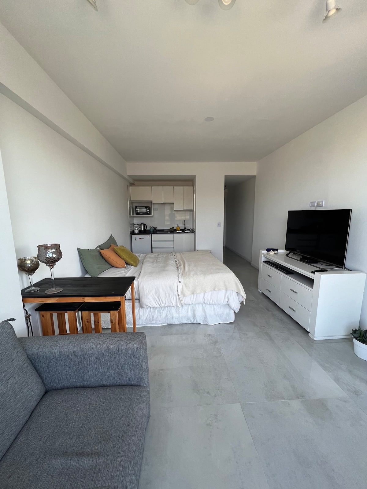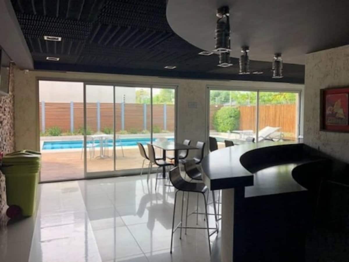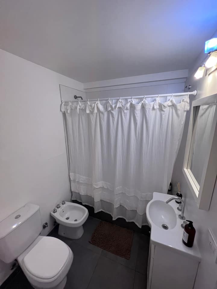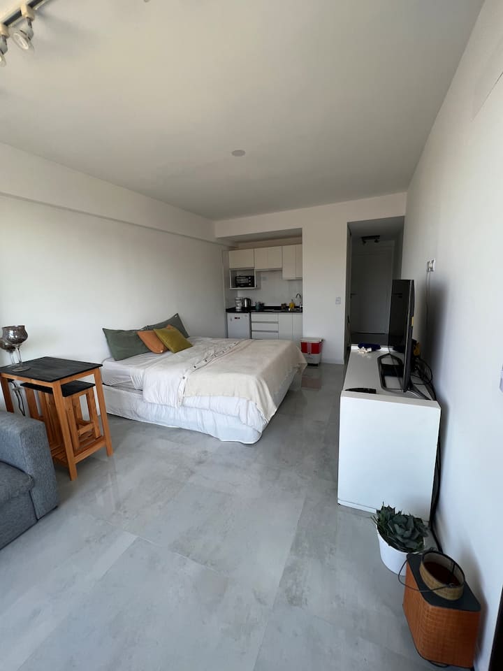 Studio apartment in Tigre with 24-hour security. The building has a multipurpose residents’ lounge for co-working with WiFi, plus a gym and a seasonal pool. The unit includes an extra-large bed, cable TV, WiFi, and kitchen equipment. The listing notes proximity to Buenos Aires by highway and close access to the river and nature.