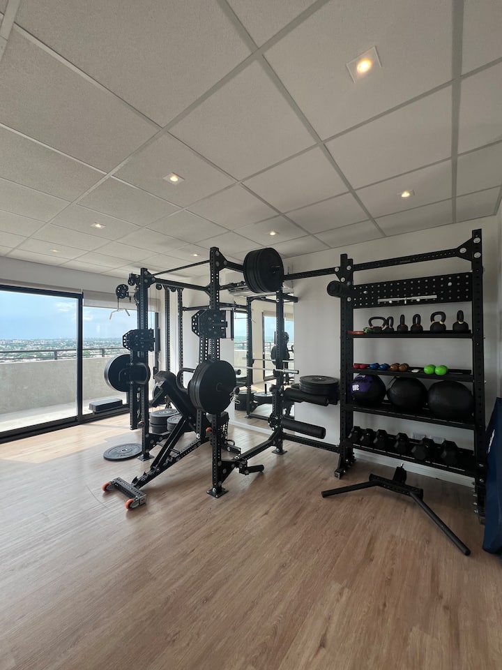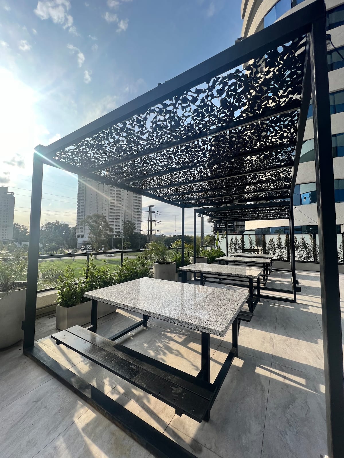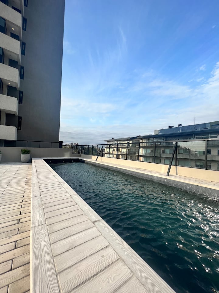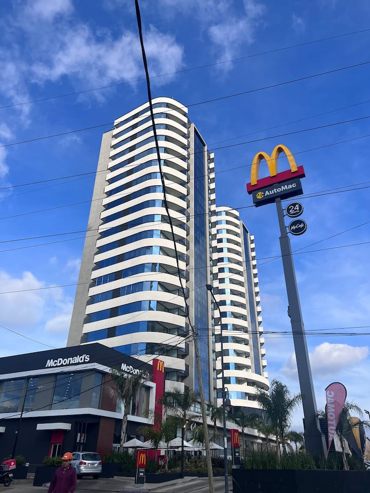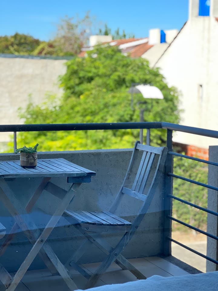 Studio apartment in Tigre with 24-hour security. The building has a multipurpose residents’ lounge for co-working with WiFi, plus a gym and a seasonal pool. The unit includes an extra-large bed, cable TV, WiFi, and kitchen equipment. The listing notes proximity to Buenos Aires by highway and close access to the river and nature.