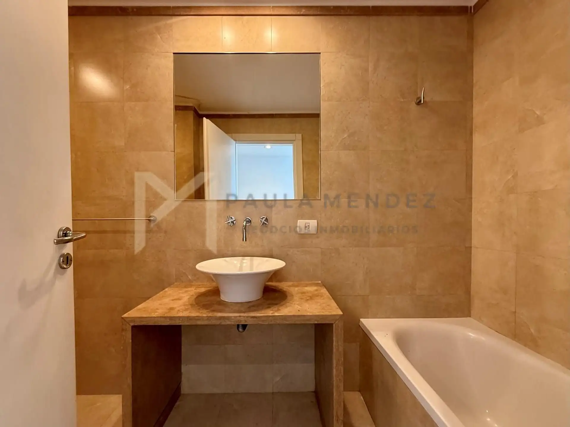 Studio apartment in Terrazas de la Bahía residential complex in Nordelta. It is street-facing toward Nordelta’s city area, with an integrated kitchenette countertop, a full bathroom and a small balcony. The unit has individual dual hot-water radiant heating, one air-conditioning unit, and a semicovered parking space. Building amenities include a pool, laundry and 24-hour security.
