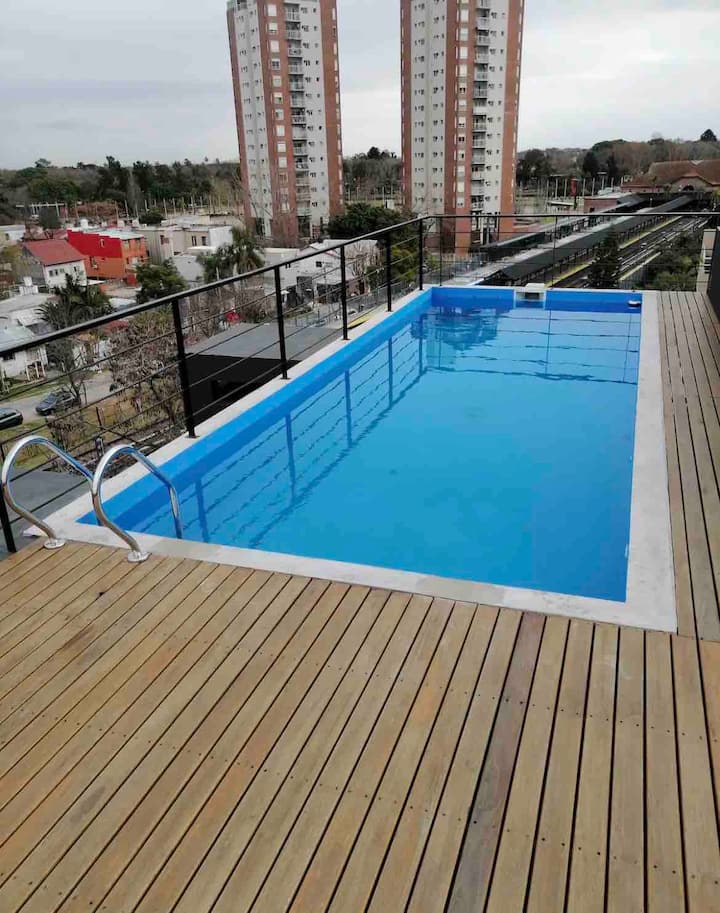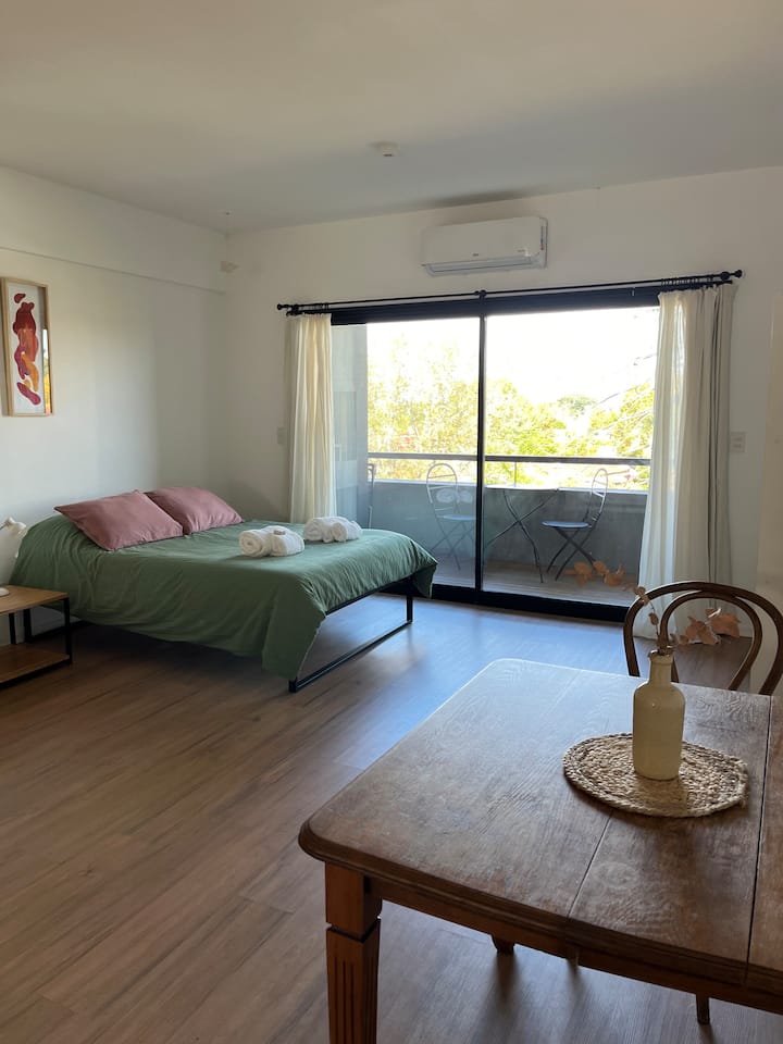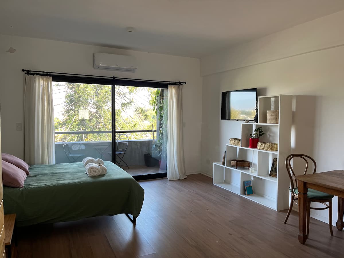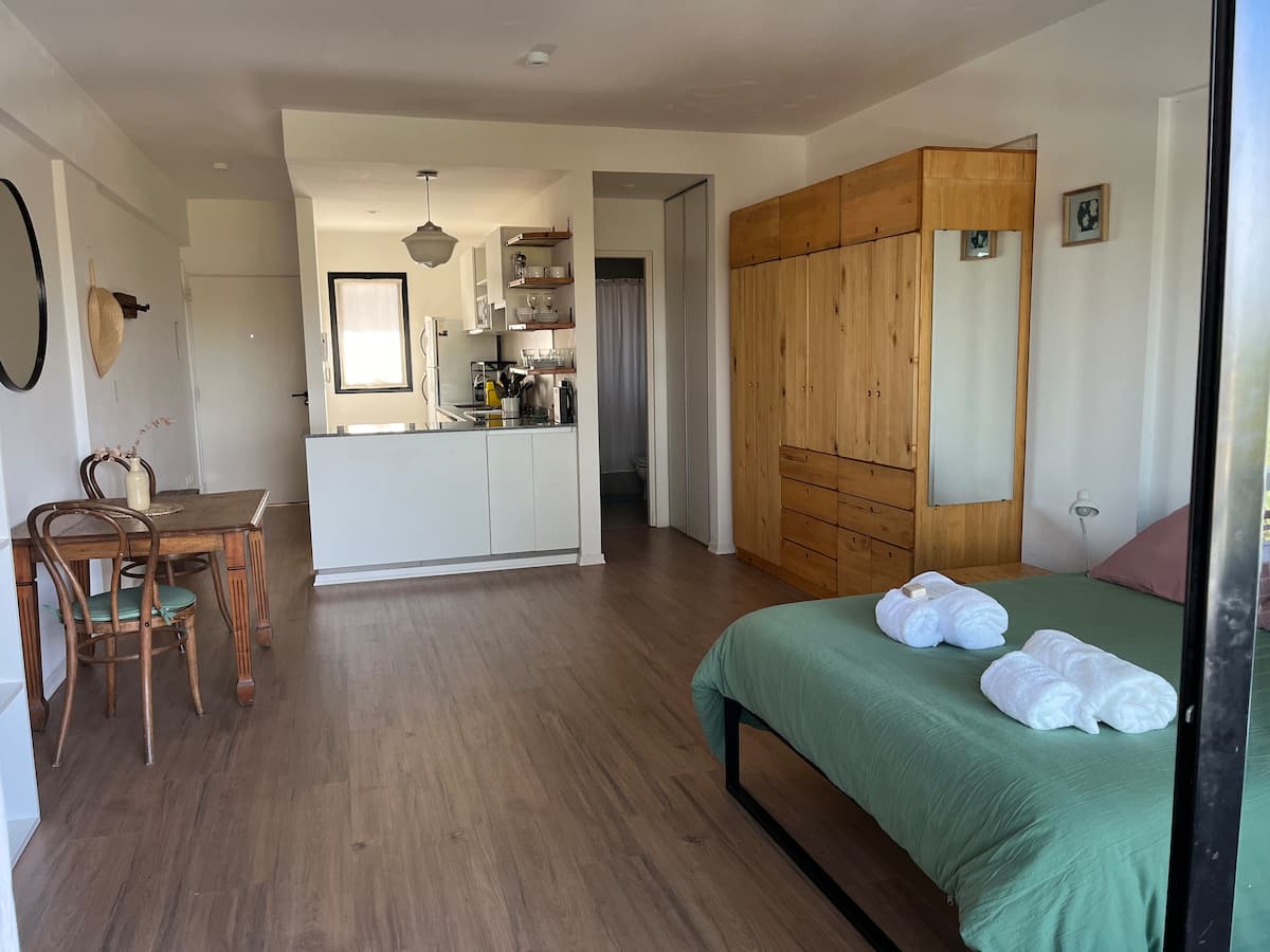 Studio apartment with a private balcony with a grill. It includes a well-equipped kitchen and a large bathroom with a bathtub. The building offers free parking and a rooftop pool with panoramic views; unlimited access to the rooftop pool.