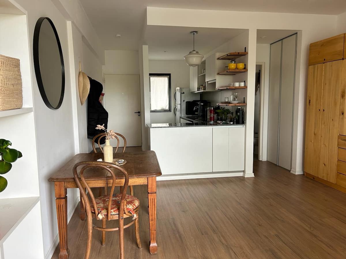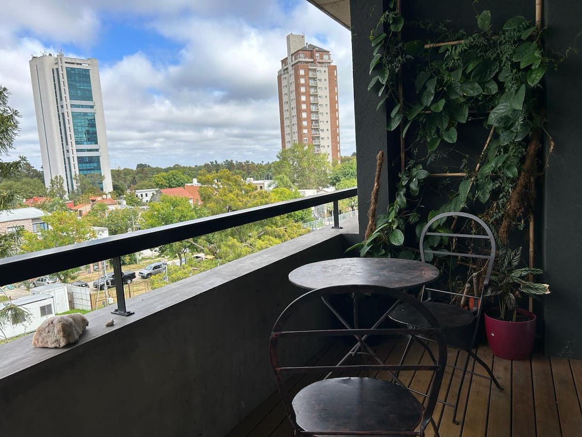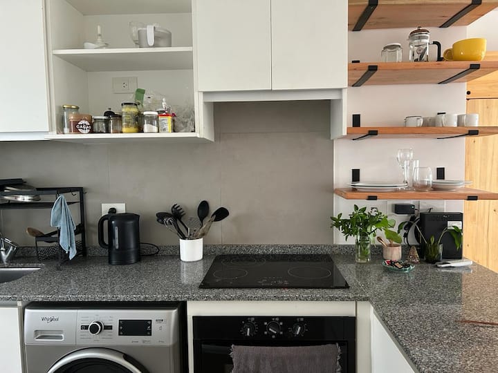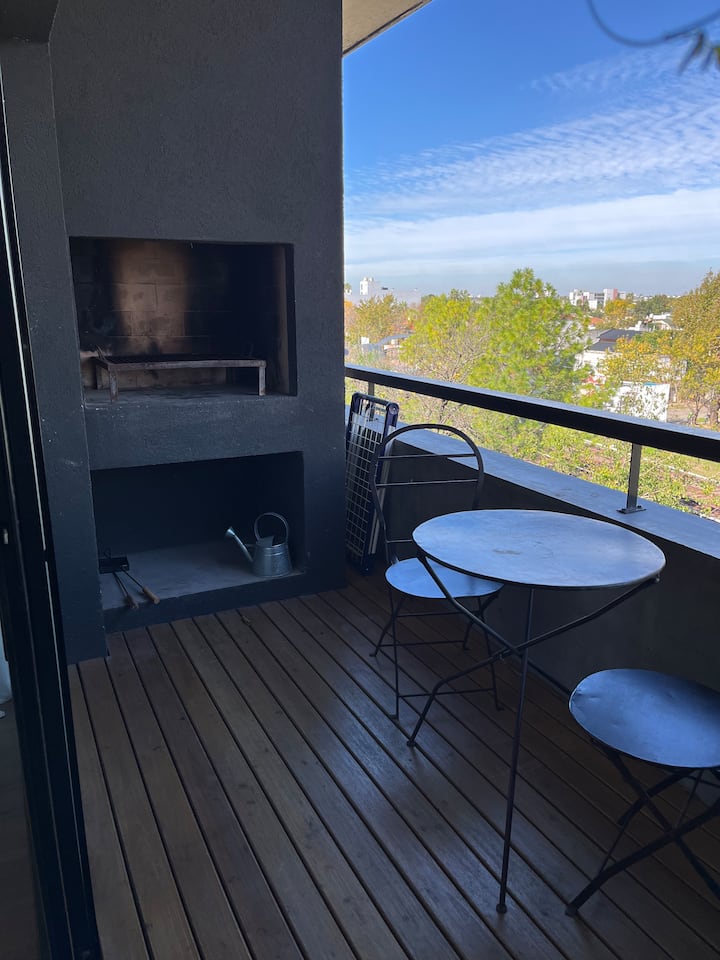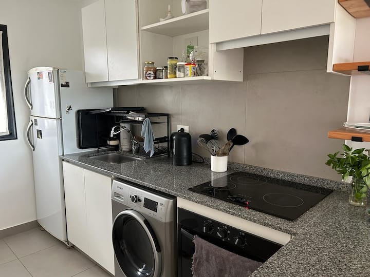 Studio apartment with a private balcony with a grill. It includes a well-equipped kitchen and a large bathroom with a bathtub. The building offers free parking and a rooftop pool with panoramic views; unlimited access to the rooftop pool.