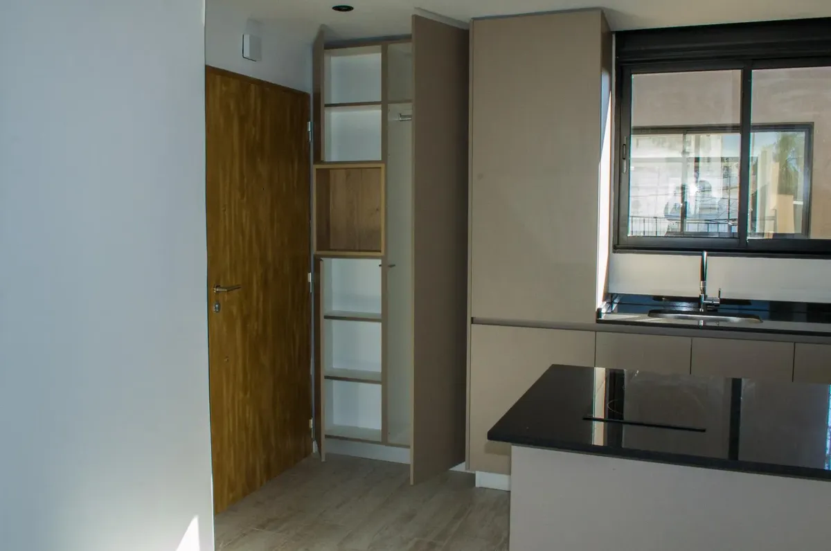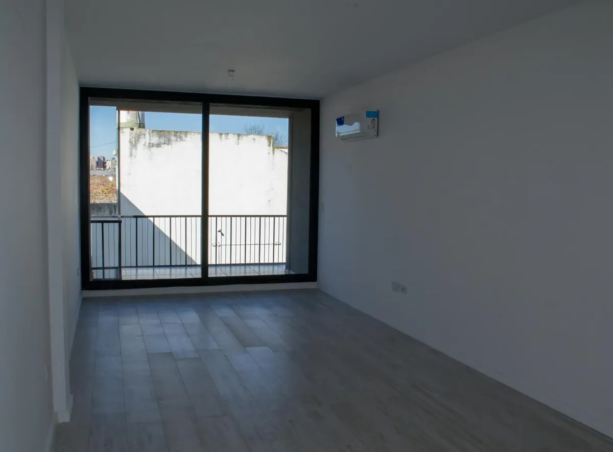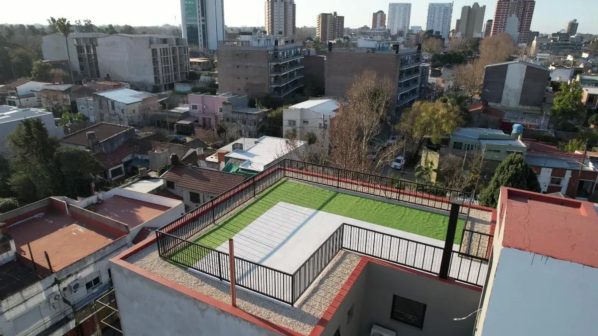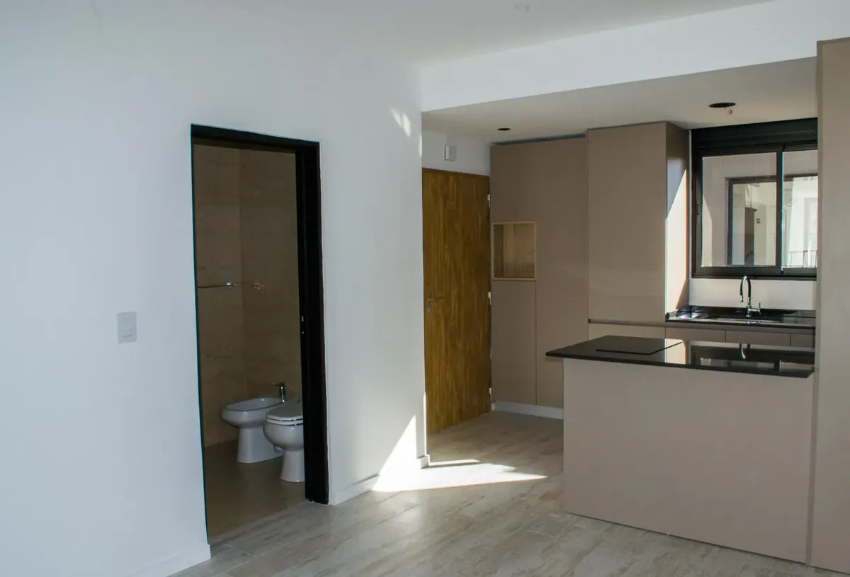 Studio apartment for conventional rent in Tigre, with an included (assigned) parking space. The unit is furnished with a reception closet, a living-dining area with air conditioning (hot/cold) and access to a balcony, an integrated kitchen with a ceramic cooktop and oven, and a full bathroom. Building amenities include a 360° view terrace, pool, and elevator; the building is described as new. Tenant pays utilities including electricity, cable/internet (Wi-Fi), building fees, ABL, and fire insura