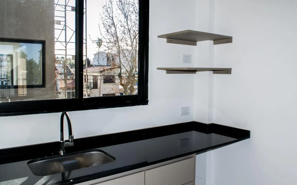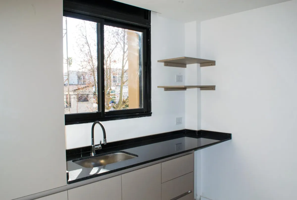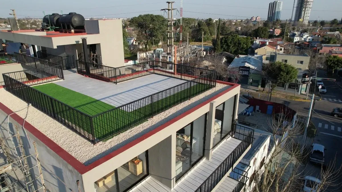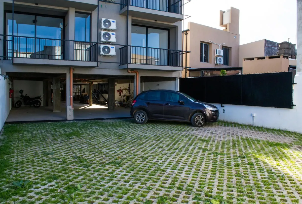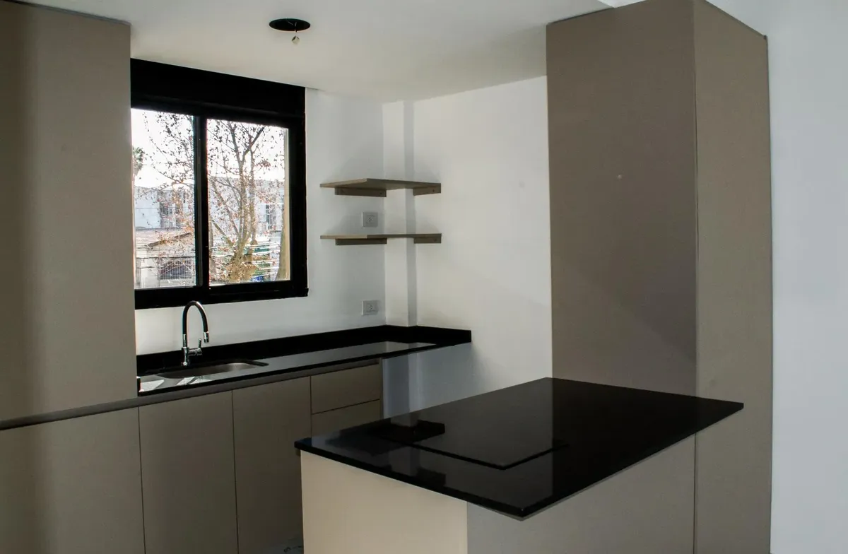 Studio apartment for conventional rent in Tigre, with an included (assigned) parking space. The unit is furnished with a reception closet, a living-dining area with air conditioning (hot/cold) and access to a balcony, an integrated kitchen with a ceramic cooktop and oven, and a full bathroom. Building amenities include a 360° view terrace, pool, and elevator; the building is described as new. Tenant pays utilities including electricity, cable/internet (Wi-Fi), building fees, ABL, and fire insura