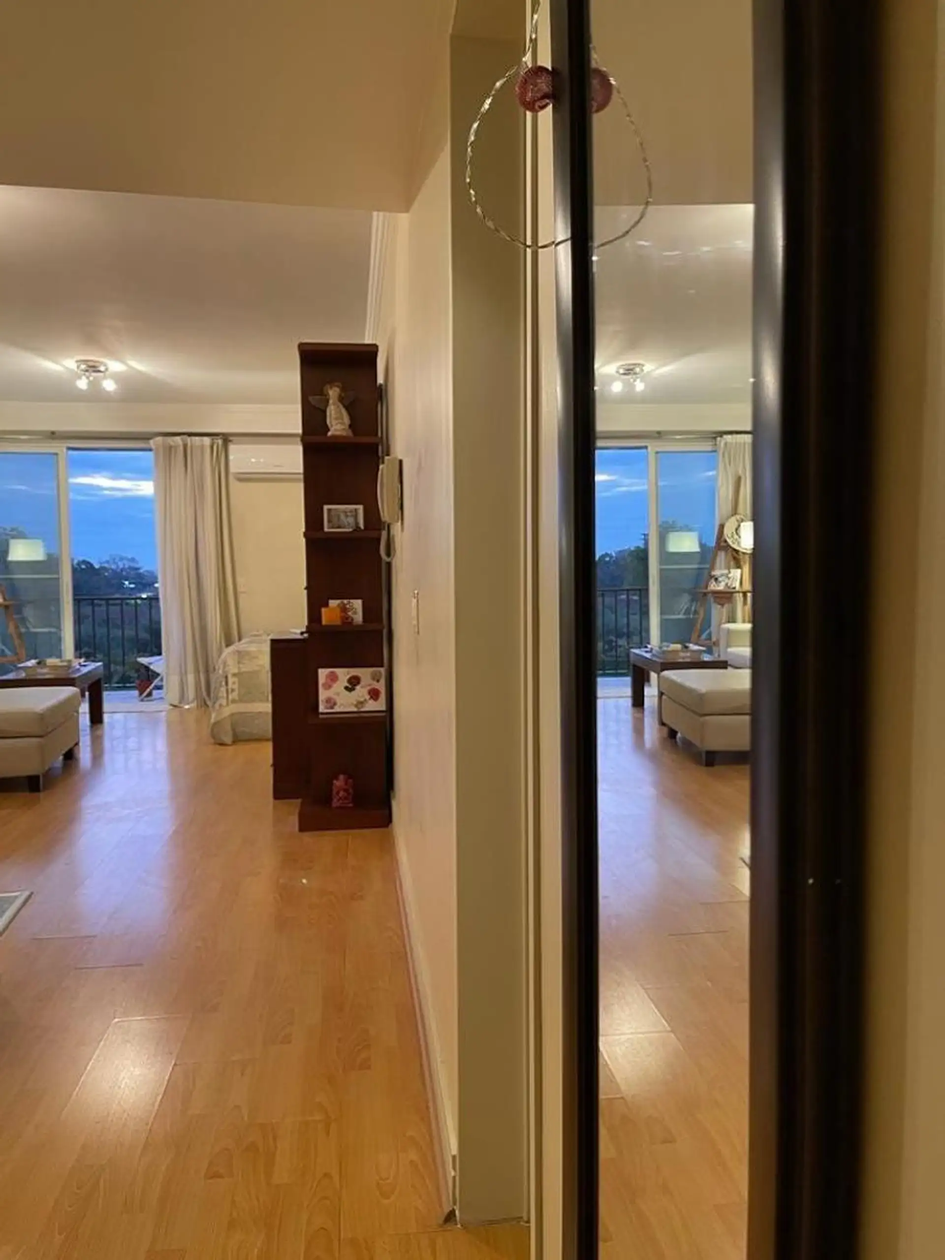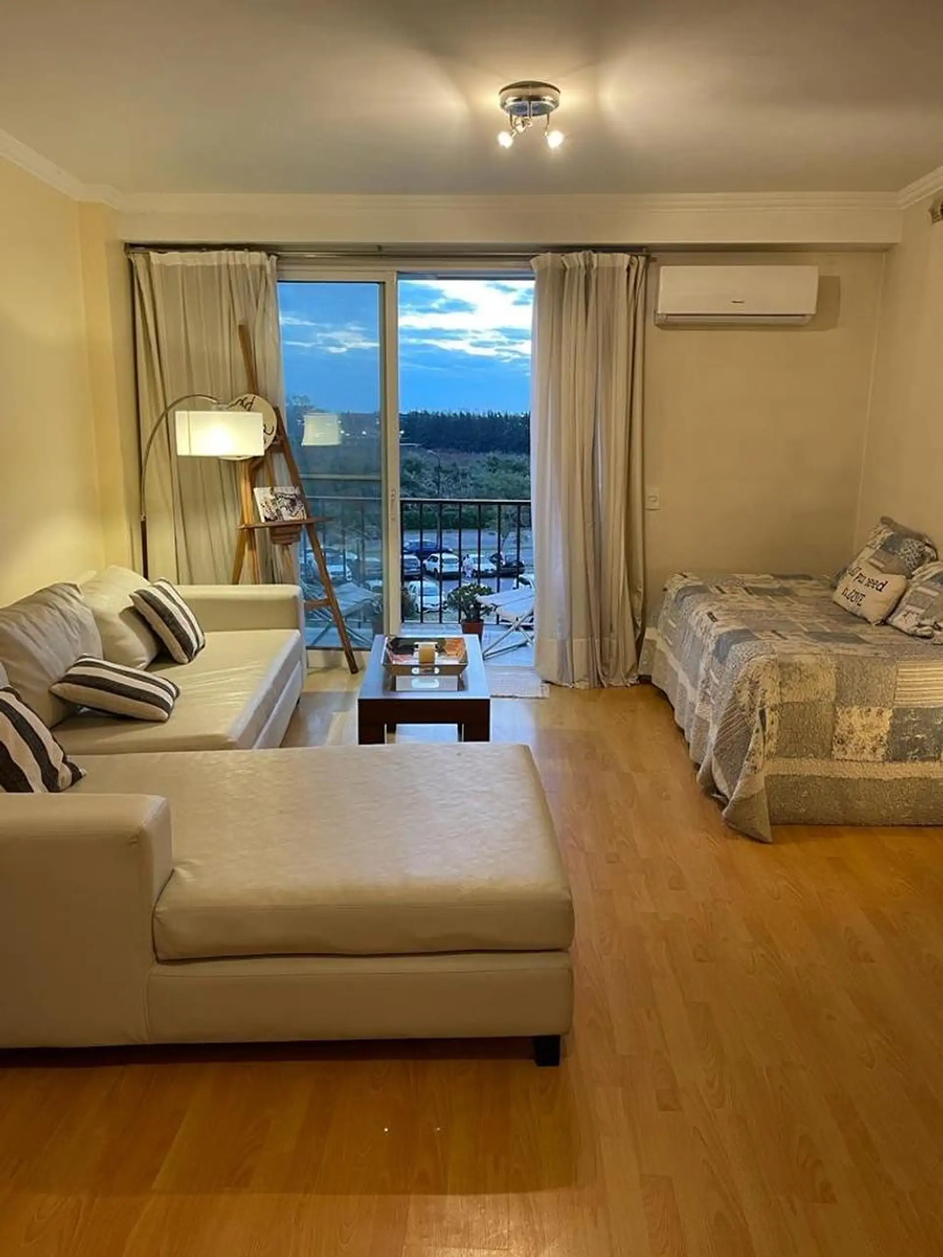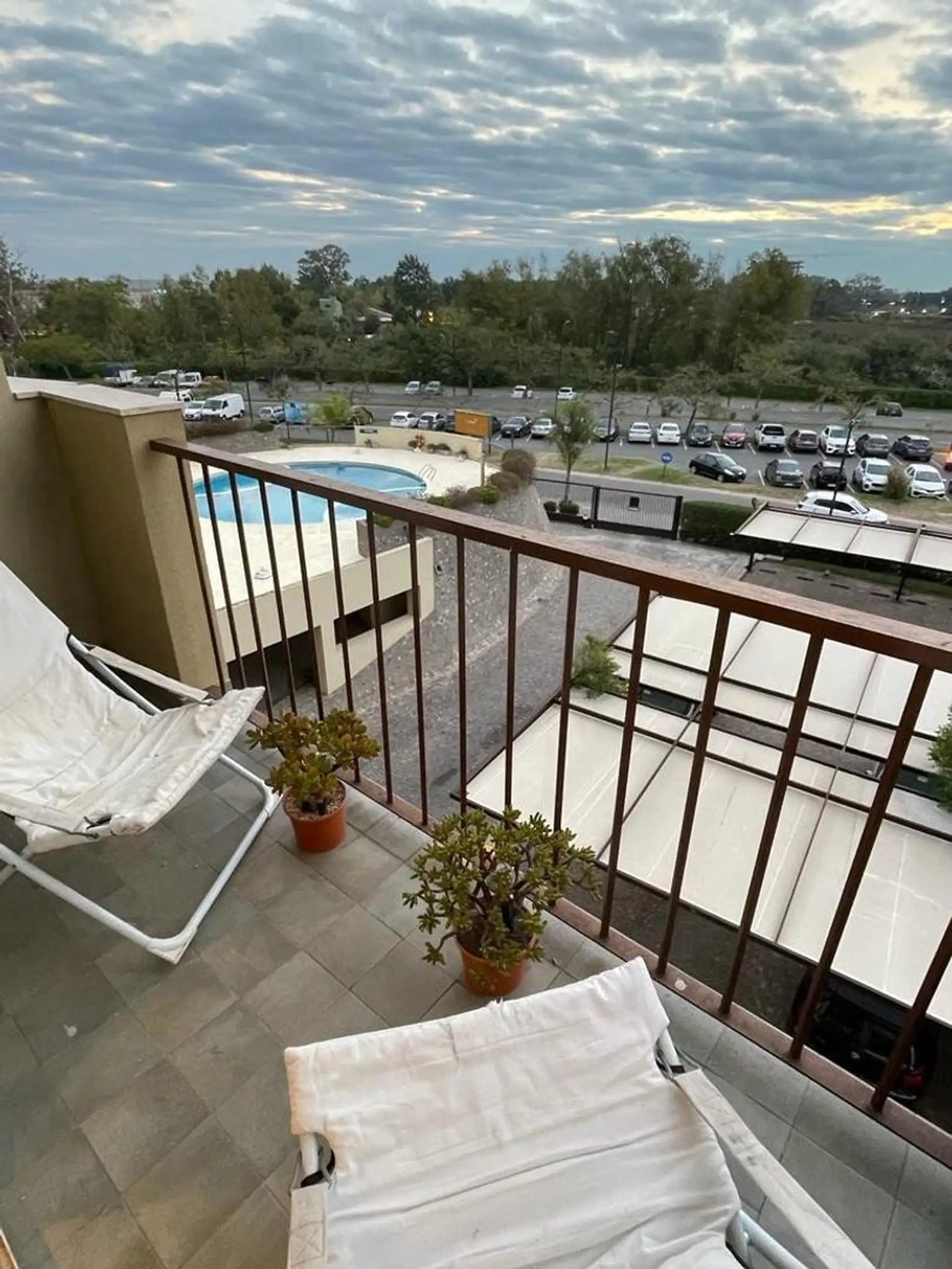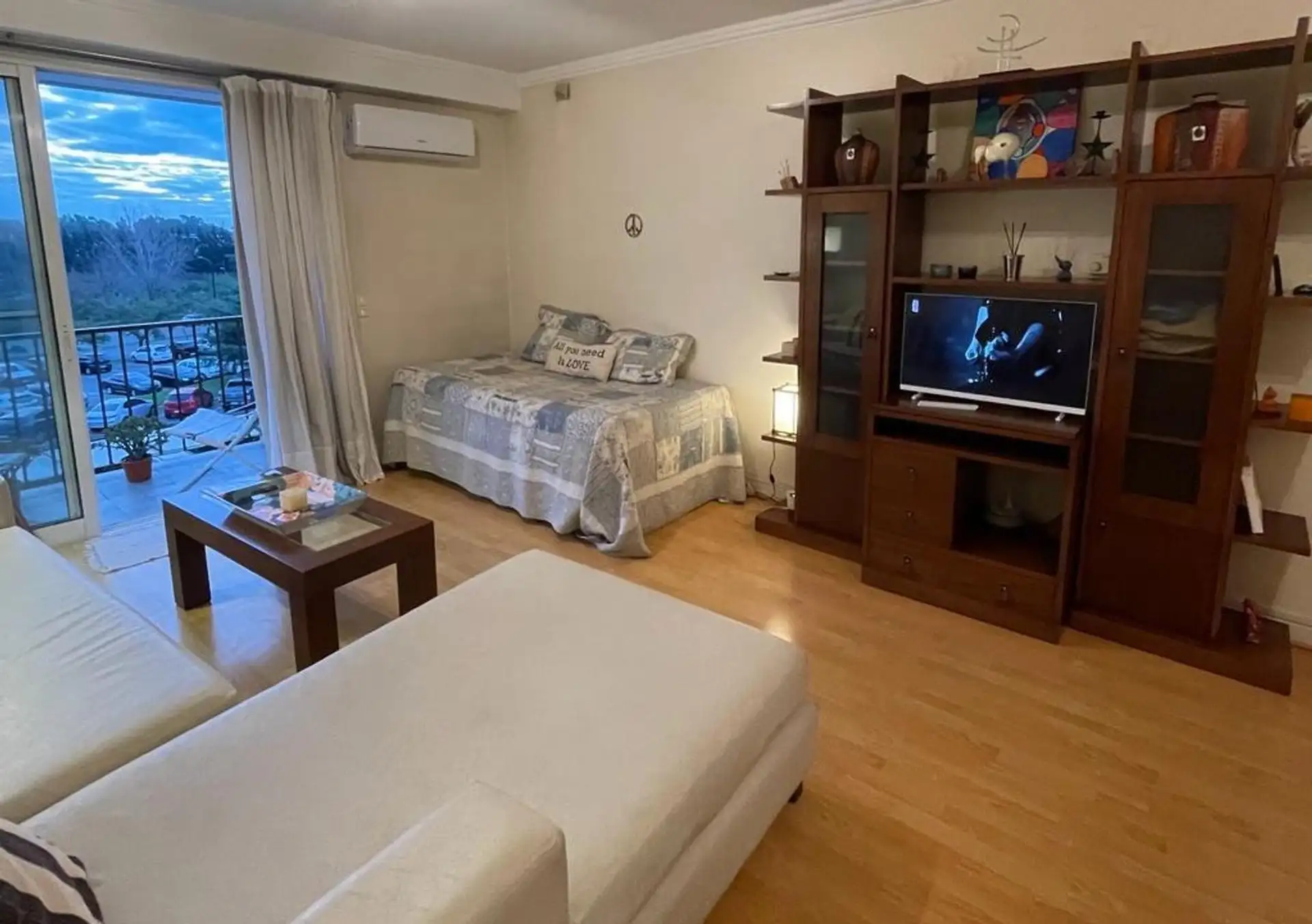 Furnished studio apartment with a balcony, courtyard-facing (contrafrente) with open views, in Terrazas de la Bahía, Bahia Grande, Nordelta, Tigre. The unit is suitable for professional use and has floating wood floors, an open-plan kitchen, a full bathroom clad in travertine marble, and a reception closet. The complex has a pool and laundry, with sewer and gas services available.