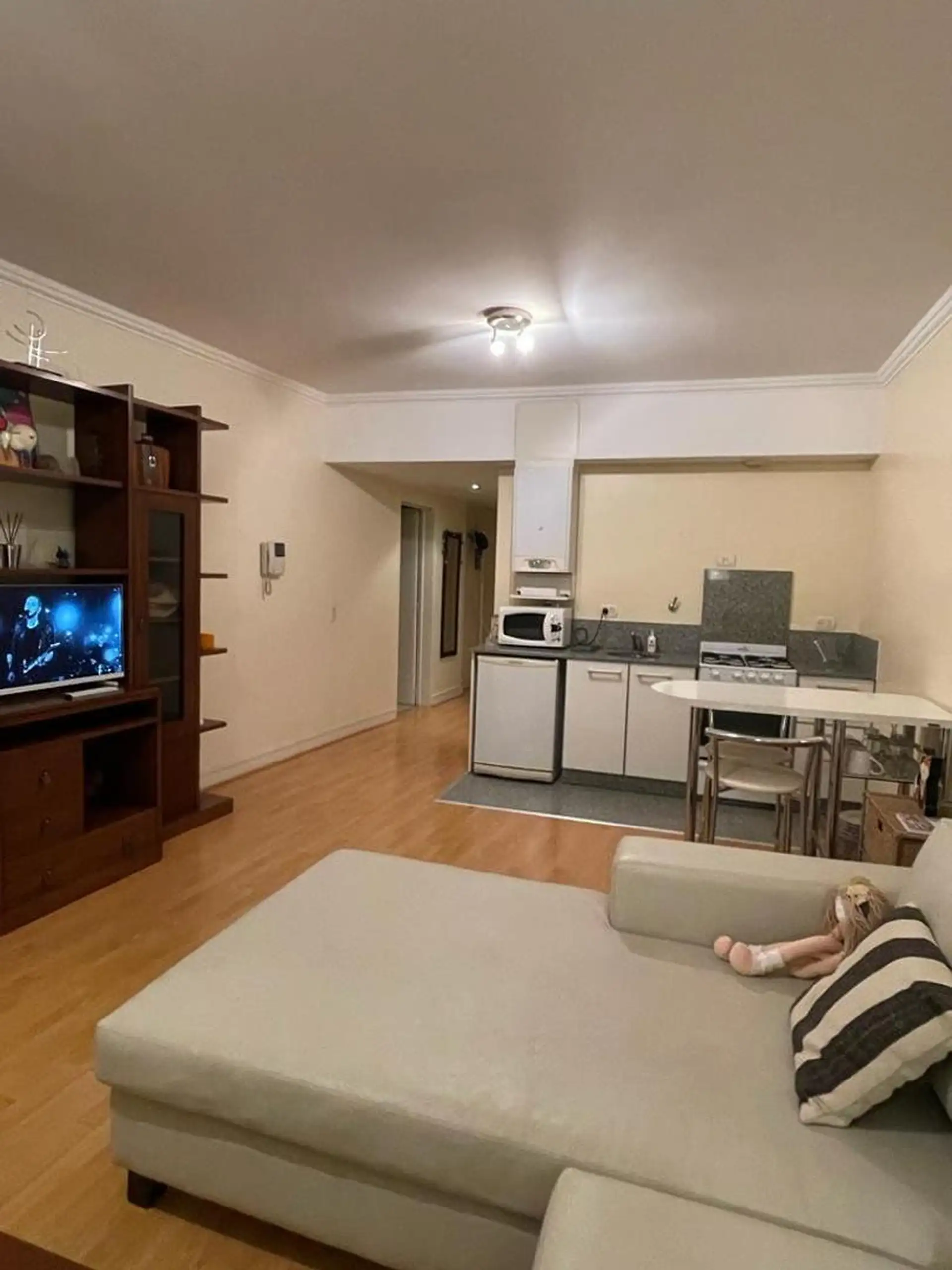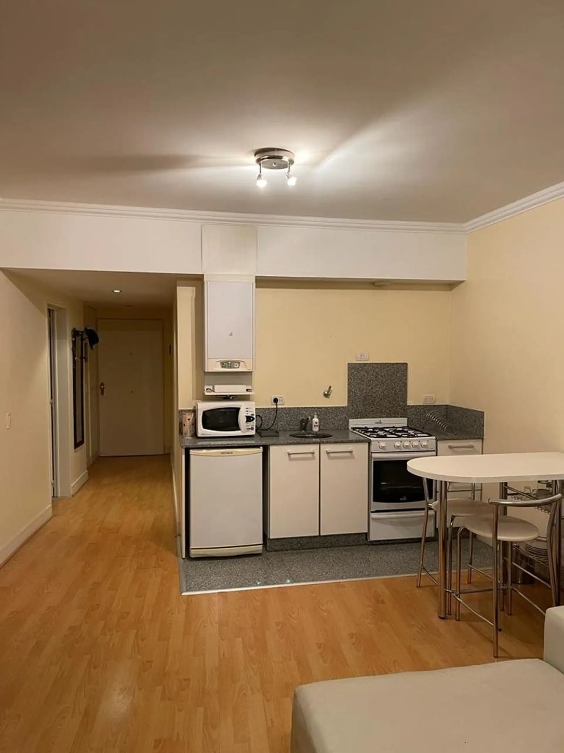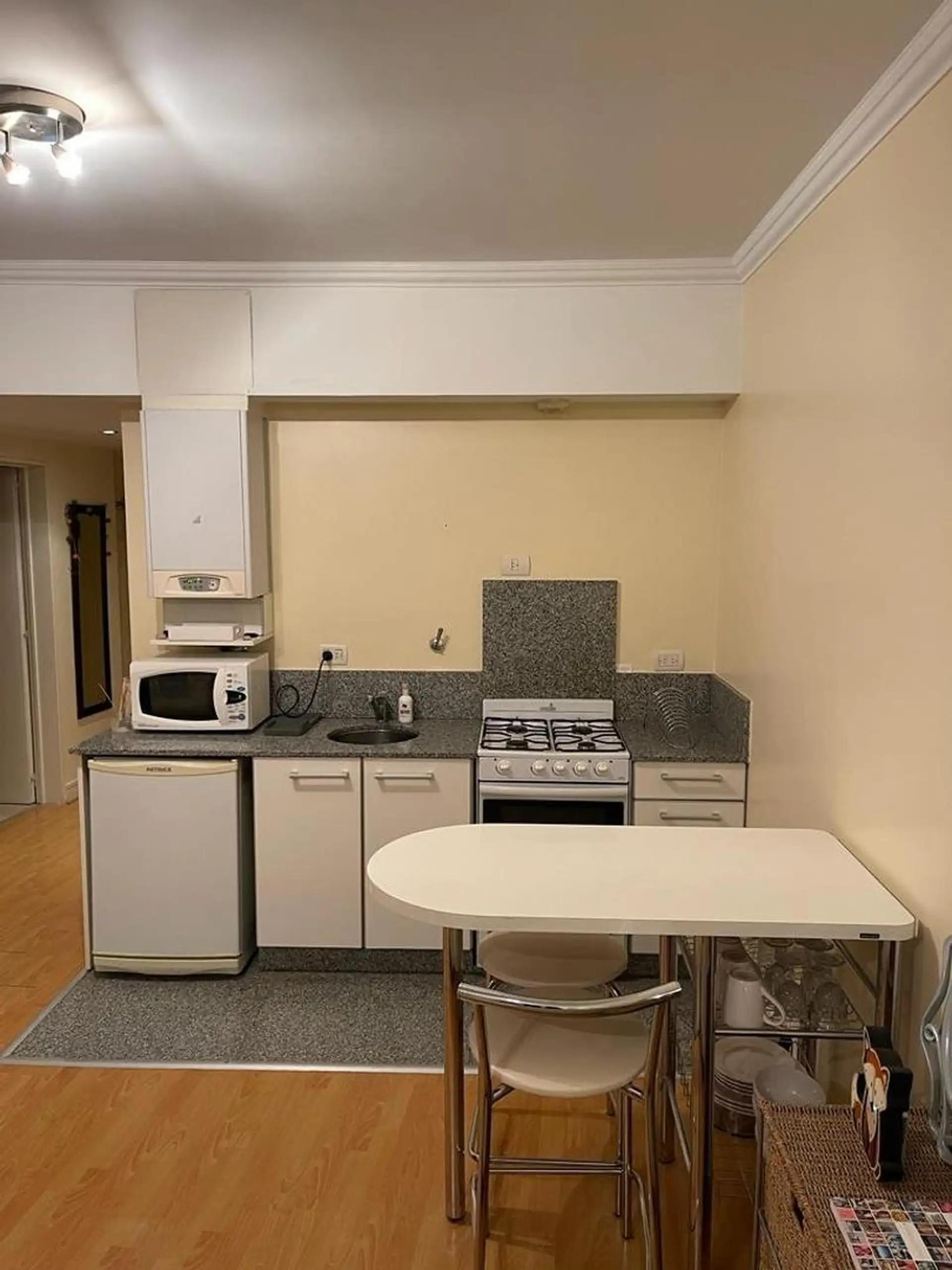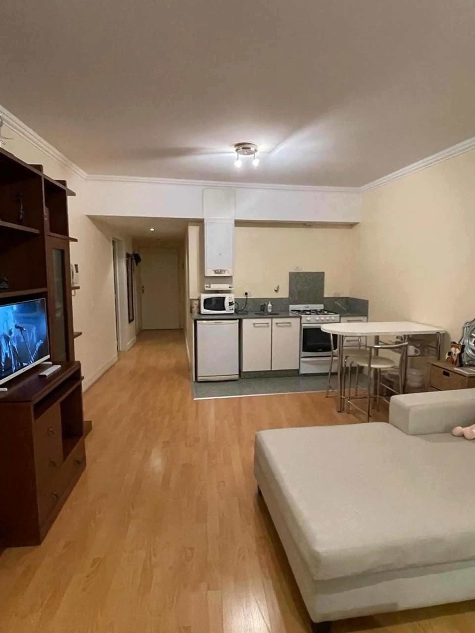 Furnished studio apartment with a balcony, courtyard-facing (contrafrente) with open views, in Terrazas de la Bahía, Bahia Grande, Nordelta, Tigre. The unit is suitable for professional use and has floating wood floors, an open-plan kitchen, a full bathroom clad in travertine marble, and a reception closet. The complex has a pool and laundry, with sewer and gas services available.