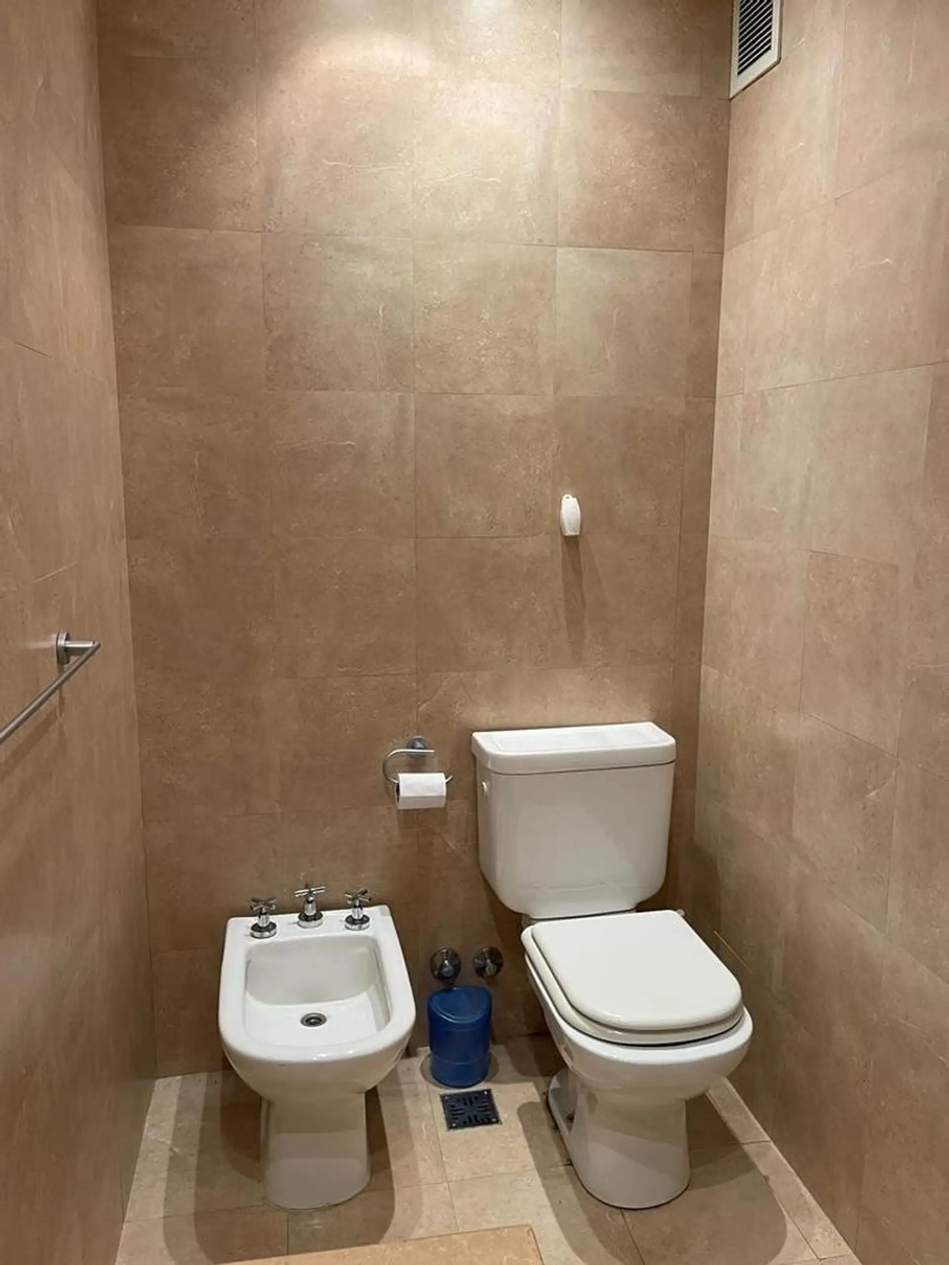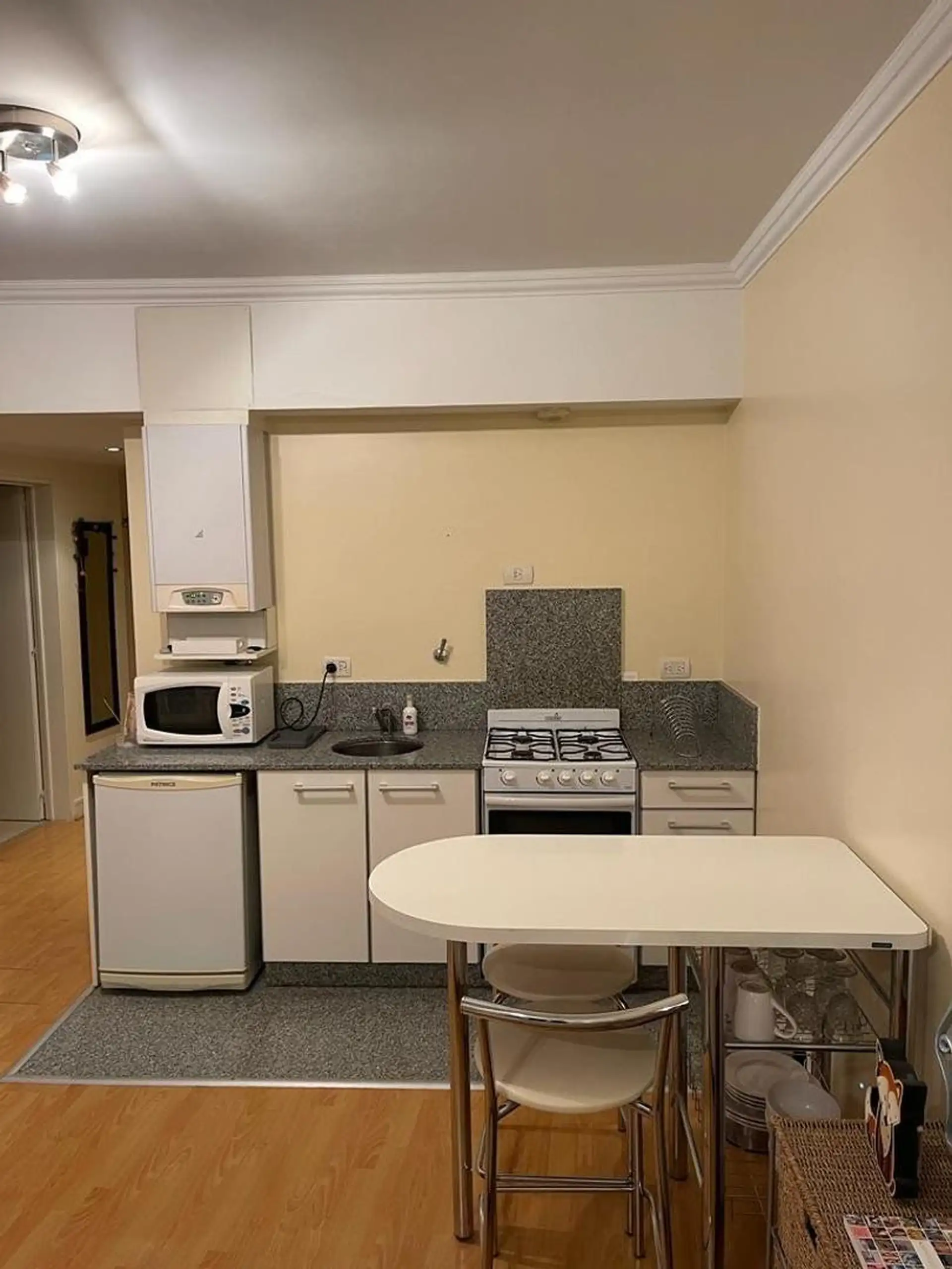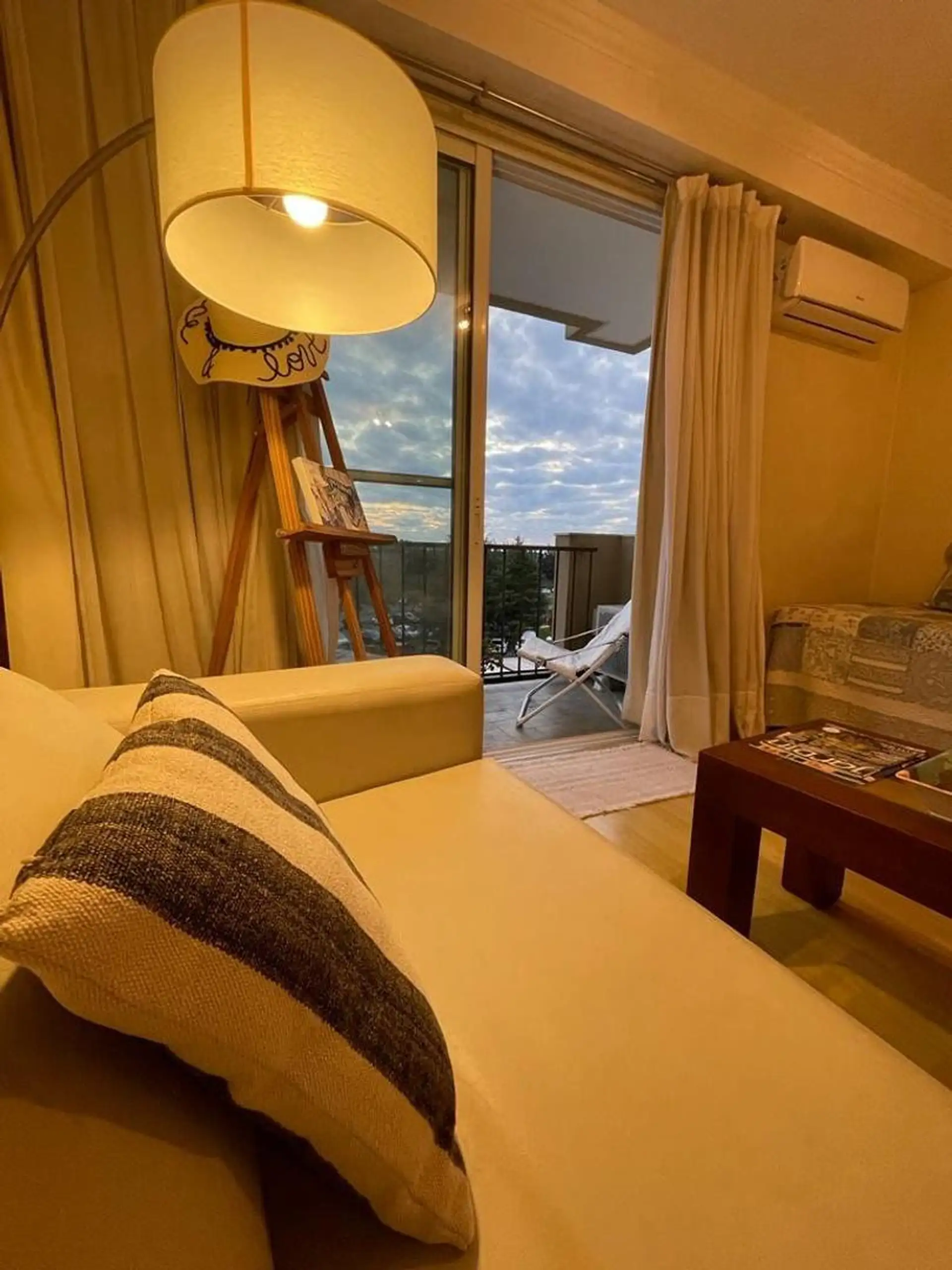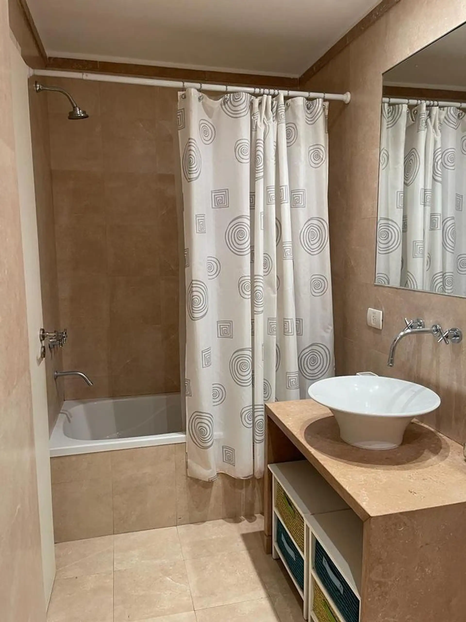 Furnished studio apartment with a balcony, courtyard-facing (contrafrente) with open views, in Terrazas de la Bahía, Bahia Grande, Nordelta, Tigre. The unit is suitable for professional use and has floating wood floors, an open-plan kitchen, a full bathroom clad in travertine marble, and a reception closet. The complex has a pool and laundry, with sewer and gas services available.