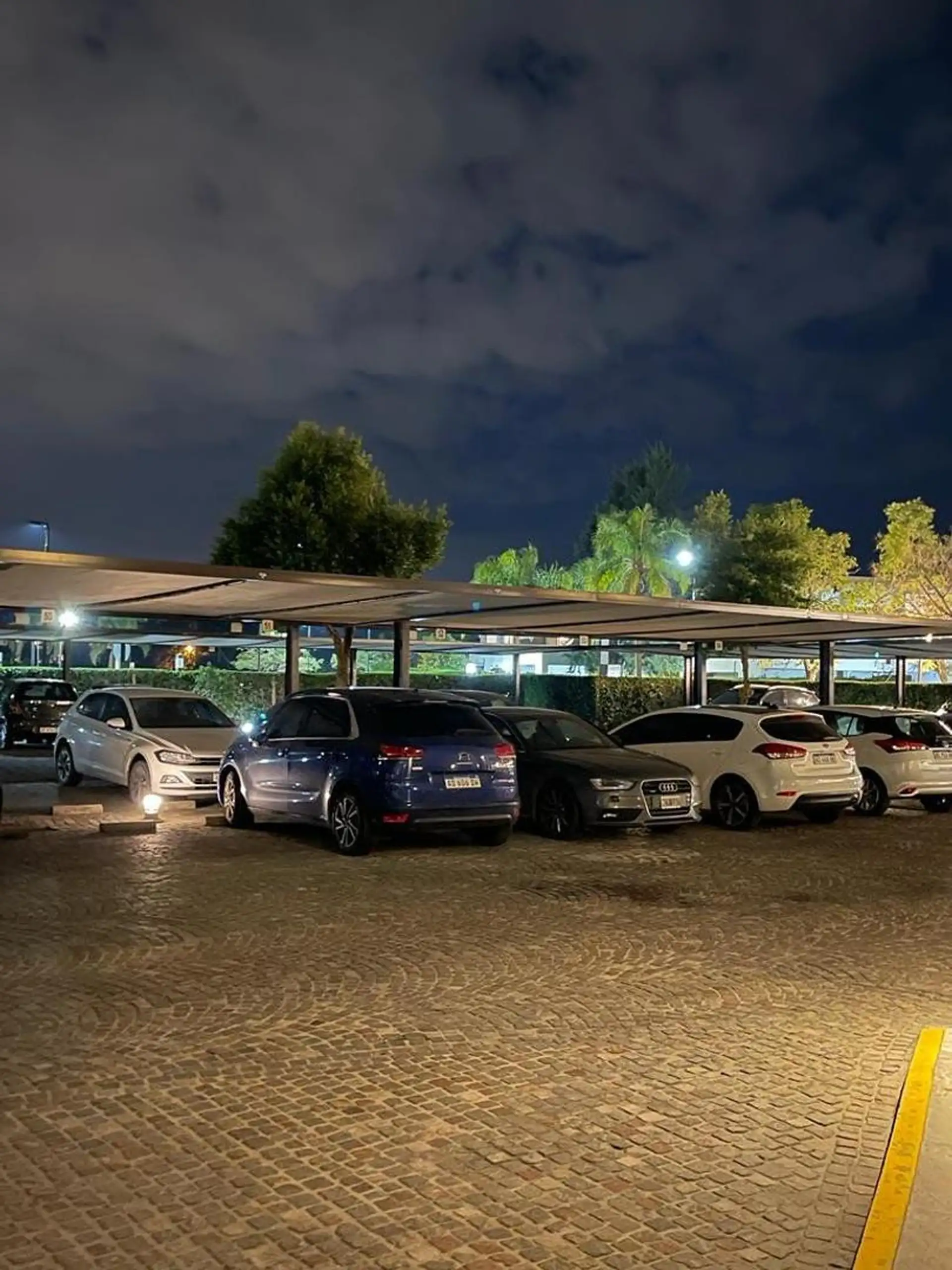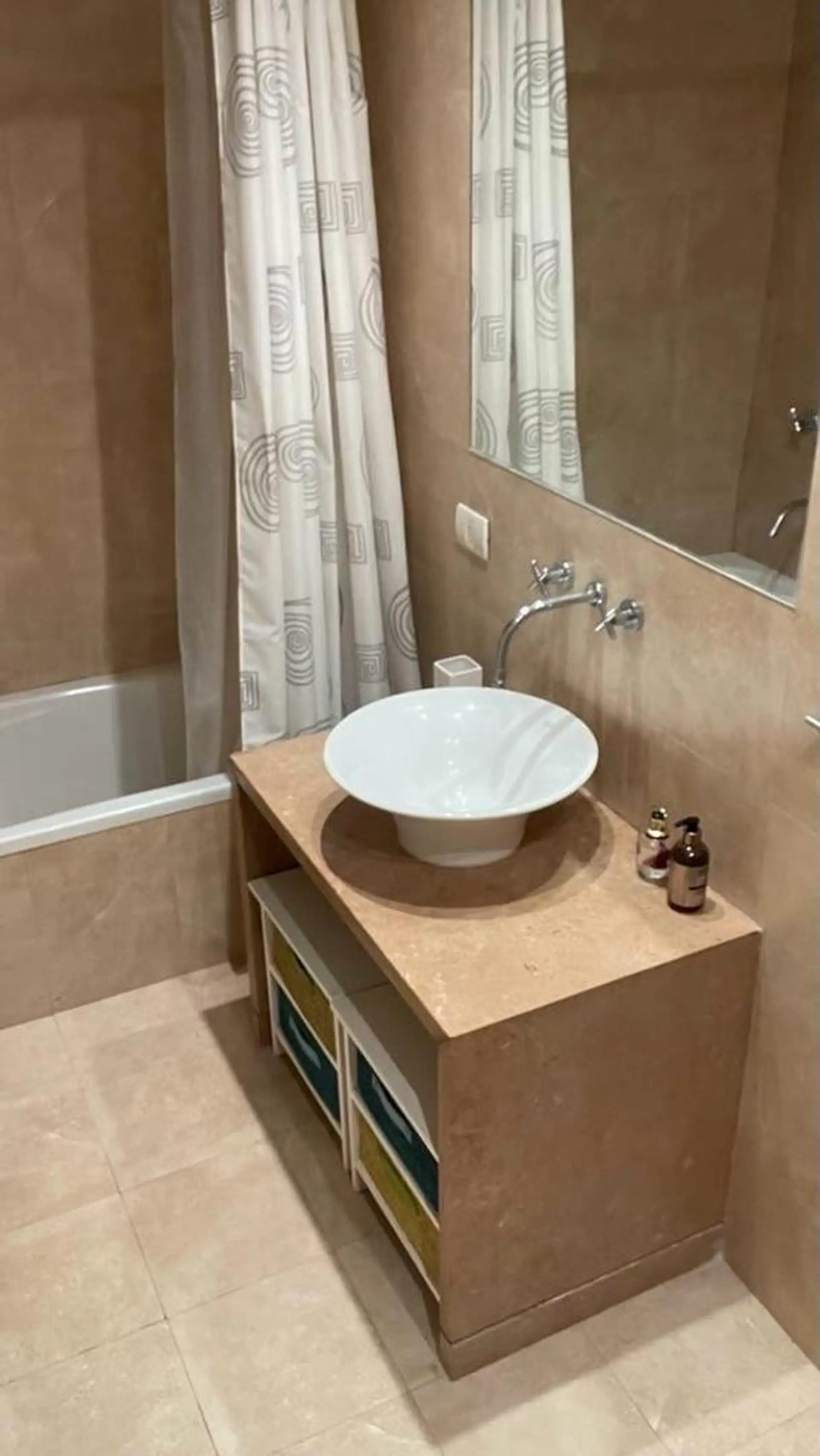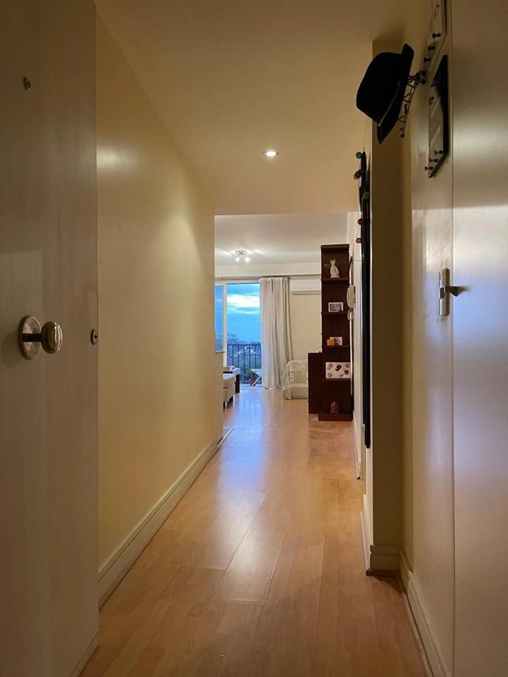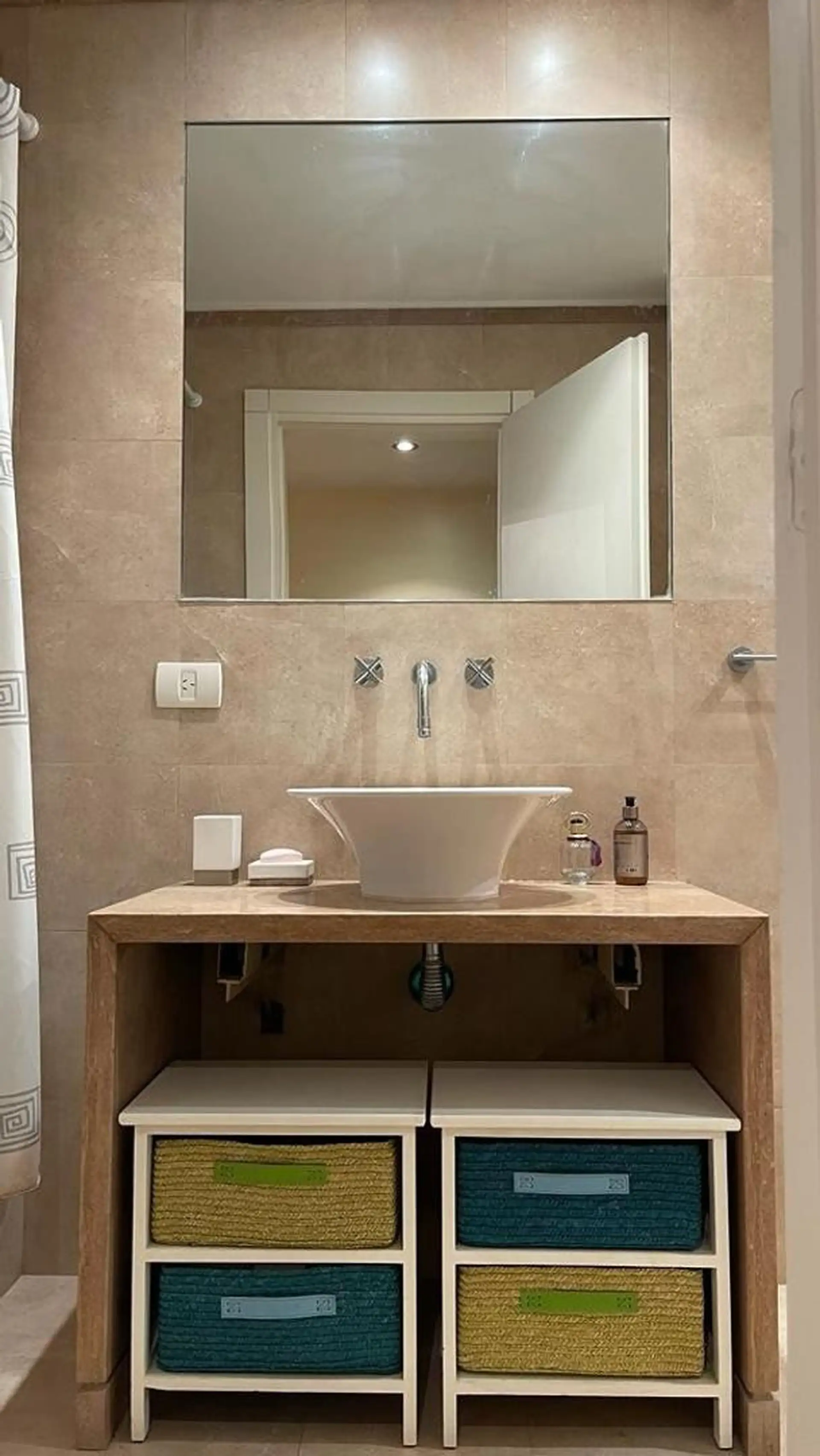 Furnished studio apartment with a balcony, courtyard-facing (contrafrente) with open views, in Terrazas de la Bahía, Bahia Grande, Nordelta, Tigre. The unit is suitable for professional use and has floating wood floors, an open-plan kitchen, a full bathroom clad in travertine marble, and a reception closet. The complex has a pool and laundry, with sewer and gas services available.