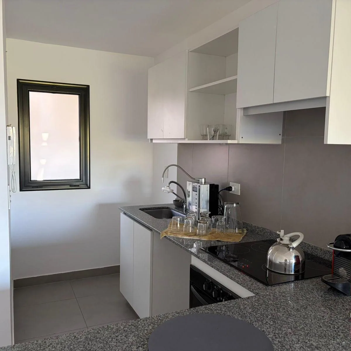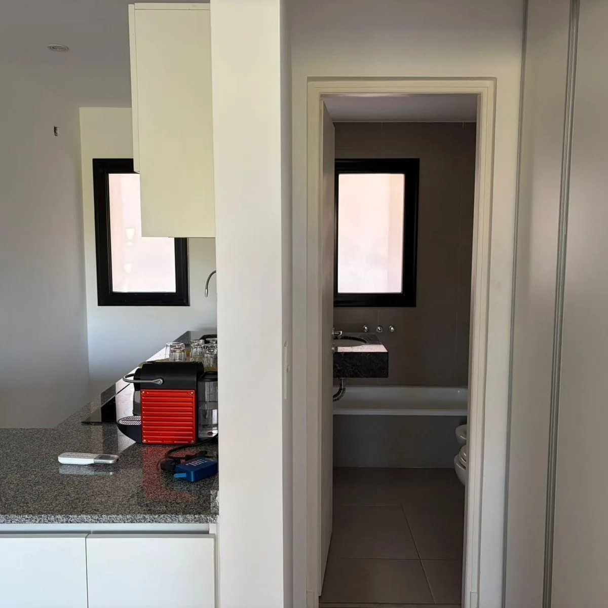 Studio apartment with a balcony, featuring a full bathroom and a kitchen. The building includes a gym and a communal room/coworking space, with a grill and pool on the top floor. Rental term is 2 years with quarterly rent adjustments based on IPCA, and pets are accepted.