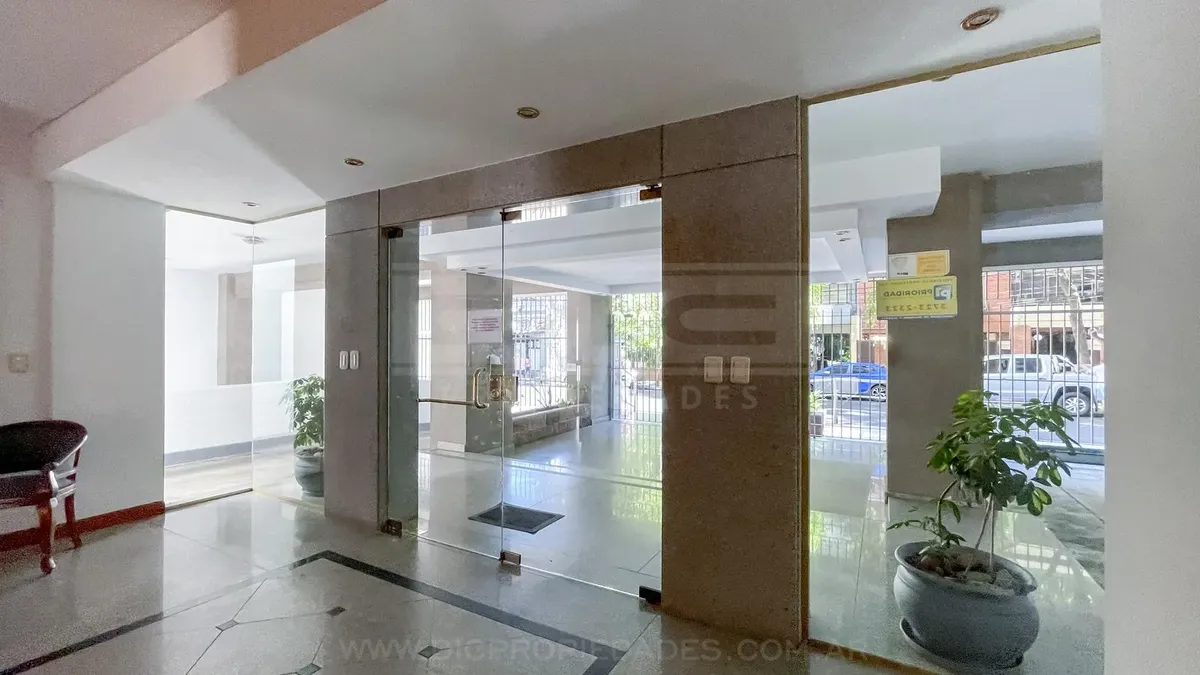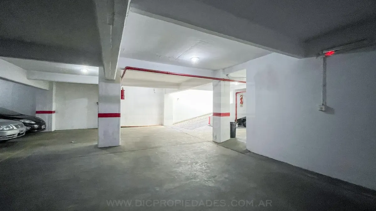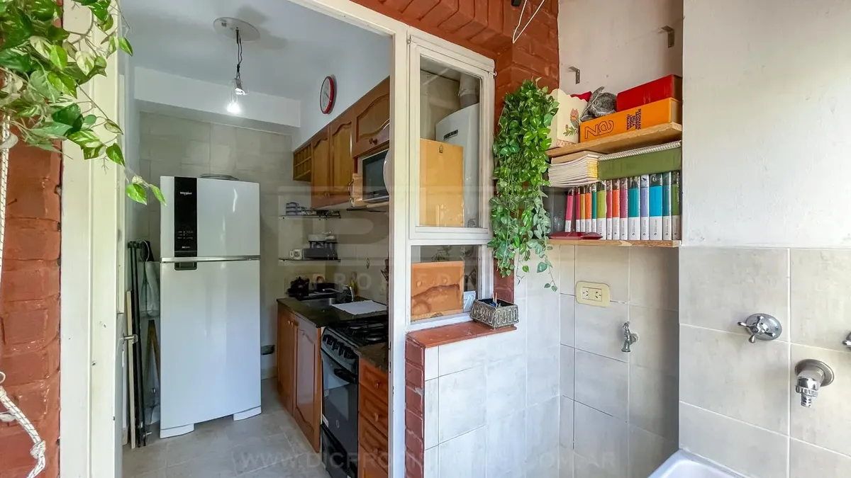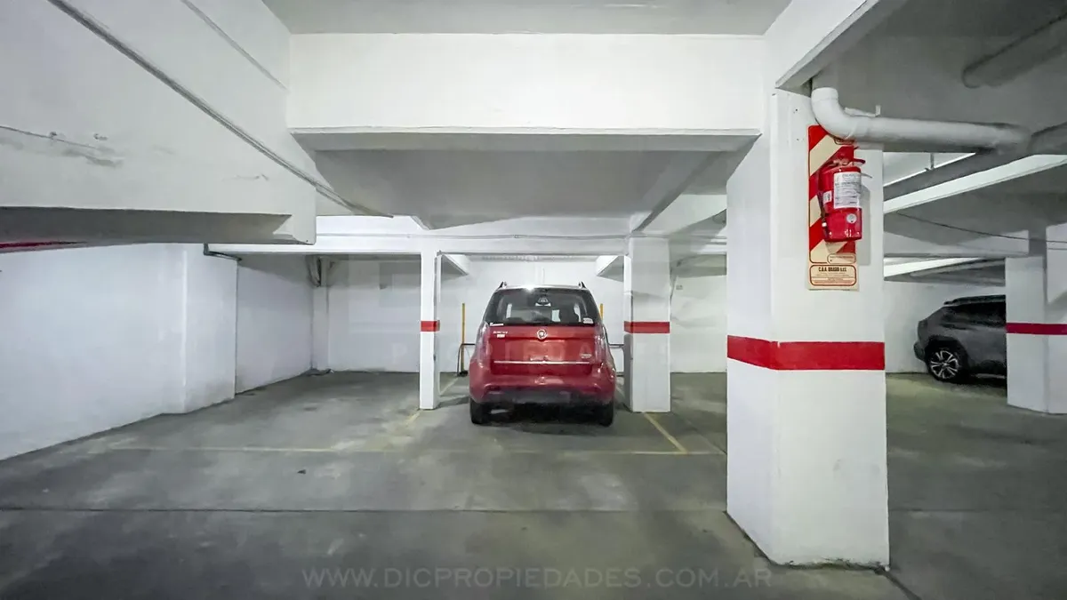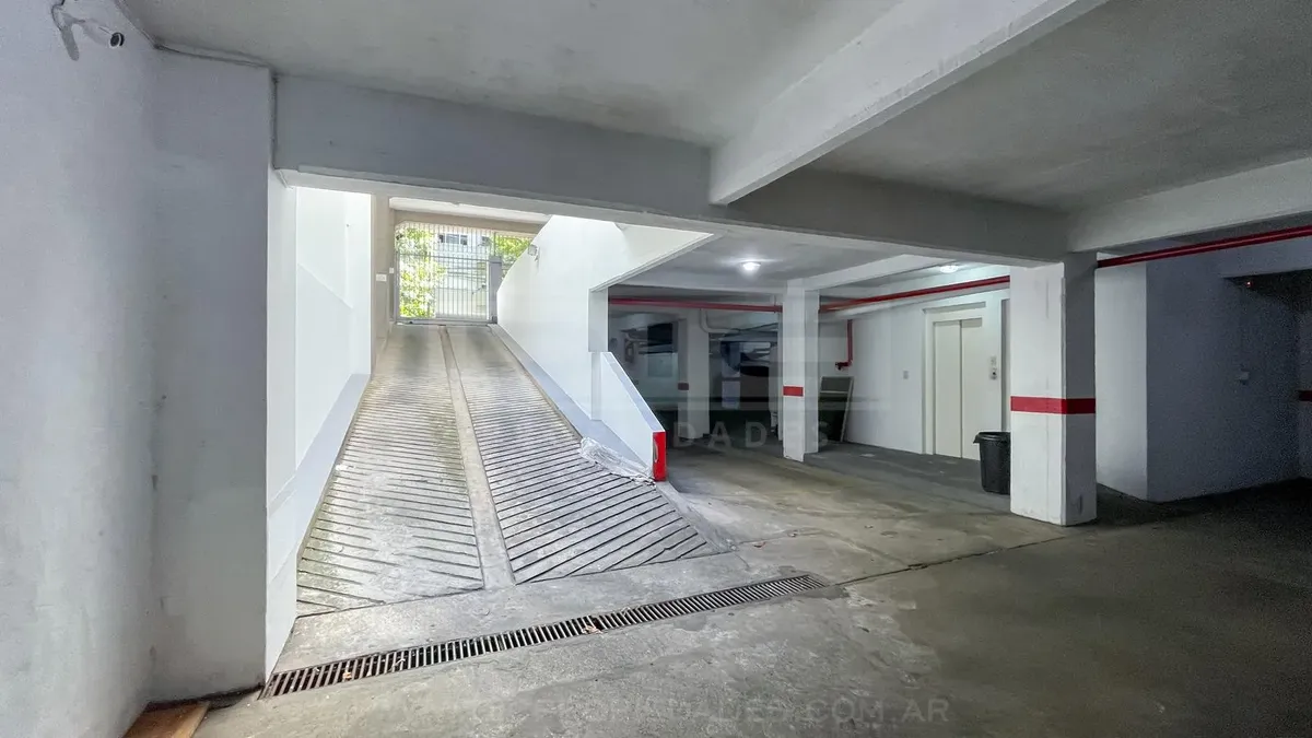 Studio apartment in Olivos with covered parking. Located on the courtyard-facing side (contrafrente). Includes a separate, fully equipped kitchen, laundry area (lavadero), and bathroom. The listing notes that the unit can also be rented without parking, subject to an updated price.