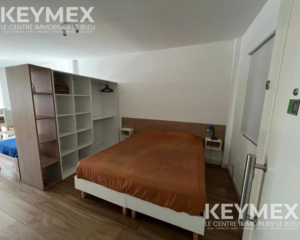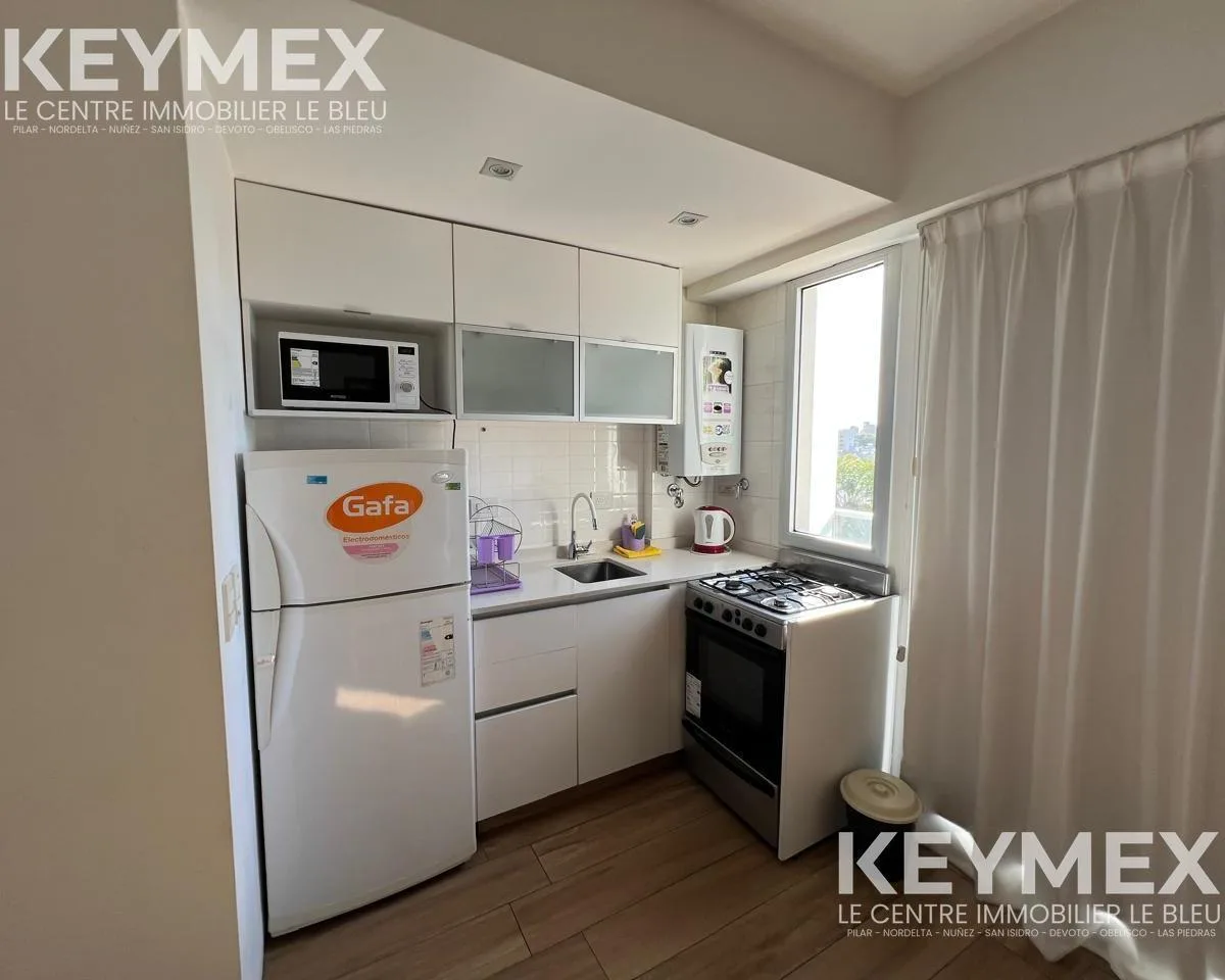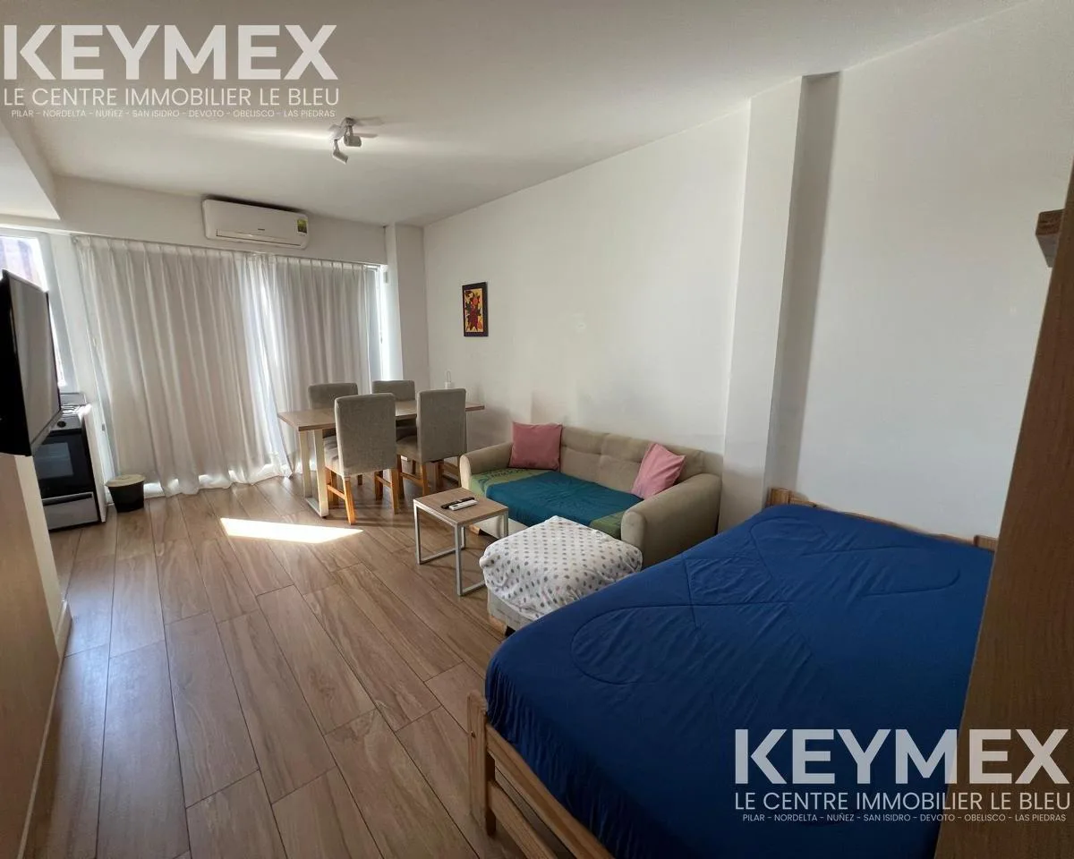 Studio apartment for rent in Villa Crespo, furnished. It includes a 2-plaza bed, living area, dining/kitchen table with chairs, storage unit with dividers and shelves, fridge with freezer, microwave, 40-inch plasma TV, and an electric kettle. The kitchen has 4-burner stove with oven and gas water heater with push-button control; windows have blackout blinds and/or blackout curtains. The bathroom is complete with a bathtub and bidet. Building amenities on the 7th floor include a communal room wit