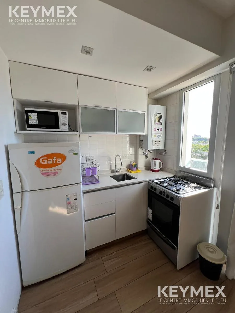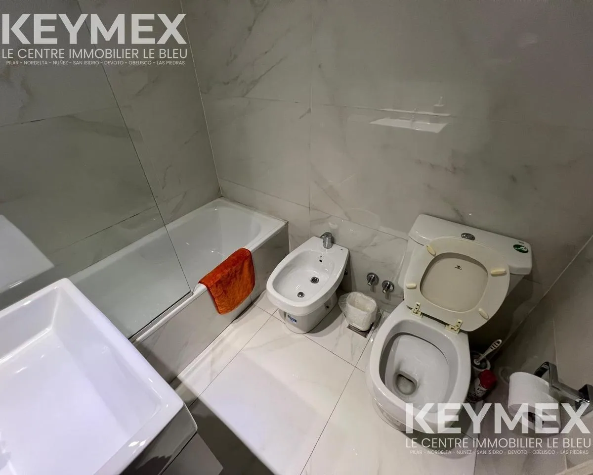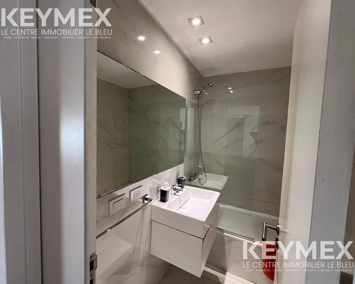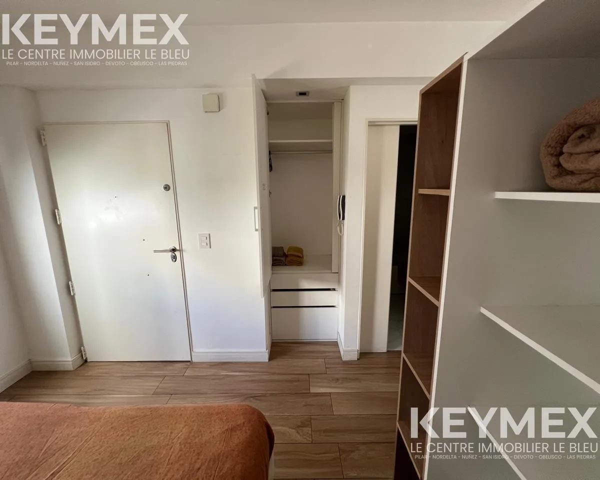 Studio apartment for rent in Villa Crespo, furnished. It includes a 2-plaza bed, living area, dining/kitchen table with chairs, storage unit with dividers and shelves, fridge with freezer, microwave, 40-inch plasma TV, and an electric kettle. The kitchen has 4-burner stove with oven and gas water heater with push-button control; windows have blackout blinds and/or blackout curtains. The bathroom is complete with a bathtub and bidet. Building amenities on the 7th floor include a communal room wit