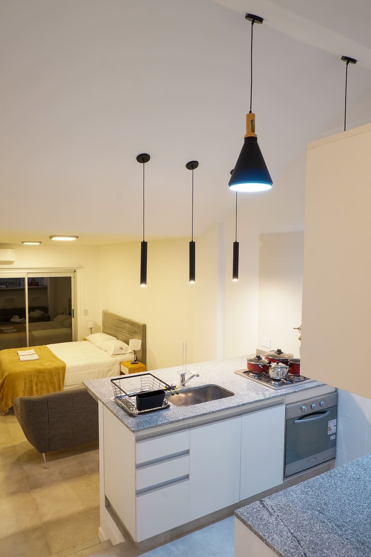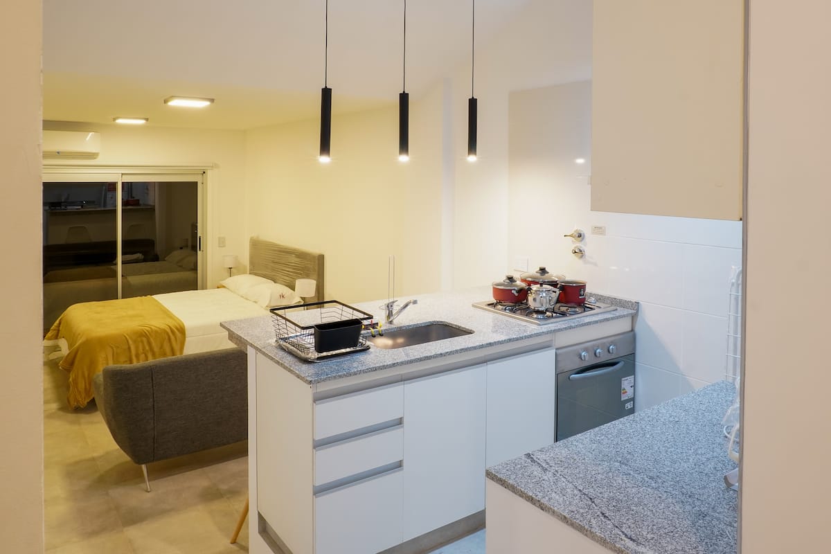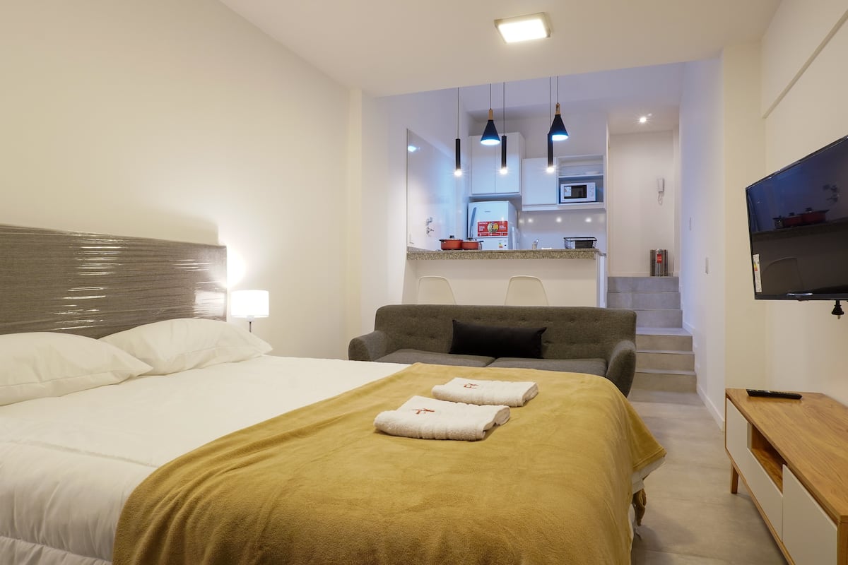 Studio apartment of 31 m² with a 4 m² balcony in Villa del Parque. The kitchen has a fridge, oven, microwave and coffee maker. It includes a hair dryer, washing machine, hot air conditioning, TV, and a queen double bed. Free Wi‑Fi is available.
