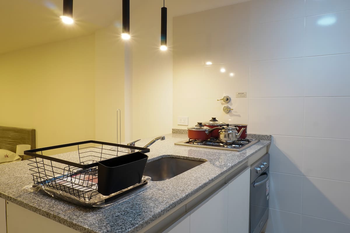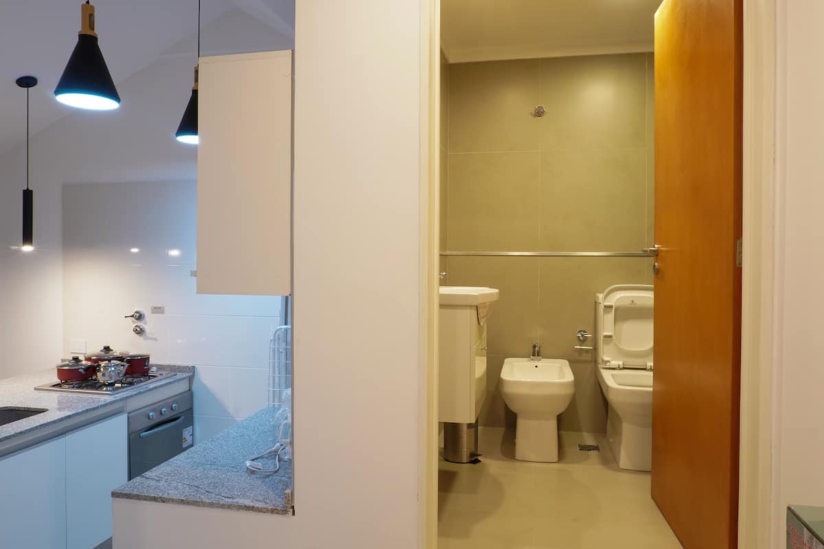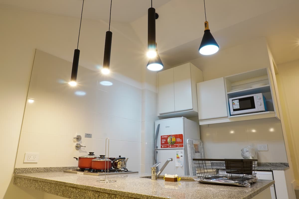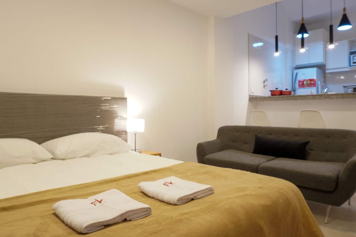 Studio apartment of 31 m² with a 4 m² balcony in Villa del Parque. The kitchen has a fridge, oven, microwave and coffee maker. It includes a hair dryer, washing machine, hot air conditioning, TV, and a queen double bed. Free Wi‑Fi is available.
