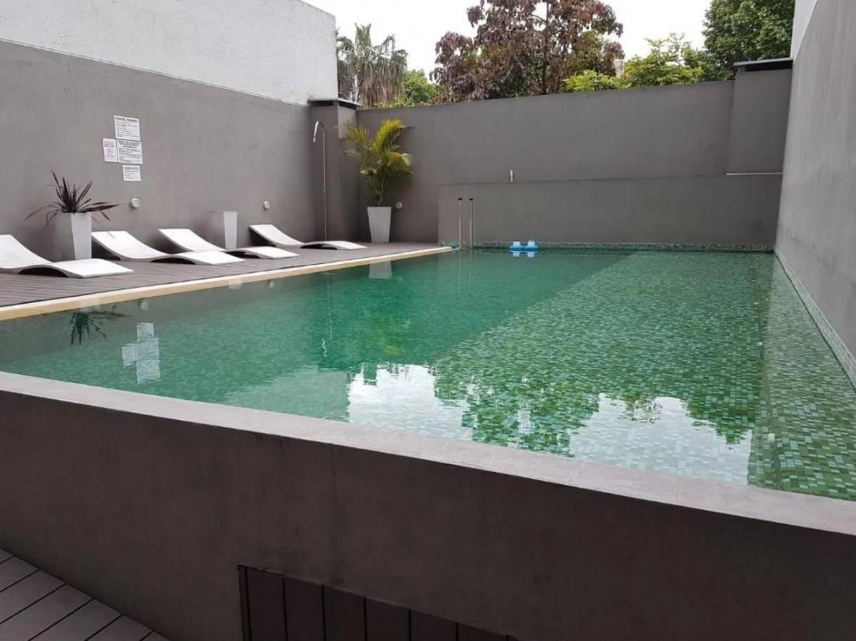 Modern one-room apartment, fully furnished and equipped. Living-dining area has hot/cold air conditioning, sanded wooden floor and a long balcony with open views. Integrated kitchen includes storage space; it has a double bed, a large wardrobe and a full bathroom. The building has a laundry, gym, pool, communal room (SUM) and a grill. Rent is USD 650 plus utilities, paid by the tenant.