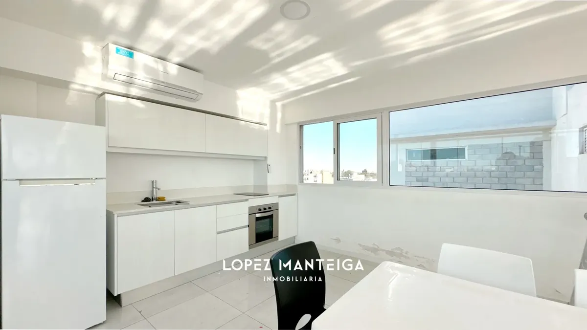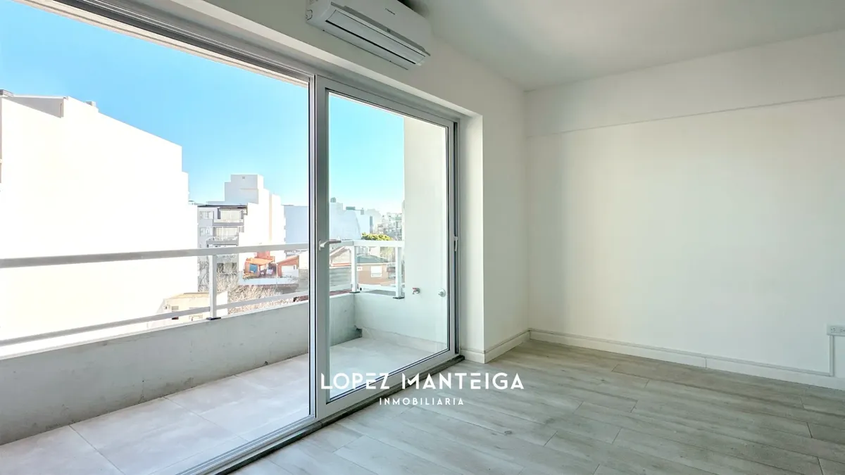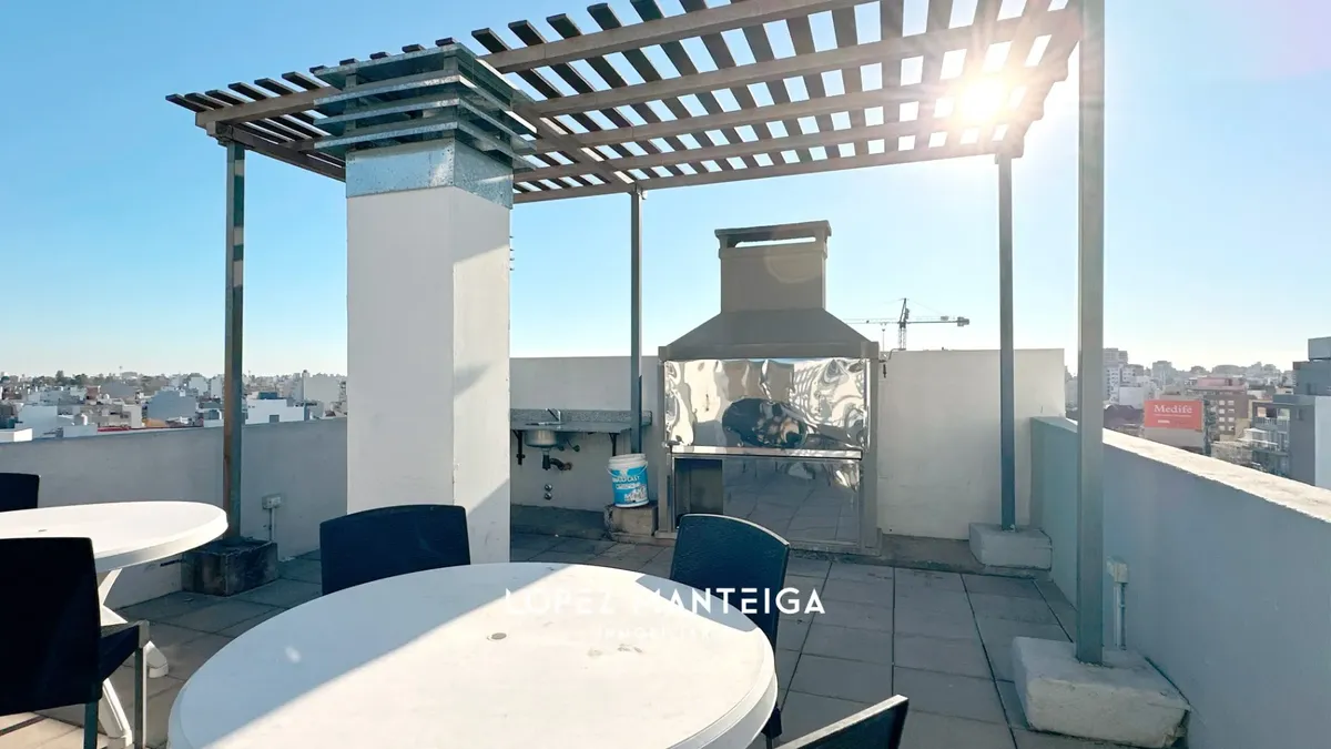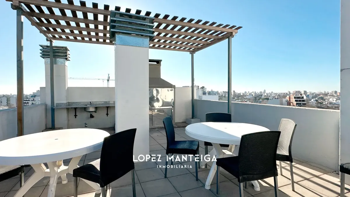Studio apartment on the 6th floor, courtyard-facing with a balcony. Unfurnished unit with built-in base cabinetry including an electric oven and hotplate, a full bathroom, central hot water, and a floor-to-ceiling closet. The building has a rooftop pool, fully equipped communal room (SUM), laundry and an outdoor grill area. Monthly rent is $710,000, with building fees (expensas) of $200,000.