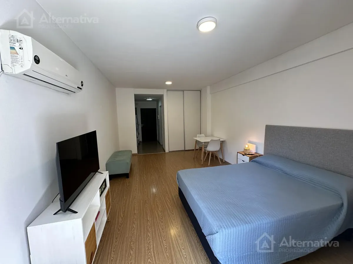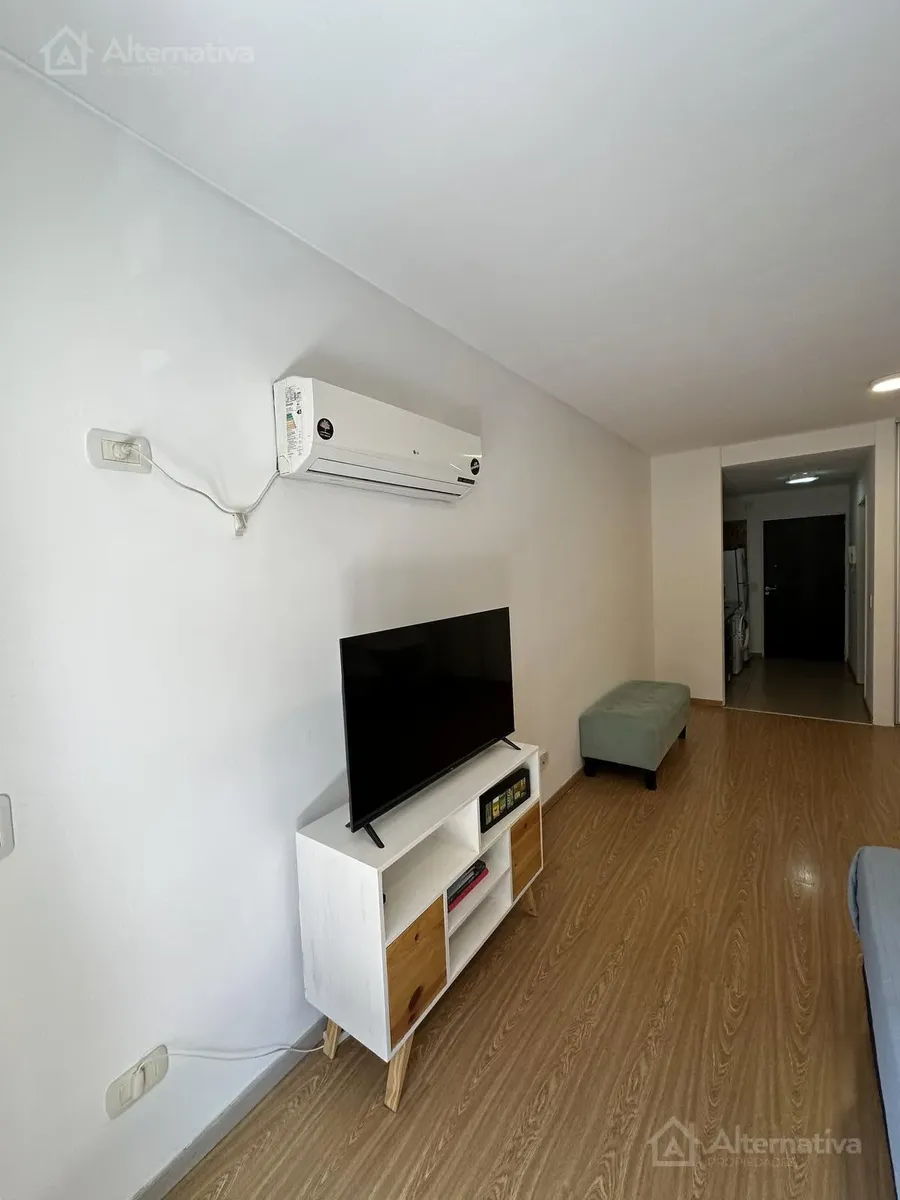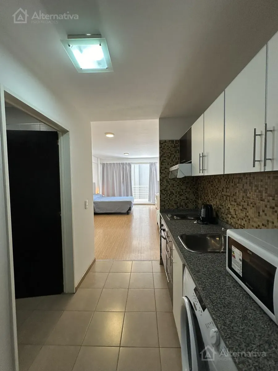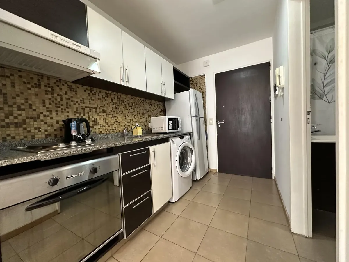 Studio apartment with a balcony, courtyard-facing, with air conditioning (hot/cold). Integrated kitchen includes an electric two-burner cooktop, extractor fan, electric oven, electric kettle, microwave, and refrigerator with freezer; automatic washing machine is also included. Full bathroom with bathtub, built-in wardrobe with sliding doors, and communal facilities including SUM and solarium. Rent includes building fees and utilities with a consumption cap and is delivered with bed linen. The bu