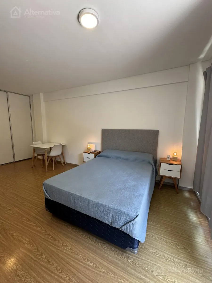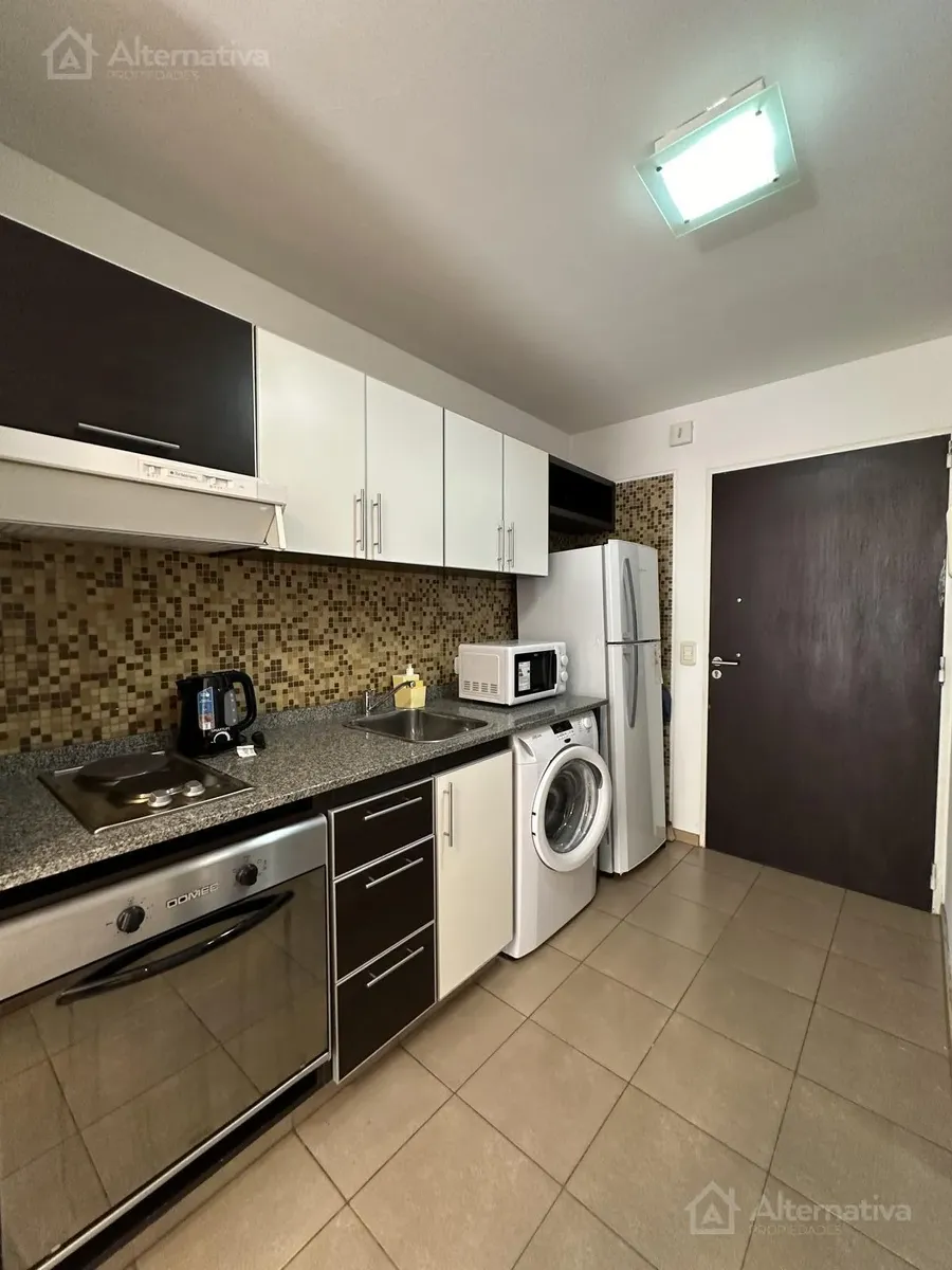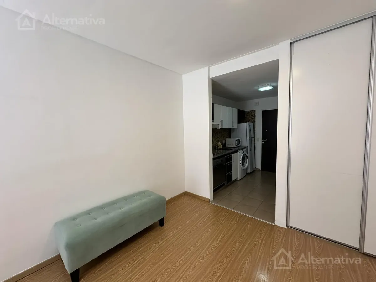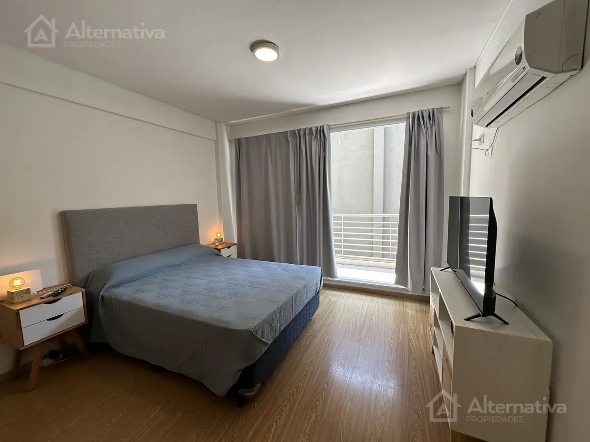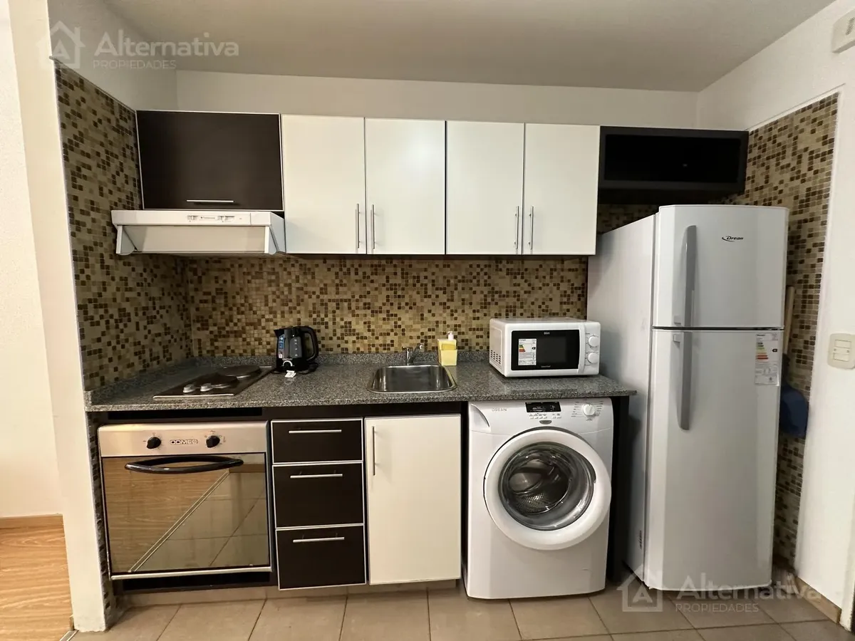 Studio apartment with a balcony, courtyard-facing, with air conditioning (hot/cold). Integrated kitchen includes an electric two-burner cooktop, extractor fan, electric oven, electric kettle, microwave, and refrigerator with freezer; automatic washing machine is also included. Full bathroom with bathtub, built-in wardrobe with sliding doors, and communal facilities including SUM and solarium. Rent includes building fees and utilities with a consumption cap and is delivered with bed linen. The bu