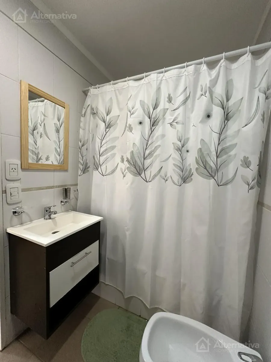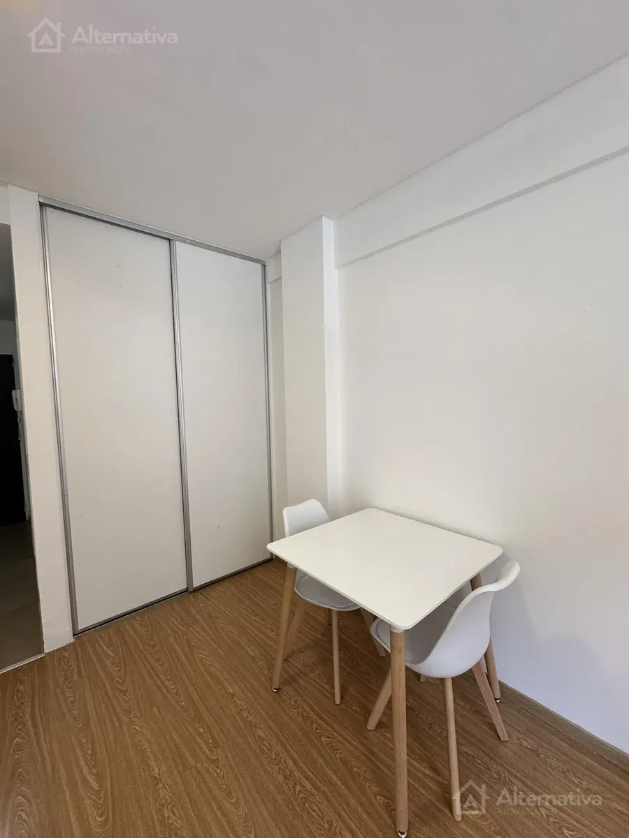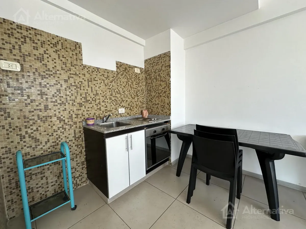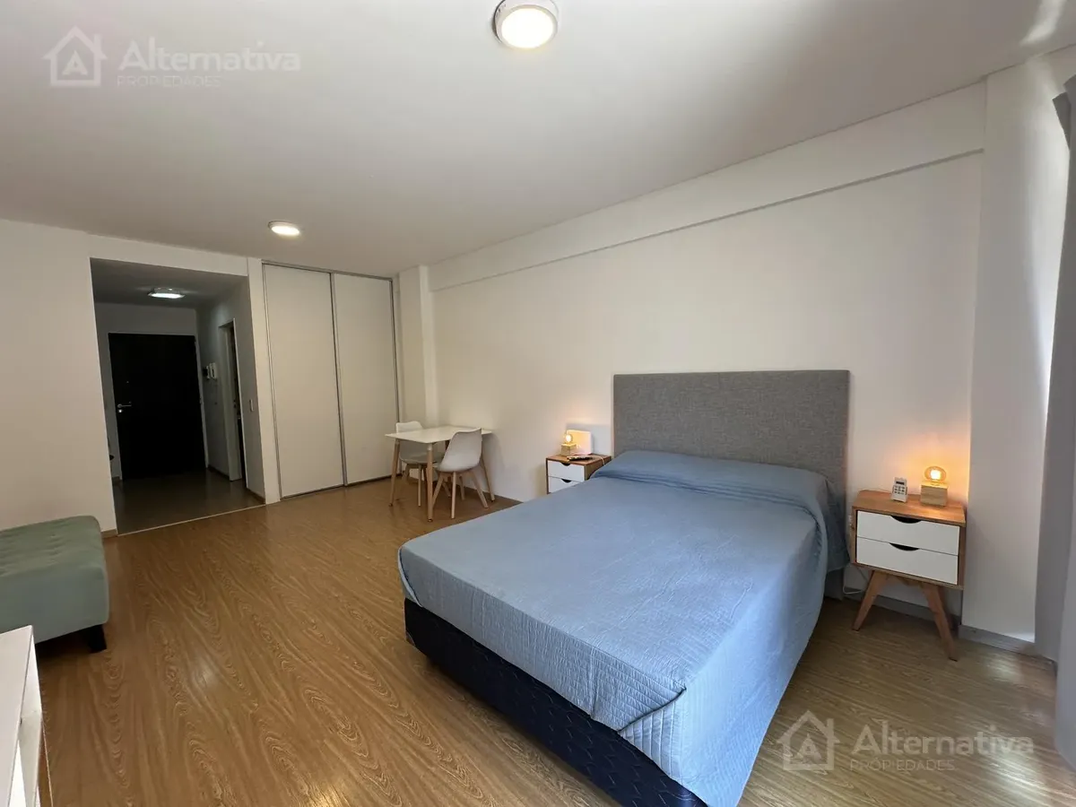 Studio apartment with a balcony, courtyard-facing, with air conditioning (hot/cold). Integrated kitchen includes an electric two-burner cooktop, extractor fan, electric oven, electric kettle, microwave, and refrigerator with freezer; automatic washing machine is also included. Full bathroom with bathtub, built-in wardrobe with sliding doors, and communal facilities including SUM and solarium. Rent includes building fees and utilities with a consumption cap and is delivered with bed linen. The bu