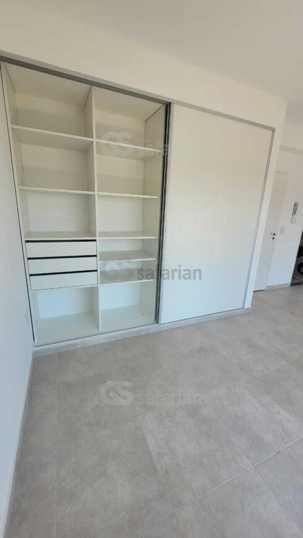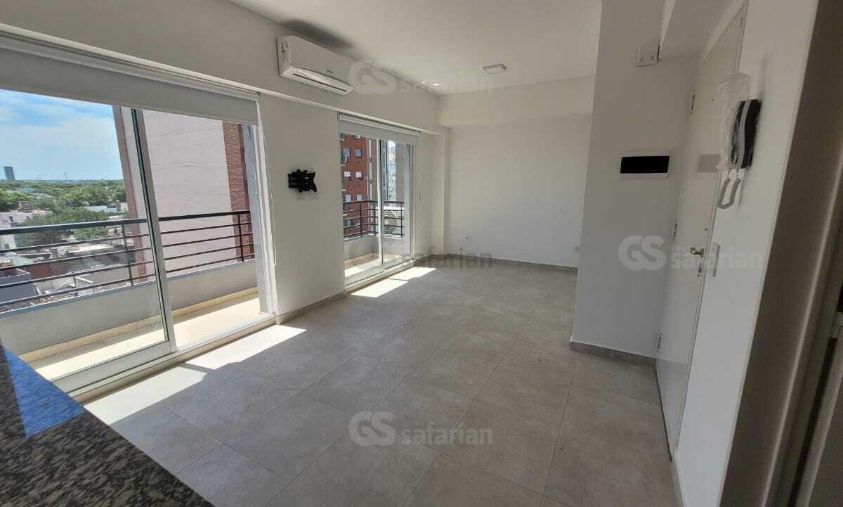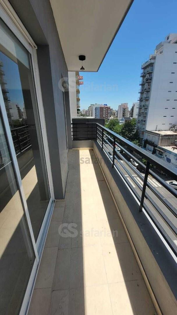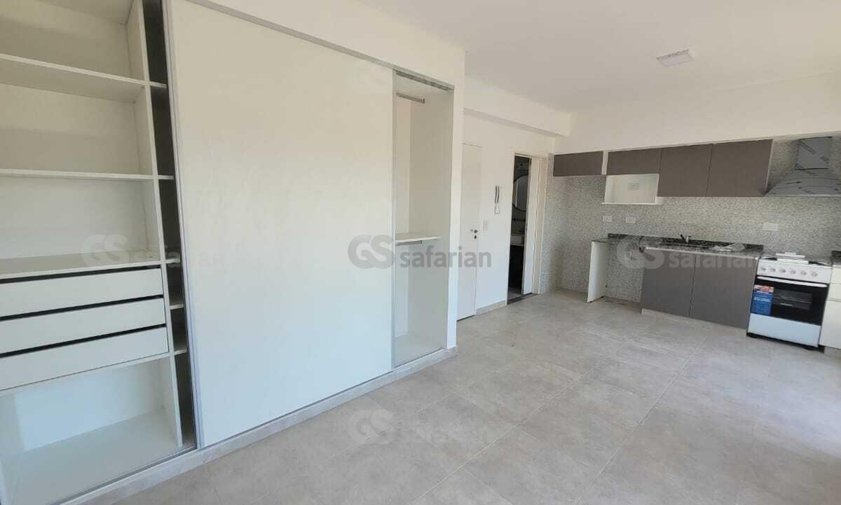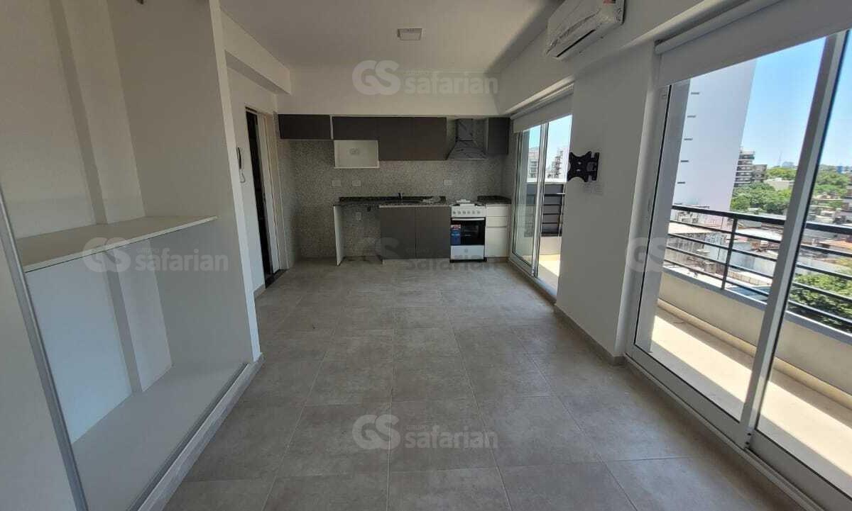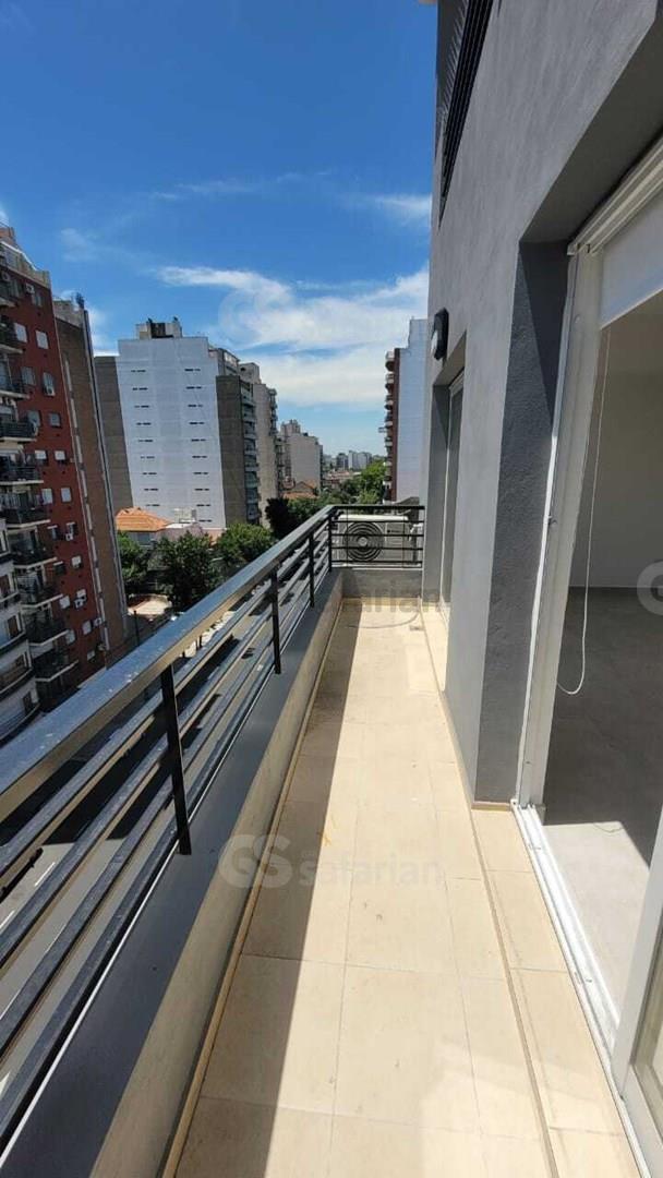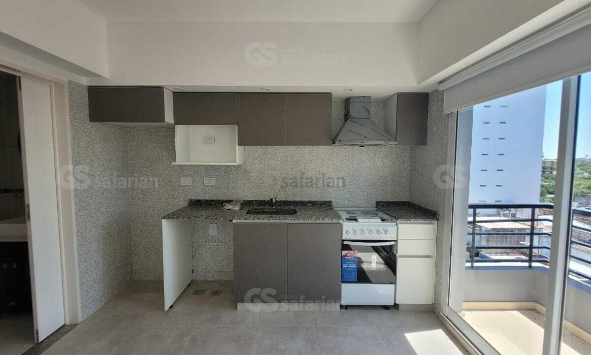 Brand-new studio apartment in Villa Pueyrredón on the 6th floor, street-facing with a continuous balcony and panoramic views. It has two balcony doors and a full fitted closet, plus a partitioned full bathroom. Electric cooking with granite countertop, Monocomando taps for hot and cold water, hot water supplied by a central boiler, and under-counter cabinets and wall cabinets; there is a connection for a washer. Building fees are ARS 80,000, and the rental term is 24 months with quarterly update