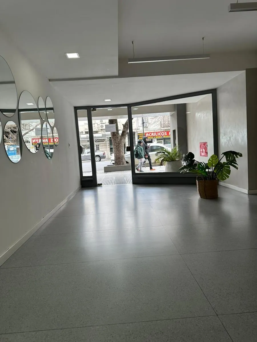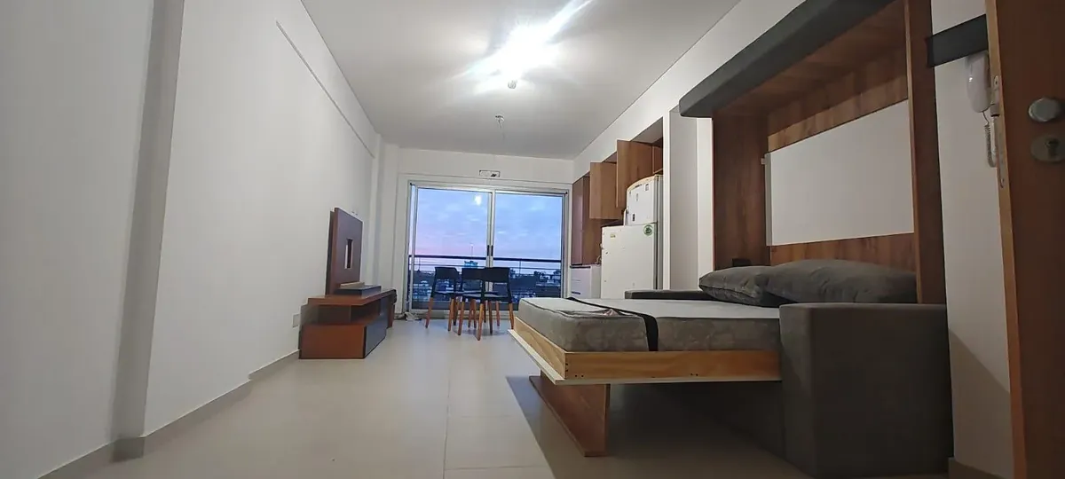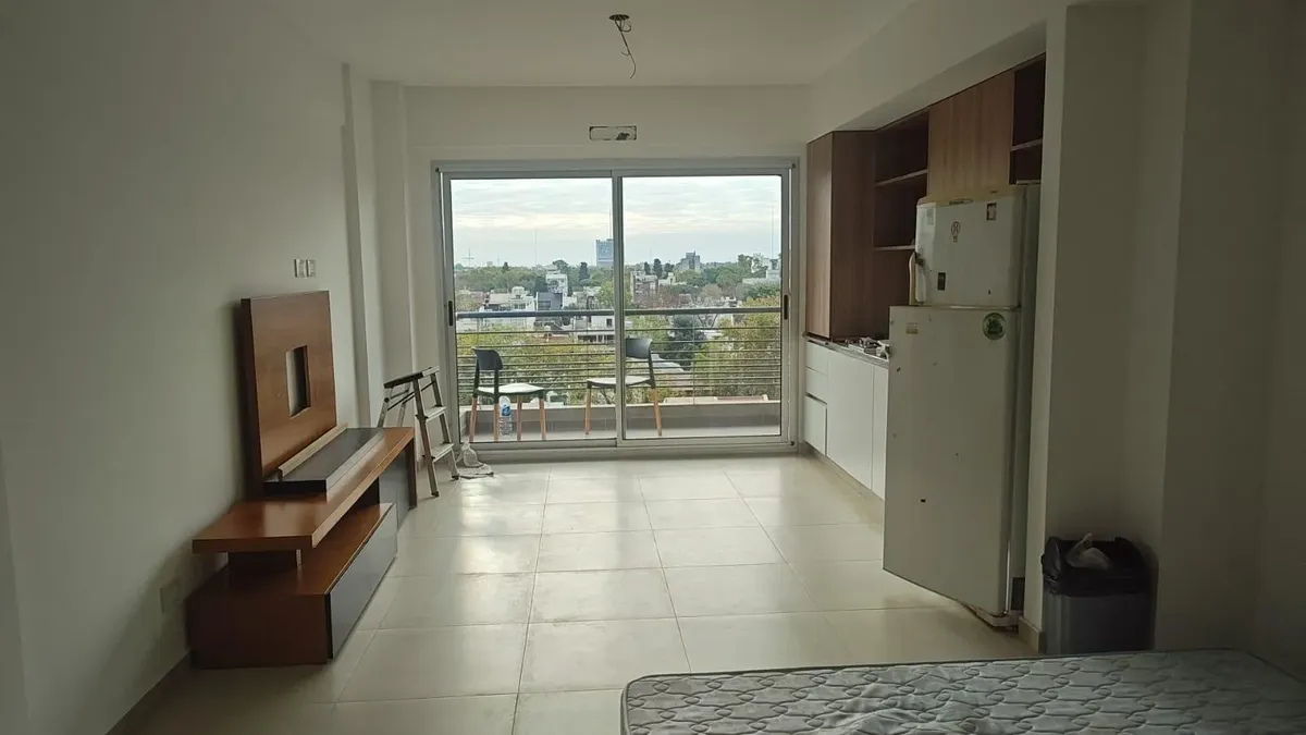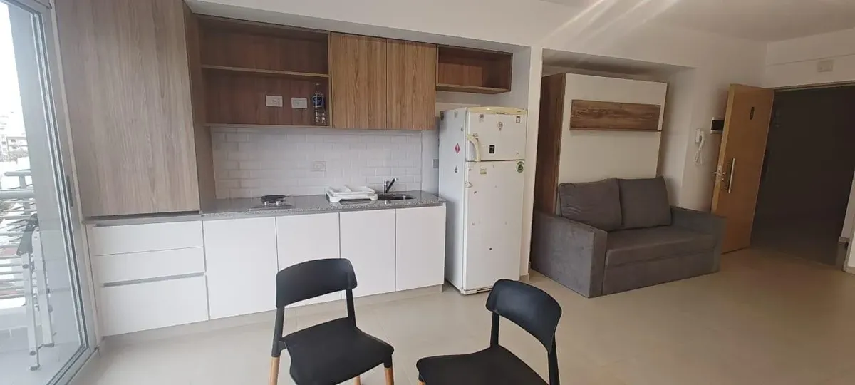 Studio apartment in Villa Pueyrredón, furnished. The kitchen includes a countertop and custom upper and lower cabinets. There is a balcony overlooking the courtyard. Building fees are low.