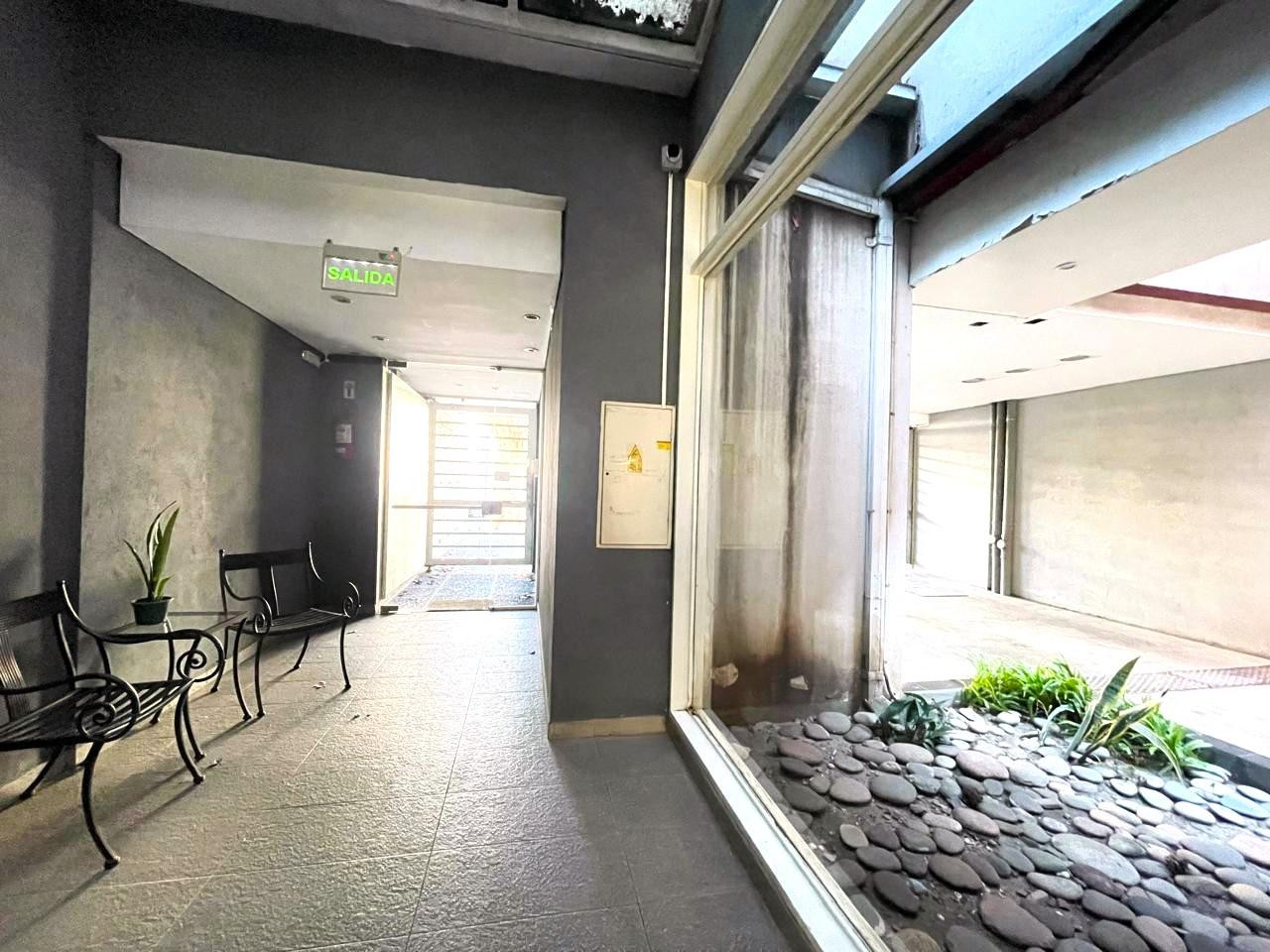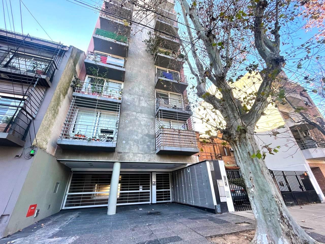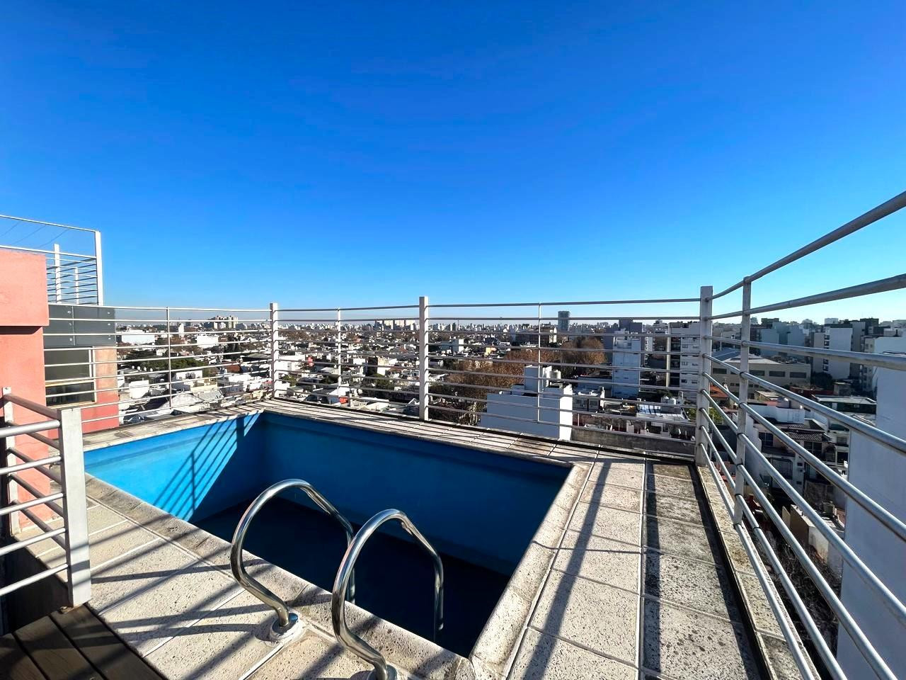 Studio apartment with integrated kitchen and a full bathroom, street-facing with a balcony. The 7th-floor unit has open views, with a window on one side and a large glazed opening on the other. Approximate measurements: studio area 3 x 7.50 m, kitchen space 2.60 x 1 m, bathroom 2 x 1.60 m. The building has 9 floors, 2 apartments per floor, an automatic elevator, a pool and a communal SUM. Building fees listed for March are ARS 153,000. Located between Beláustegui and Pasaje Las Provincias, 2 blo