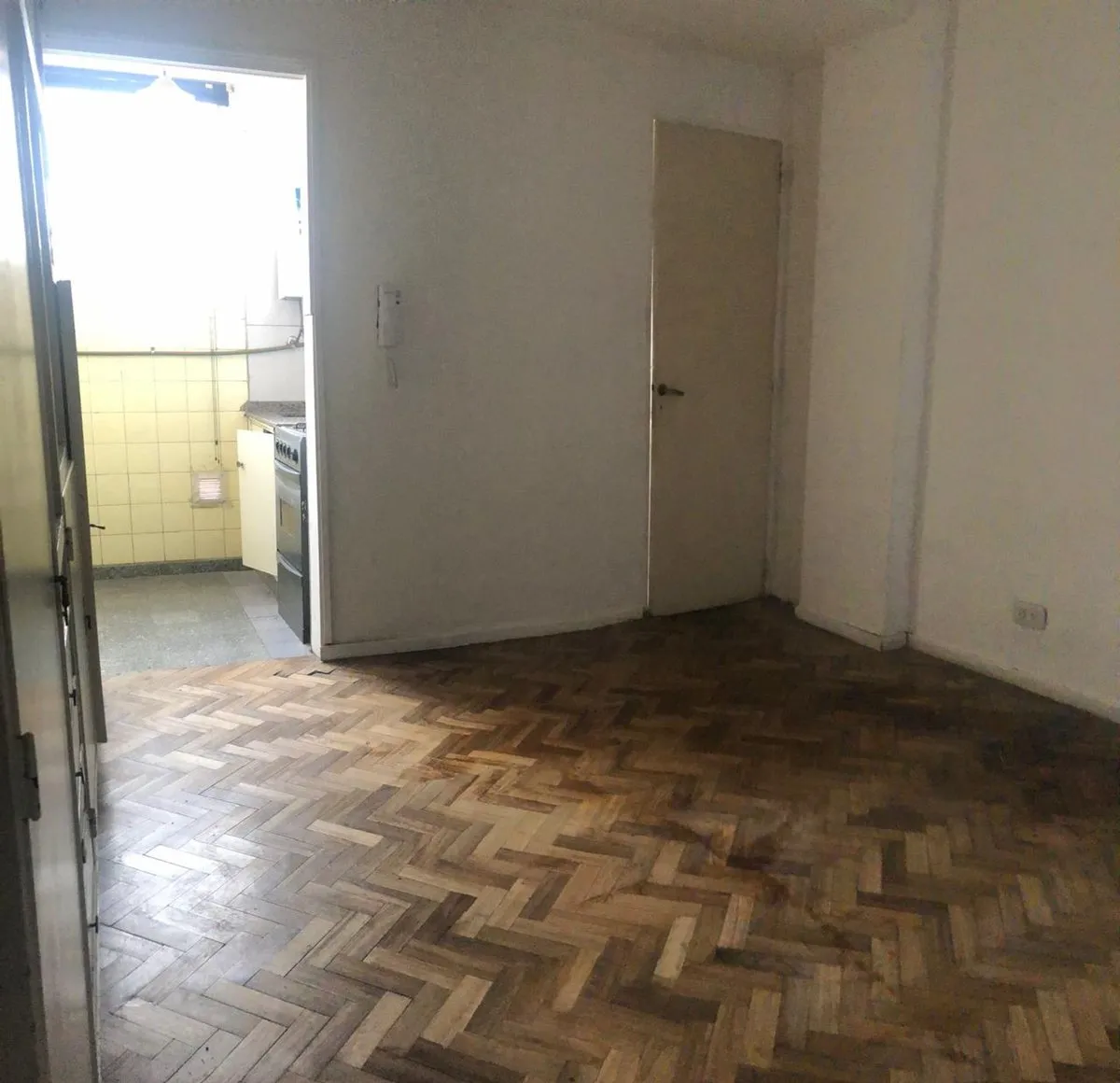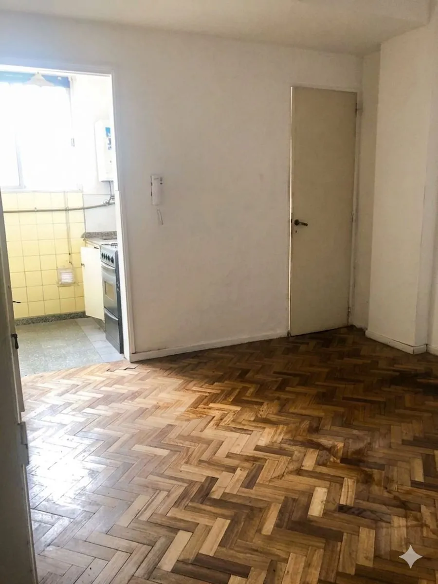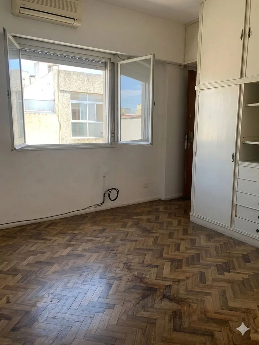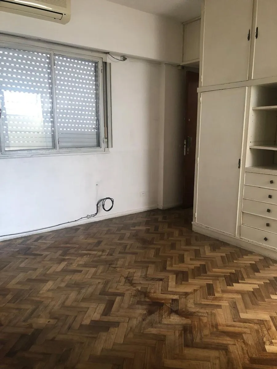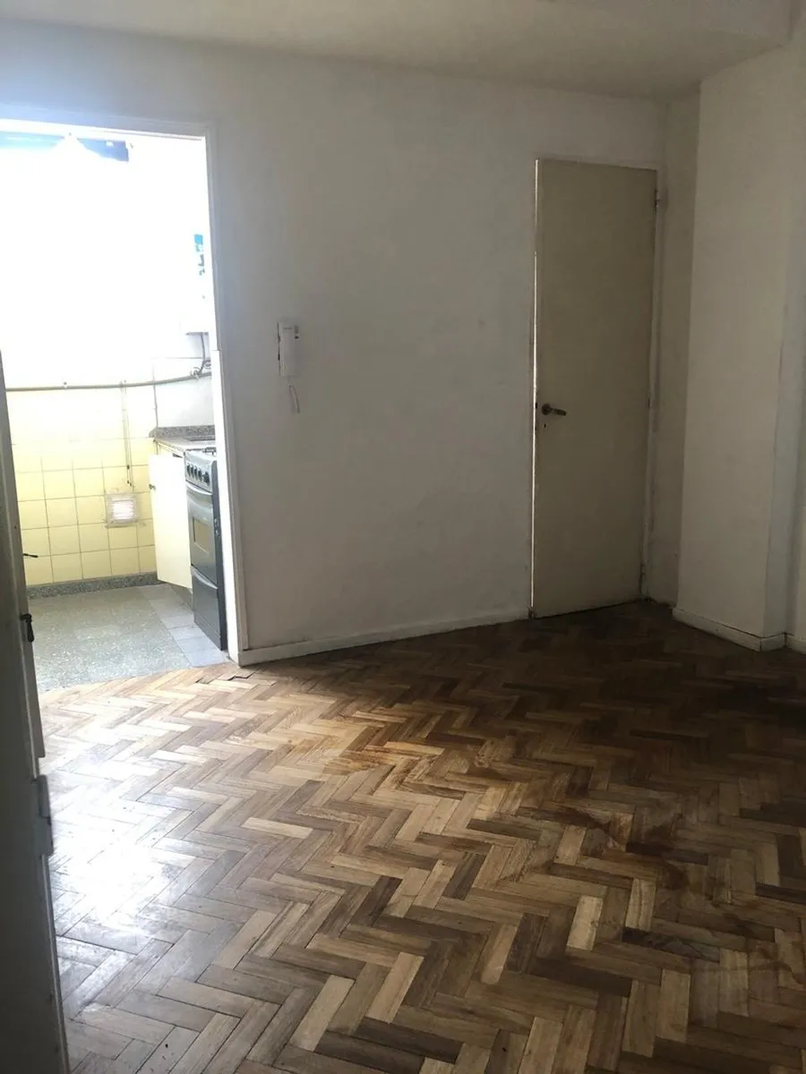Studio apartment for rent in Villa Urquiza, on the 3rd floor accessed by stairs. Courtyard-facing (contrafrente) in a low-unit building. Parquet flooring throughout, with a built-in full-wall wardrobe providing multiple compartments, drawers and shelves. Separate gas kitchen with installed cooktop, base cabinets and counter space; ventilation is mentioned.