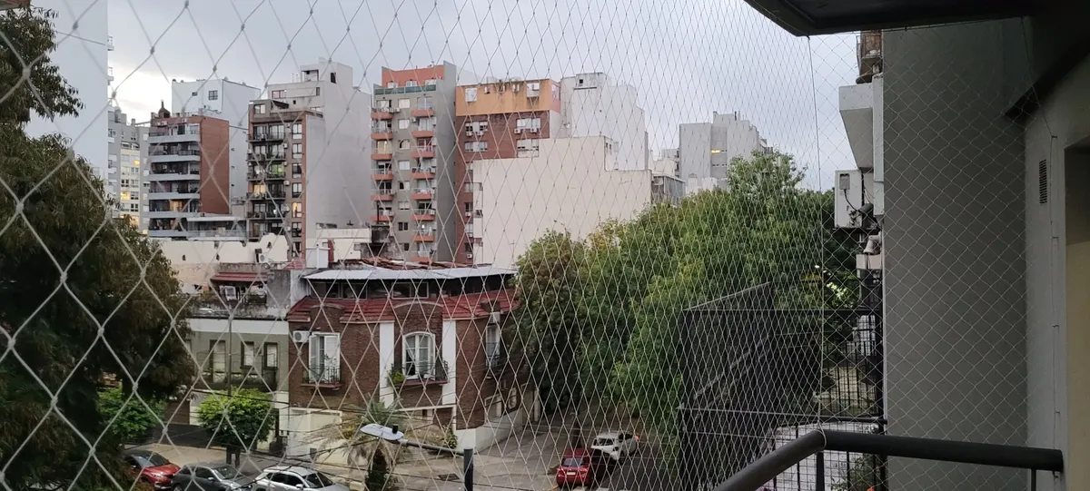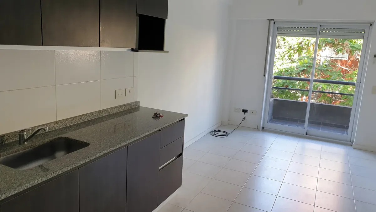 One-room apartment (studio) newly painted, on the 3rd floor, street-facing with a long front balcony. 39 m² with two front windows fitted with roller blinds, gas kitchen with oven, hot and cold air conditioning, and a full bathroom with a bathtub. Laundry with washing machines is available in the building and there are grills; the balcony is enclosed with protective mesh. Rental contract is for 24 months with quarterly adjustments based on IPC; 1 month advance payment and 1 month deposit are req