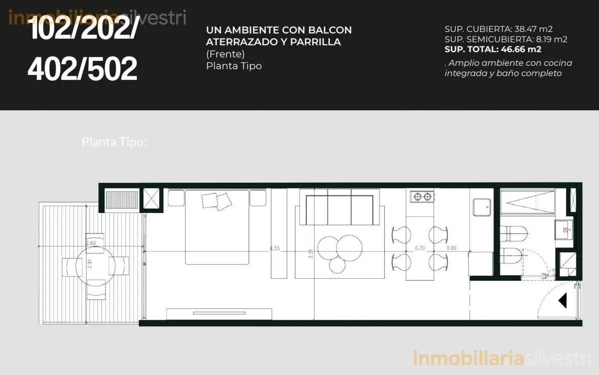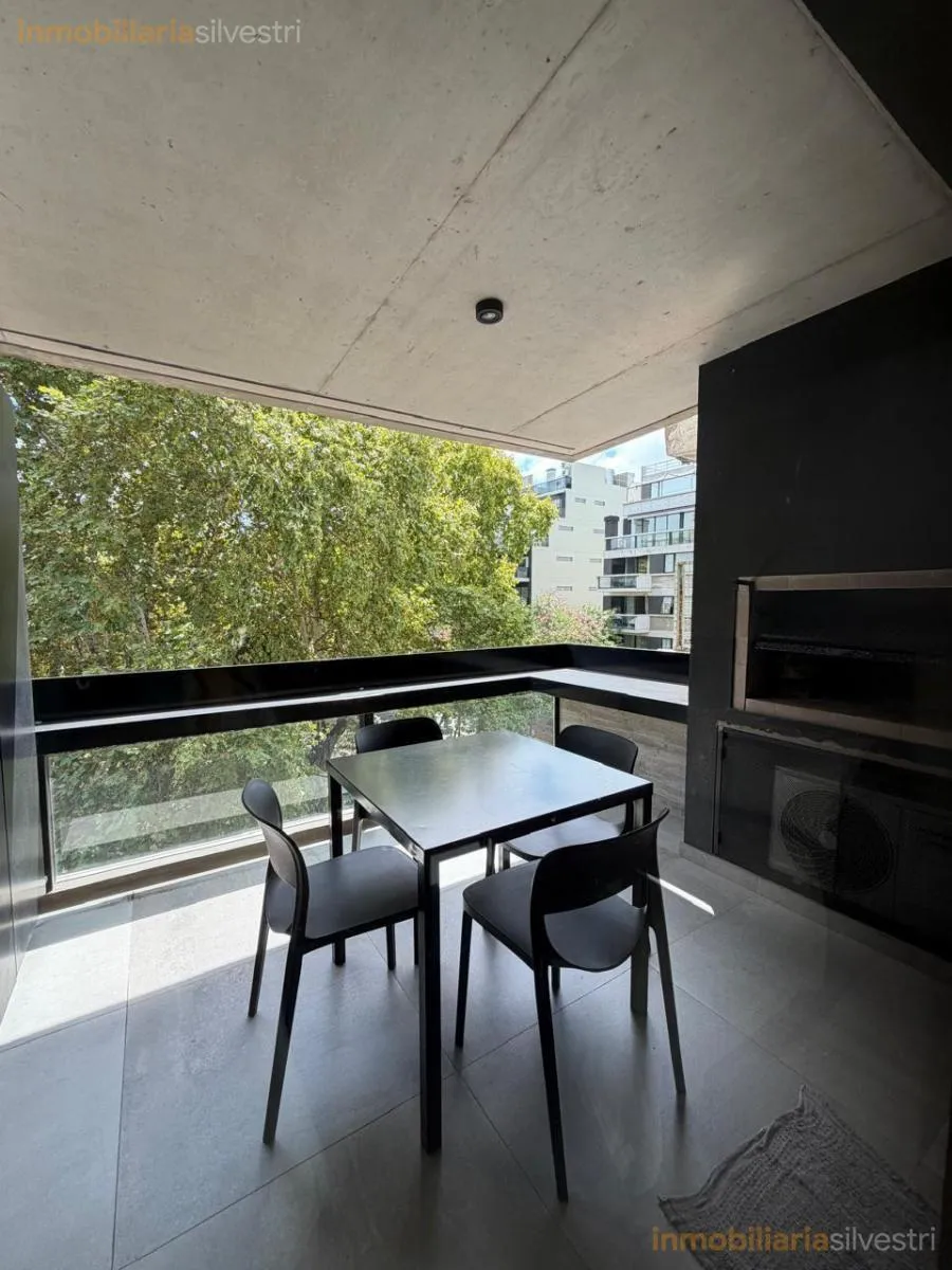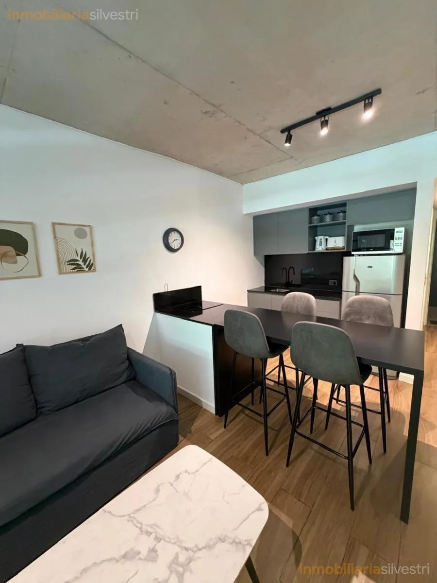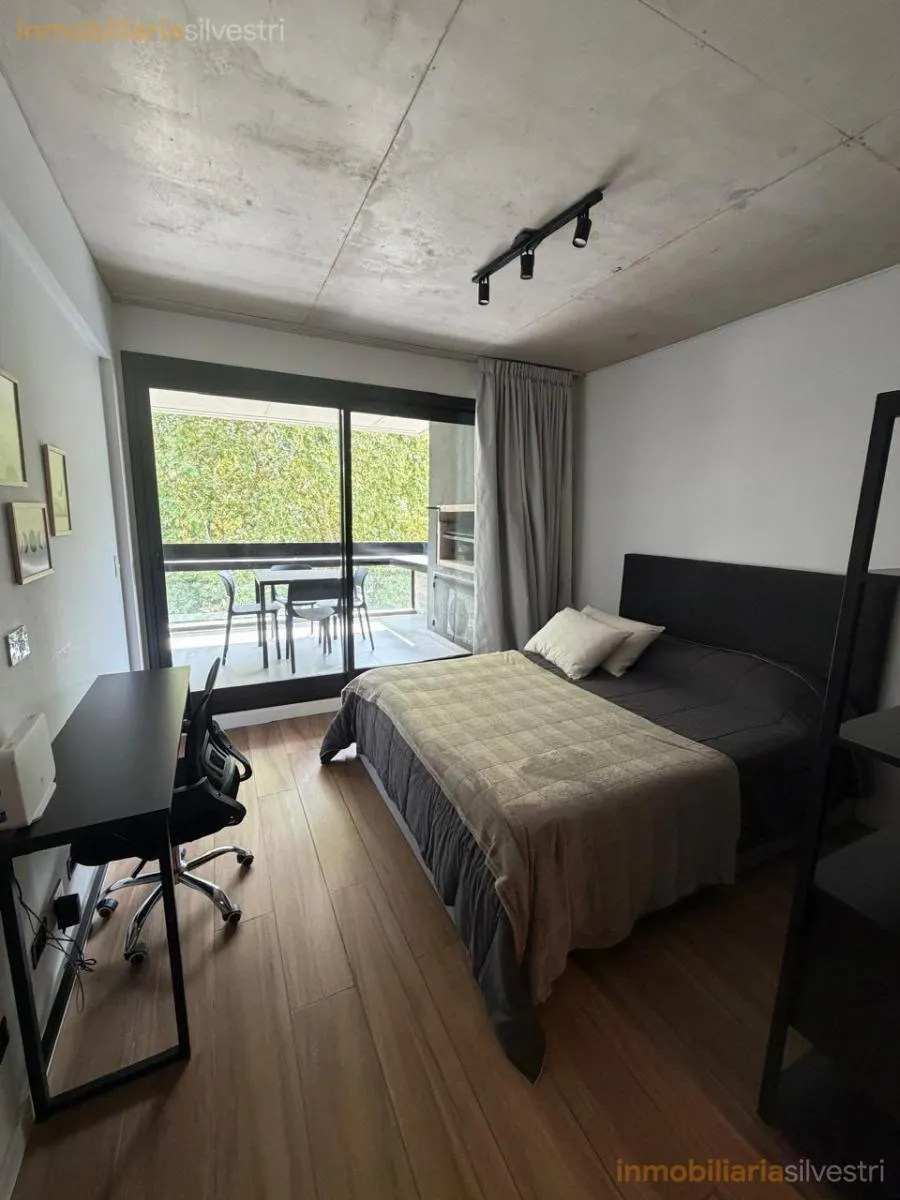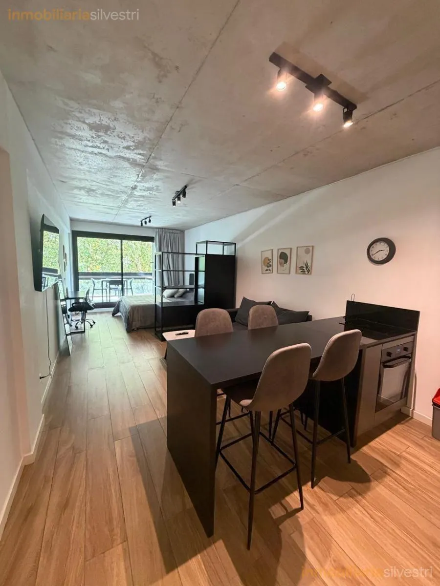 Studio apartment for rent in Villa Urquiza, facing Plaza Zapiola. The unit is fully furnished and equipped, and is about 2 years old. The building has a pool on the rooftop. Pets are allowed. Building fees and utilities are not specified.