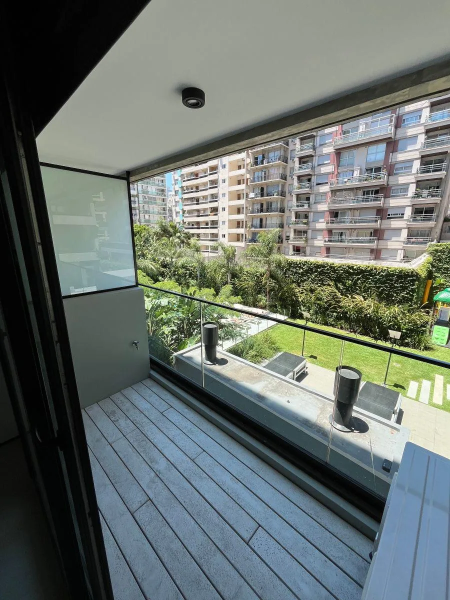 Brand new studio apartment for rent in Villa Urquiza. The unit has 33 m² of covered area and 36 m² total area, with a lateral layout designed for natural light. It includes a balcony, air conditioning, and heating, and is equipped with an elevator and internet/Wi‑Fi. Building amenities include a gym, hydromassage, grill, pool, sauna, solarium, and 24-hour security.