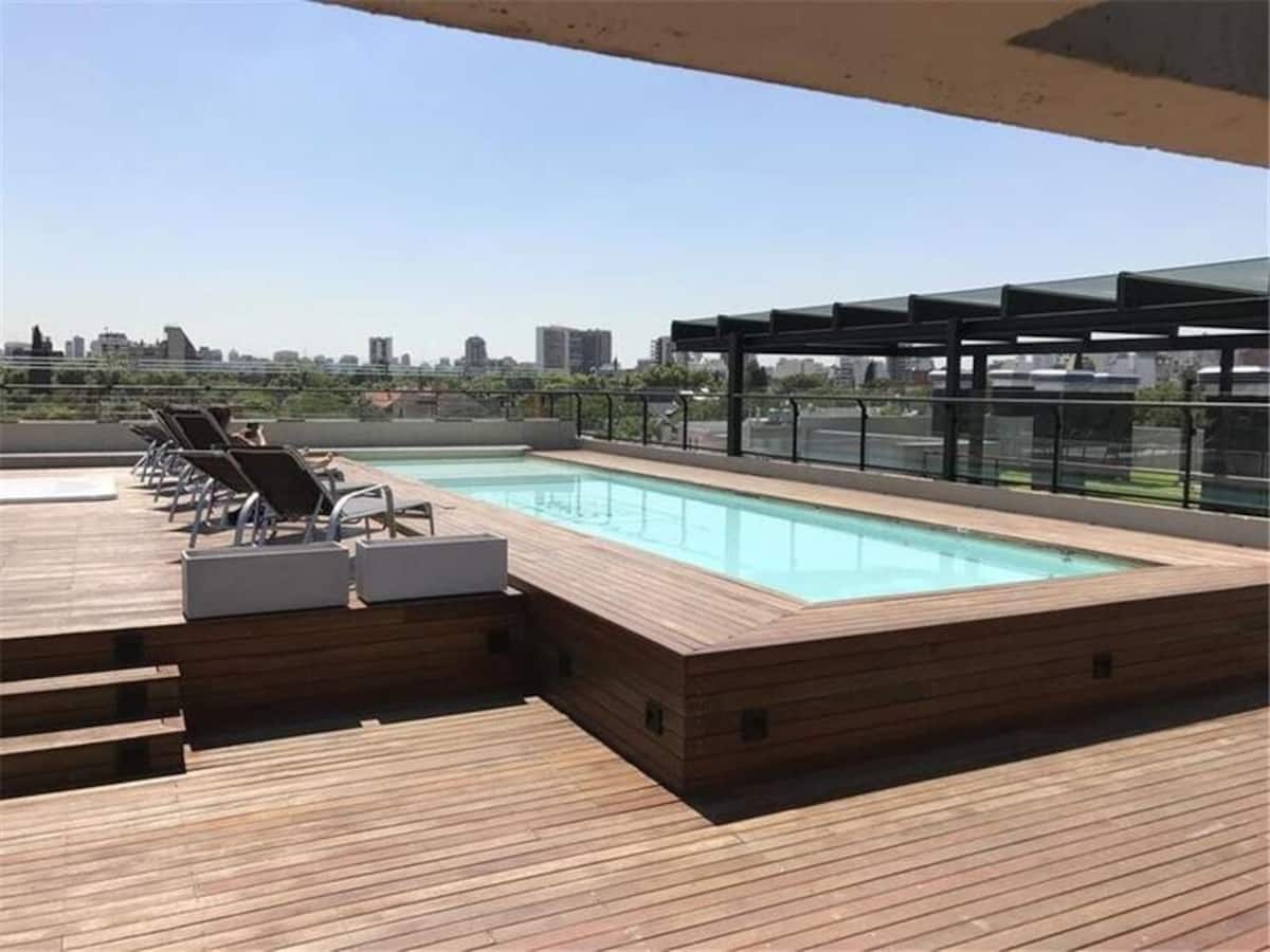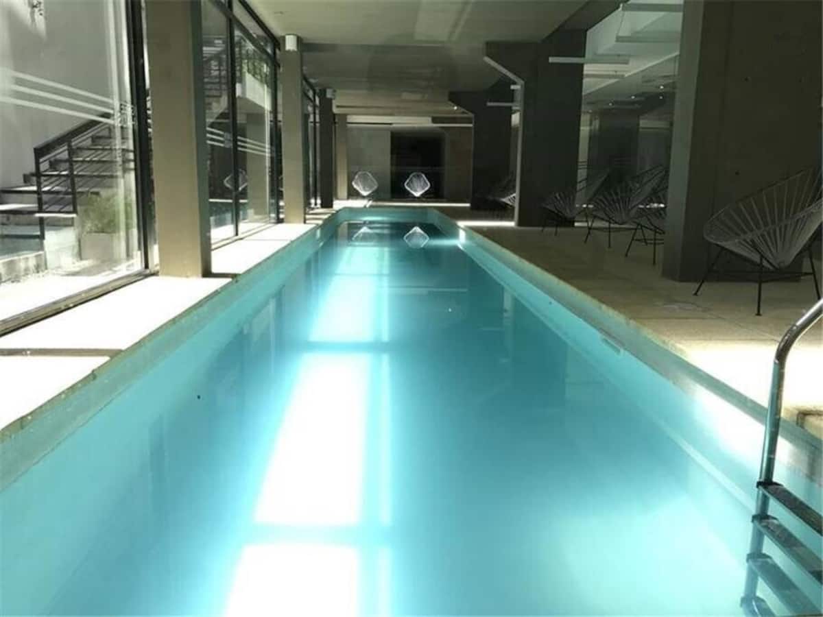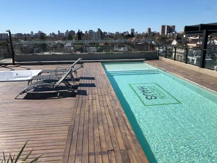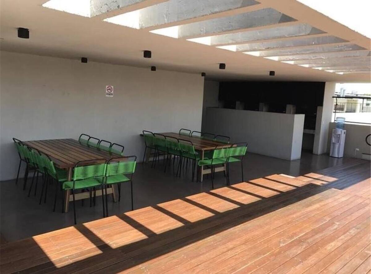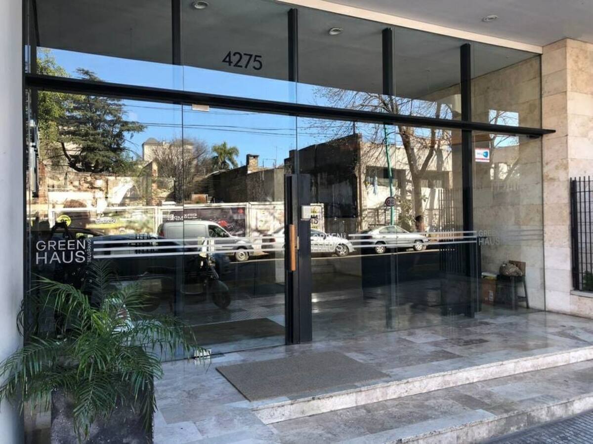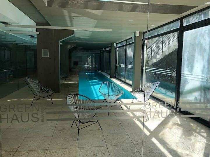 Studio apartment in the Green Haus complex, located above the DoHo corridor in Villa Urquiza. The complex offers an outdoor pool with a terrace, deck and solarium, and a heated indoor pool, plus a gym, sauna, jacuzzi, and changing rooms. Other amenities include a grill with quincho, SUM, garden, meeting rooms, reading and games areas, a residents’ lounge with a large-screen cinema, children’s outdoor play area, and a laundry with a washer/dryer.