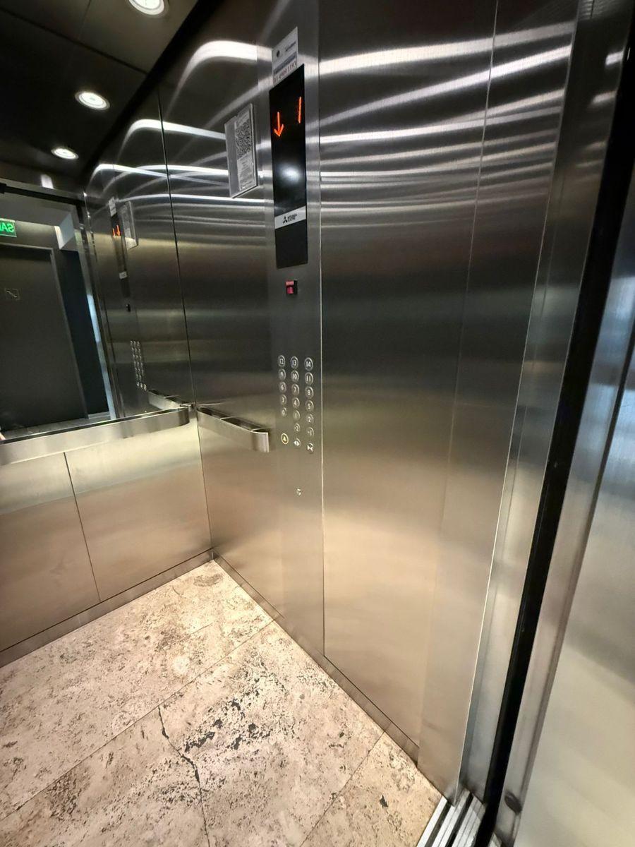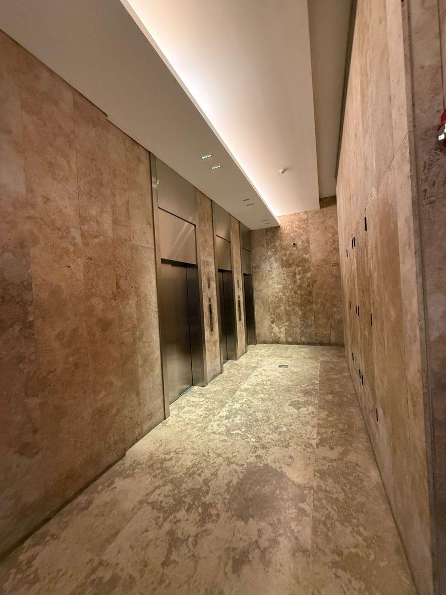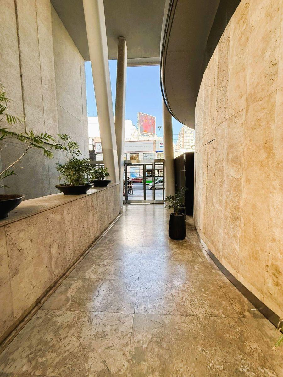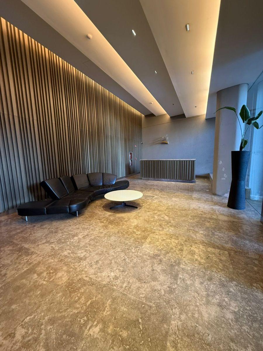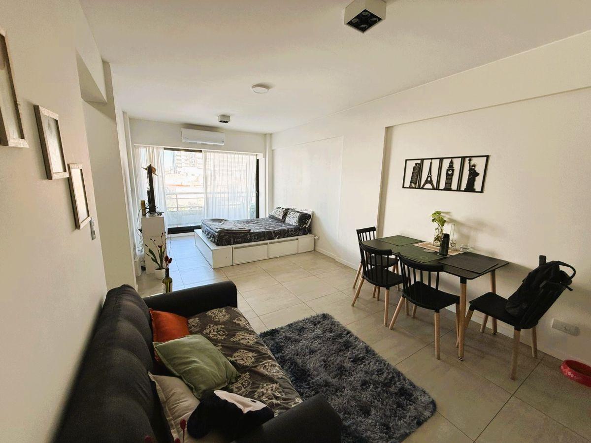 Studio apartment in Torre Evoque on Olazábal, street-facing, with balcony access and an interior split suitable for a living-dining area and sleeping area. Semi-integrated kitchen with fitted upper and base cabinetry, a full bathroom, and a large sliding-doors wardrobe. Fully electric unit with air conditioning (hot/cold), double-glazed aluminium windows (DVH), porcelain tile floors, and an electronic lock. Building amenities include 24-hour security, pool with Jacuzzi and solarium, wide terrace