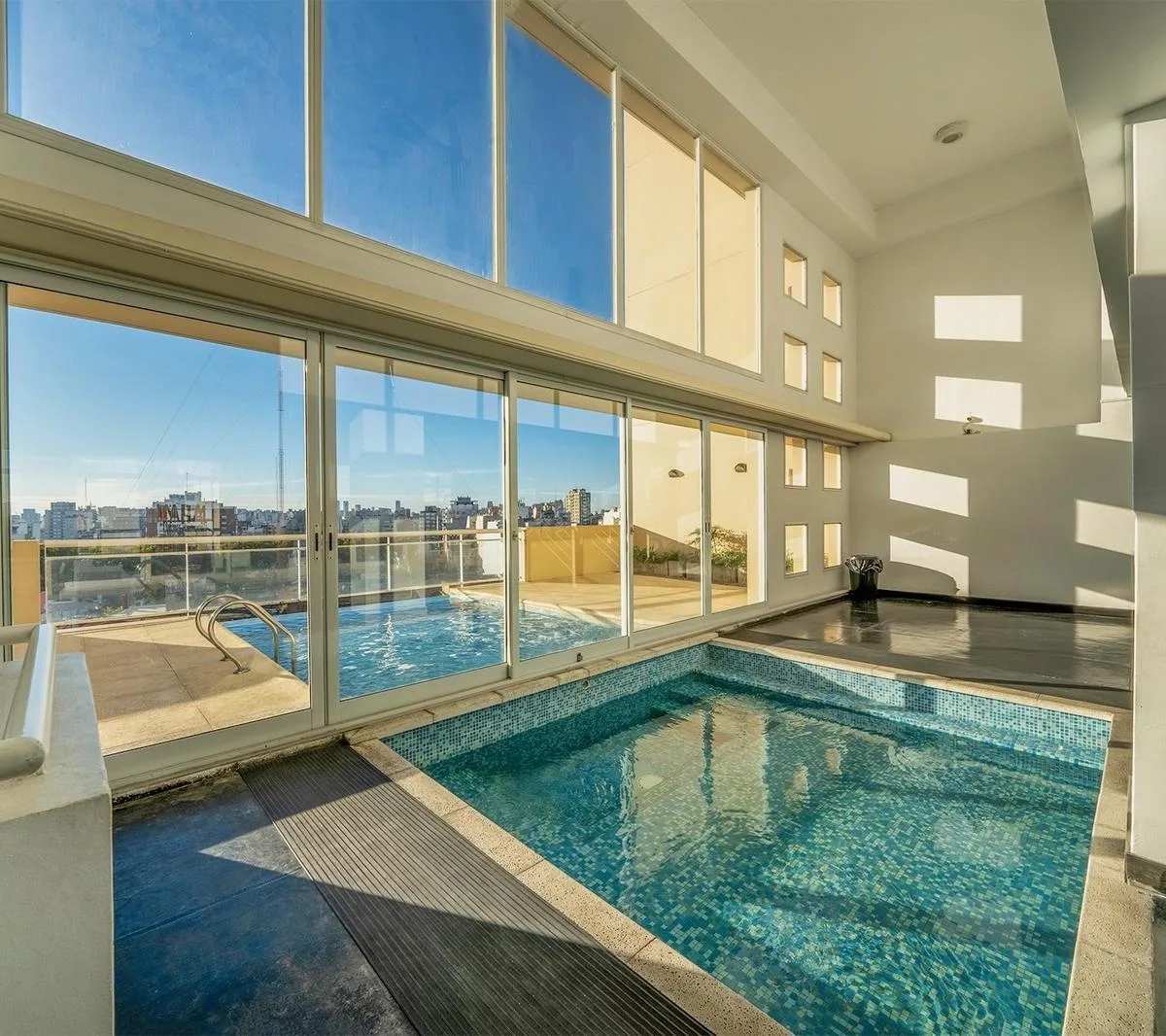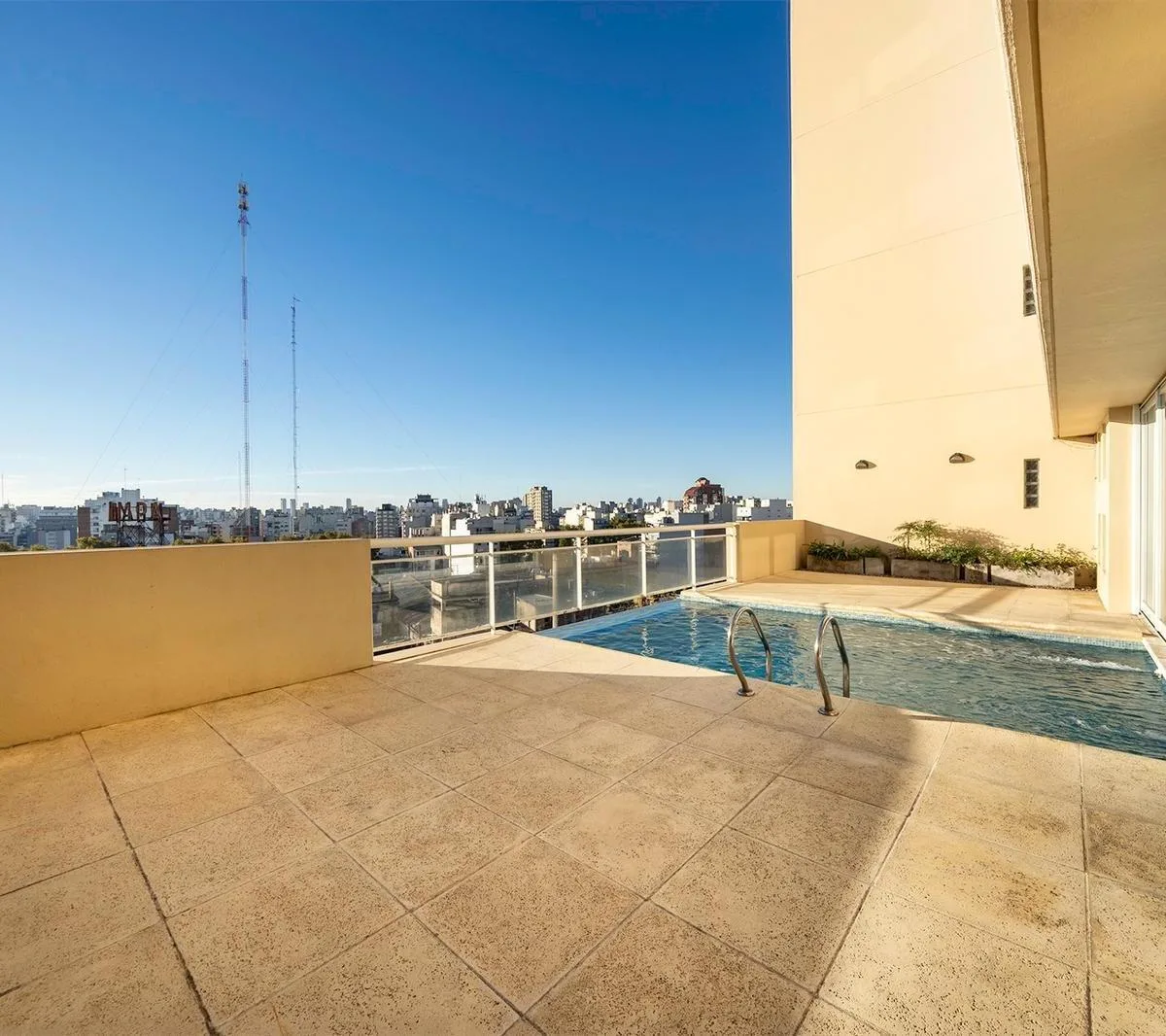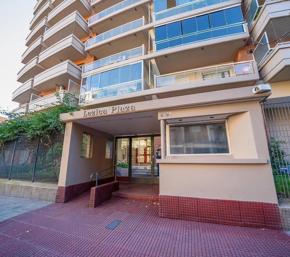 Apartamento de dois ambientes mobiliado no 10º andar, com varanda no contrafrente e vista aberta. Cozinha e área social equipadas. O prédio tem lavanderia, piscina coberta e descoberta, vigilância, salão de usos múltiplos (SUM), parque infantil e área de churrasco/quincho. O aluguel inclui condomínio, água, ABL e internet. Localizado na calle Lezica, a 1 quadra da Av. Rivadavia.