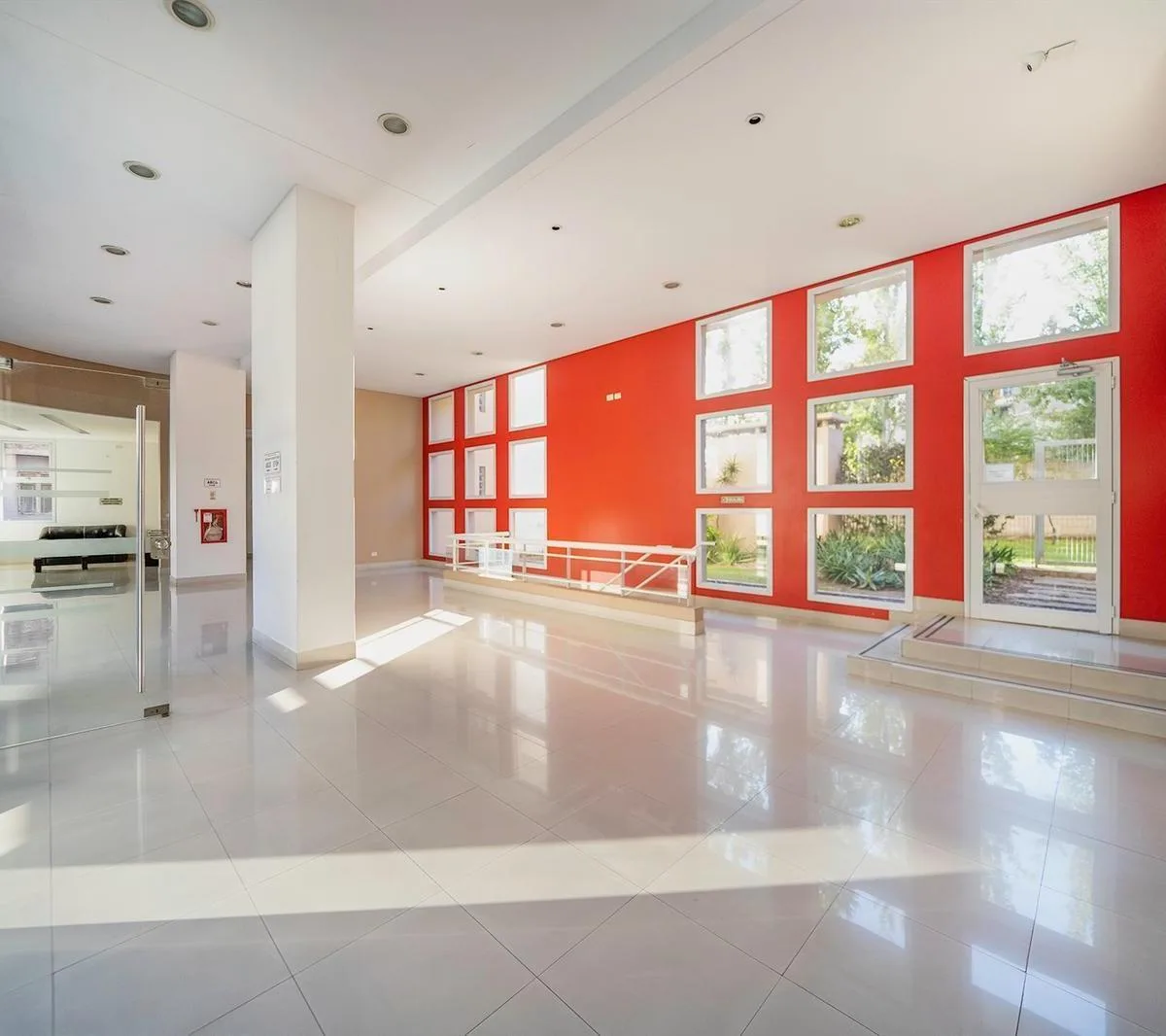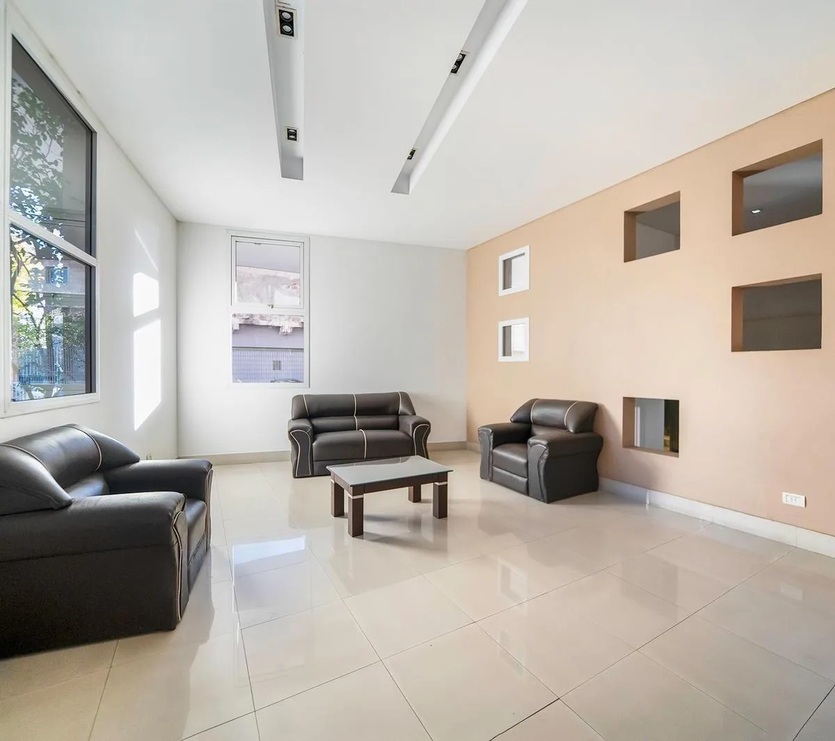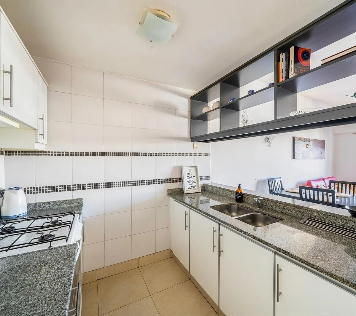 Apartamento de dois ambientes mobiliado no 10º andar, com varanda no contrafrente e vista aberta. Cozinha e área social equipadas. O prédio tem lavanderia, piscina coberta e descoberta, vigilância, salão de usos múltiplos (SUM), parque infantil e área de churrasco/quincho. O aluguel inclui condomínio, água, ABL e internet. Localizado na calle Lezica, a 1 quadra da Av. Rivadavia.