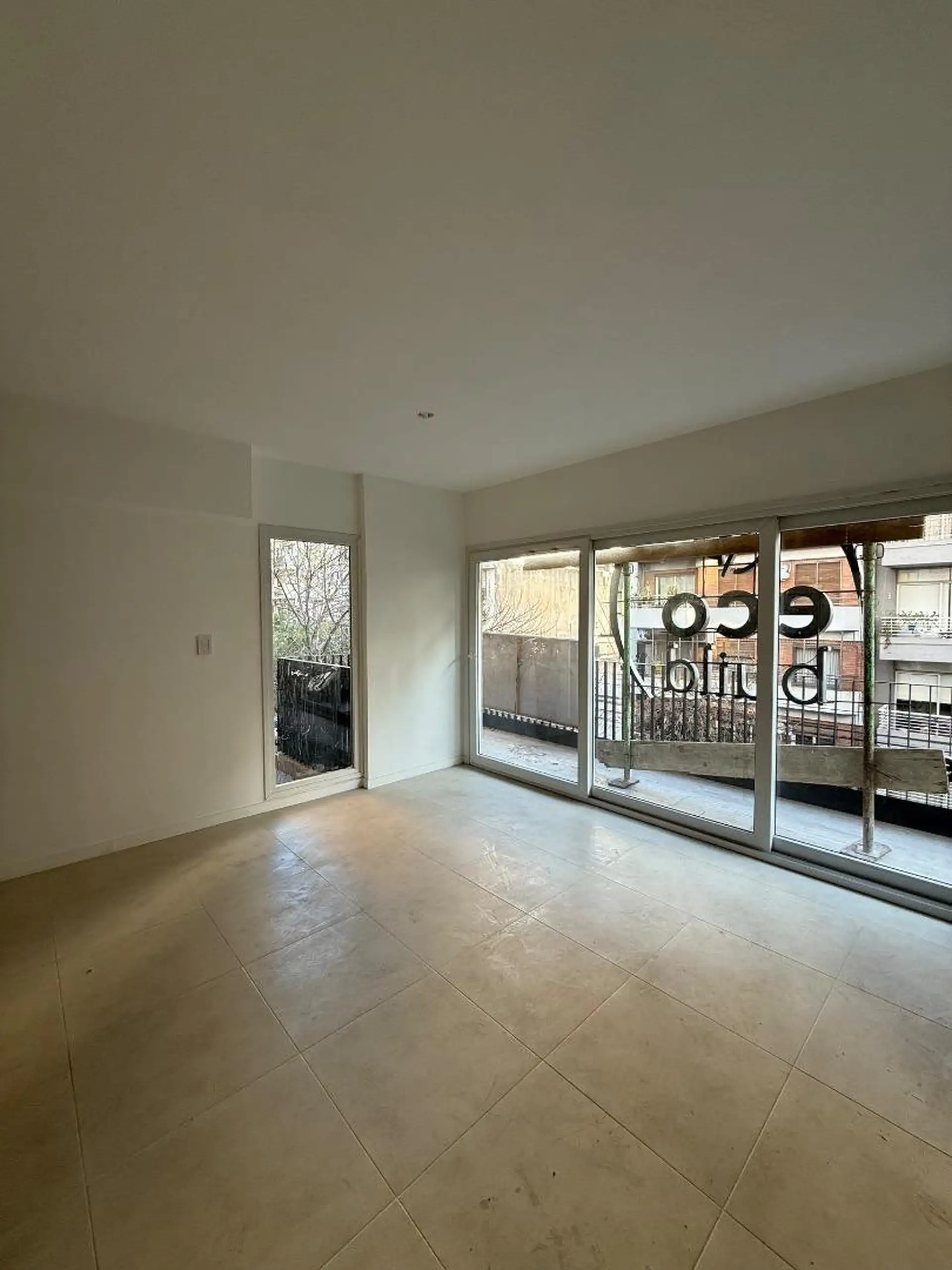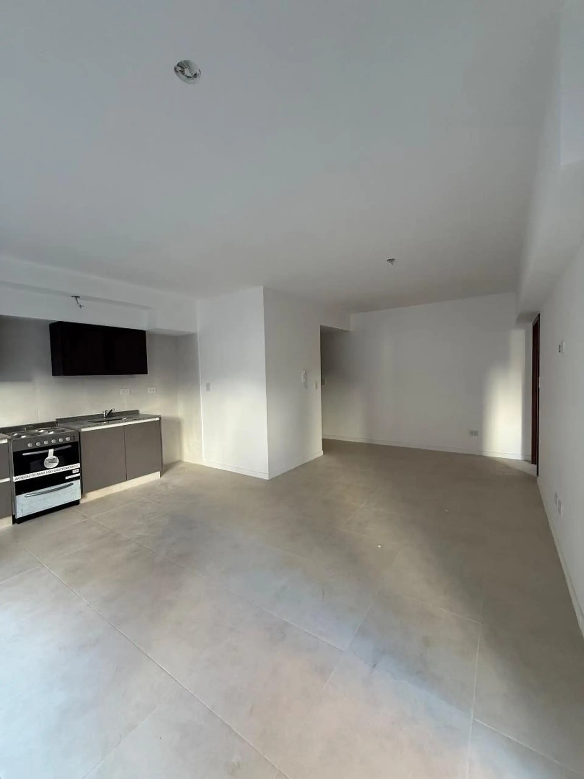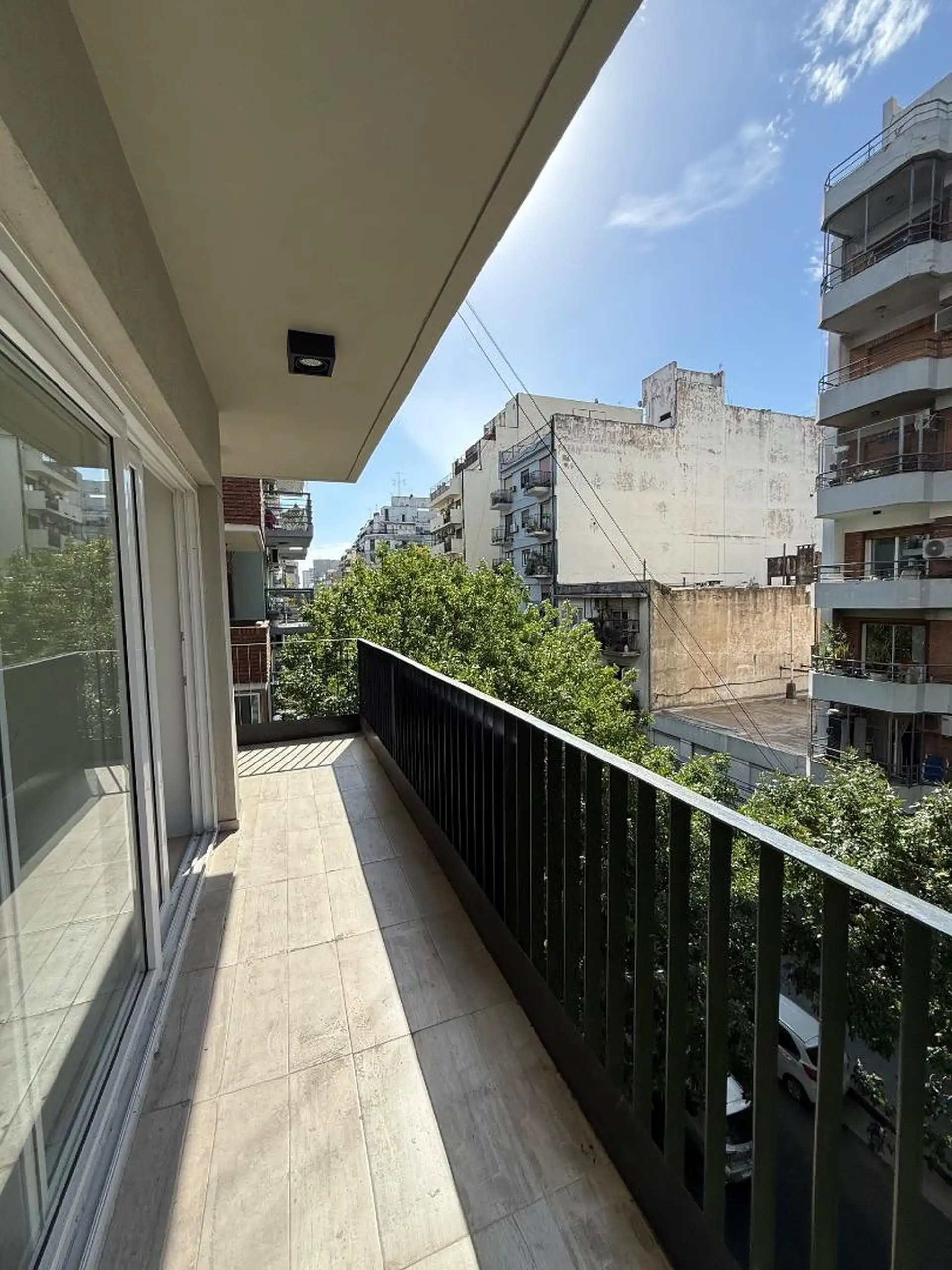 Apartamento de dois ambientes novo, de frente para a rua, no 4º andar, em Almagro Norte, com 58 m² cobertos e 68 m² totais. Inclui varanda em L na frente, sala de estar e jantar com saída para a varanda, cozinha integrada, 1 dormitório em suíte com banheiro completo e lavabo. Possui ar-condicionado na sala e ventilador de teto no dormitório.