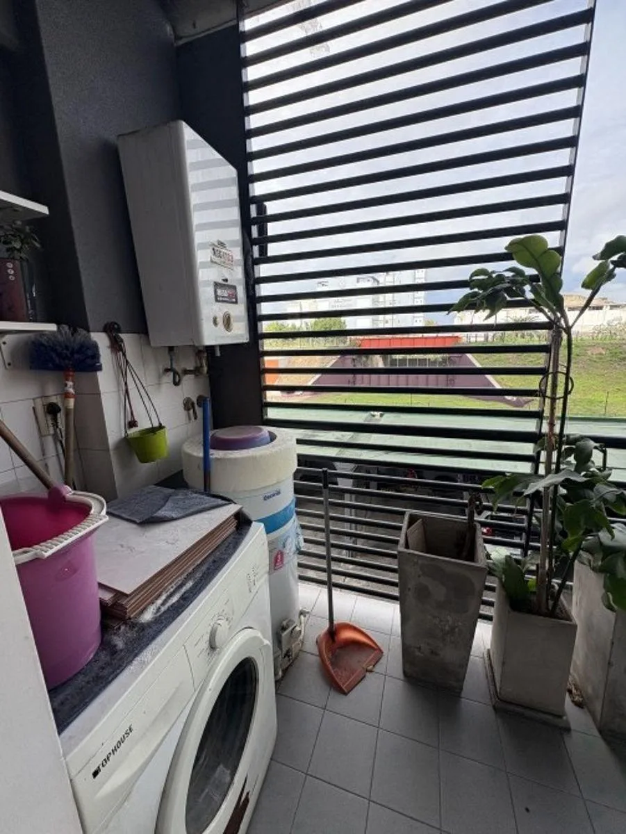 Apartamento de 2 ambientes no 1º andar, de fundos (contrafrente). Inclui sala de estar e jantar com saída para varanda, cozinha com armários inferiores e saída para área de serviço, banheiro completo e dormitório com ventilador e armário embutido. O condomínio tem piscina (adultos e crianças), praça de jogos, academia, quadra de futebol, salão de festas e área de churrasco com churrasqueira, além de segurança 24 horas.