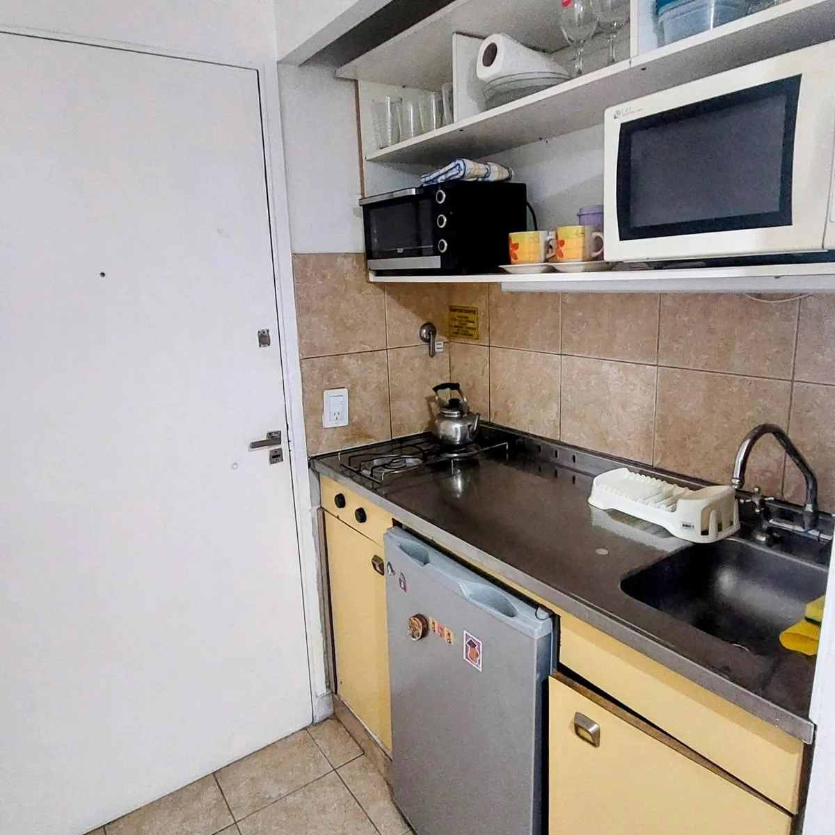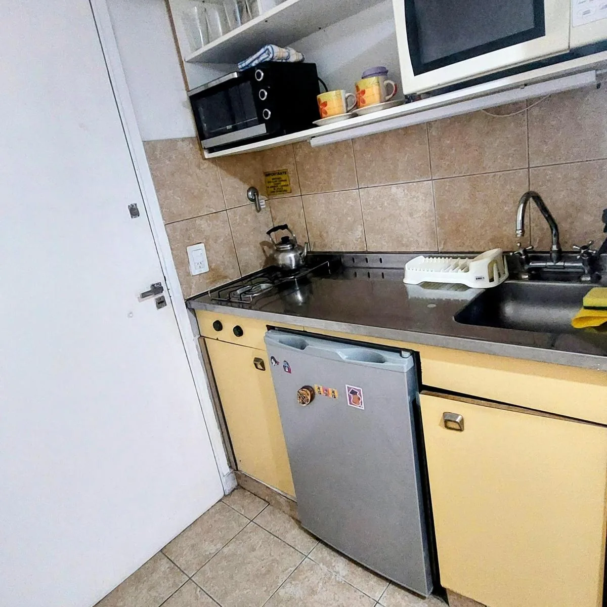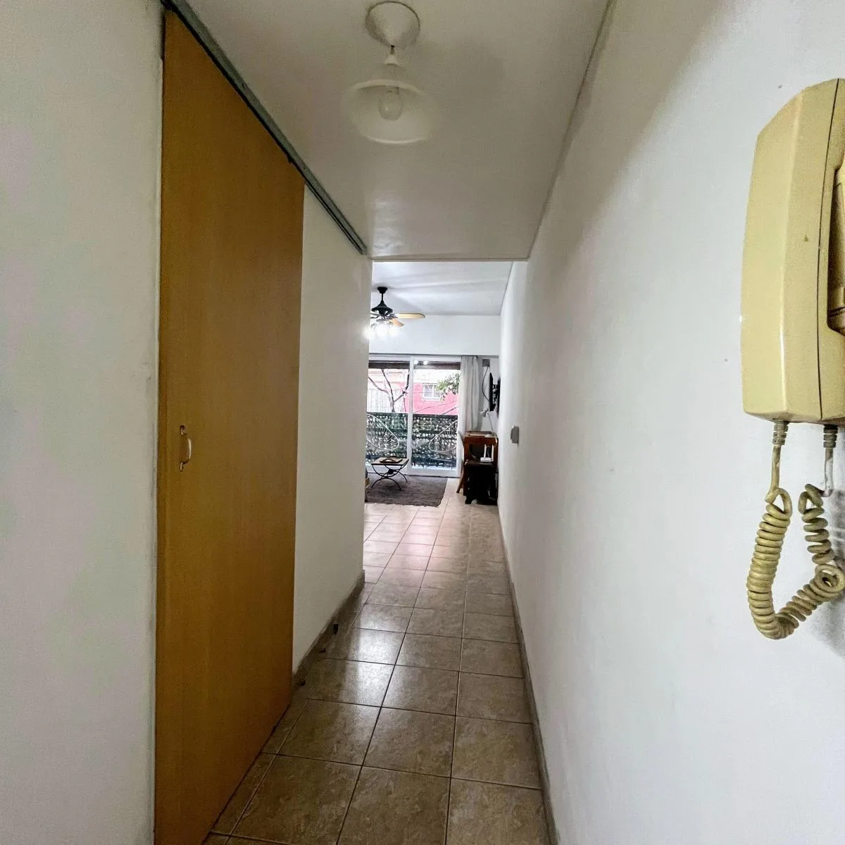 Kitnet mobiliada em Balvanera com 30 m² e varanda. Cozinha kitchenette a gás com geladeira sob a bancada, banheiro completo e grande armário. Inclui cama de casal, sofá-cama, Smart TV, ar-condicionado frio/quente e ventilador de teto. O aluguel é de $550 e o condomínio está incluído. As demais despesas ficam a cargo do inquilino; contrato mínimo de 1 ano, com reajuste trimestral pelo IPC. Para 1 ou 2 pessoas.
