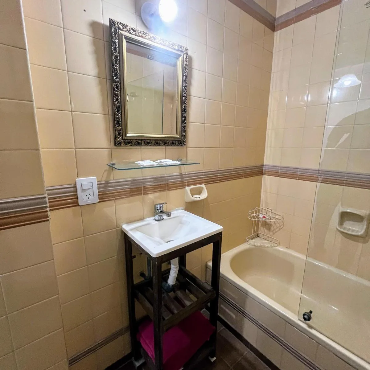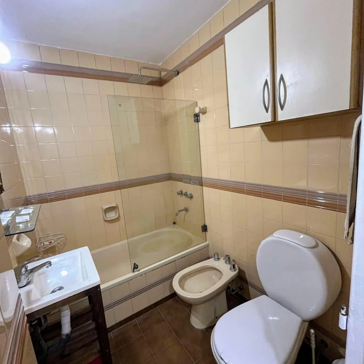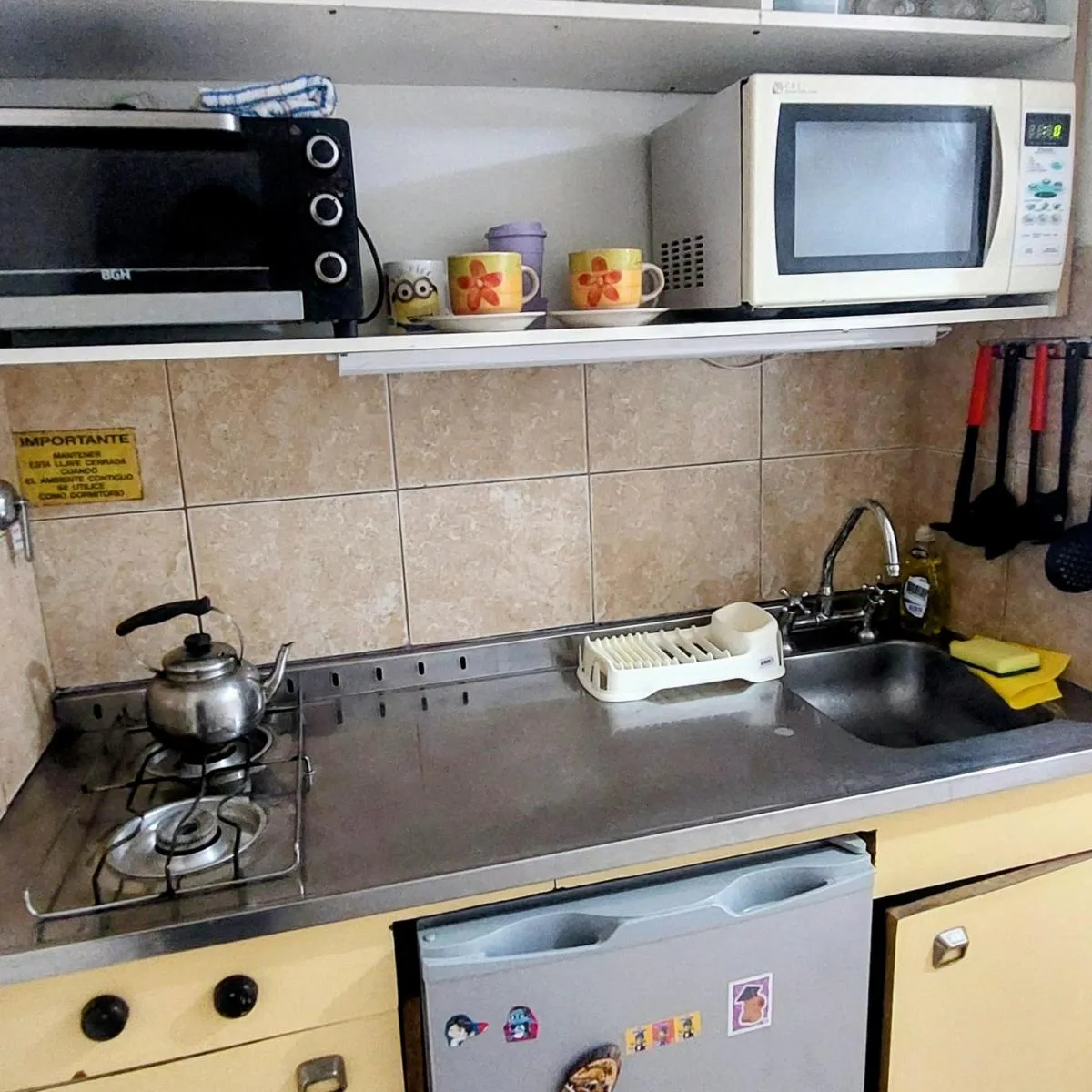 Kitnet mobiliada em Balvanera com 30 m² e varanda. Cozinha kitchenette a gás com geladeira sob a bancada, banheiro completo e grande armário. Inclui cama de casal, sofá-cama, Smart TV, ar-condicionado frio/quente e ventilador de teto. O aluguel é de $550 e o condomínio está incluído. As demais despesas ficam a cargo do inquilino; contrato mínimo de 1 ano, com reajuste trimestral pelo IPC. Para 1 ou 2 pessoas.