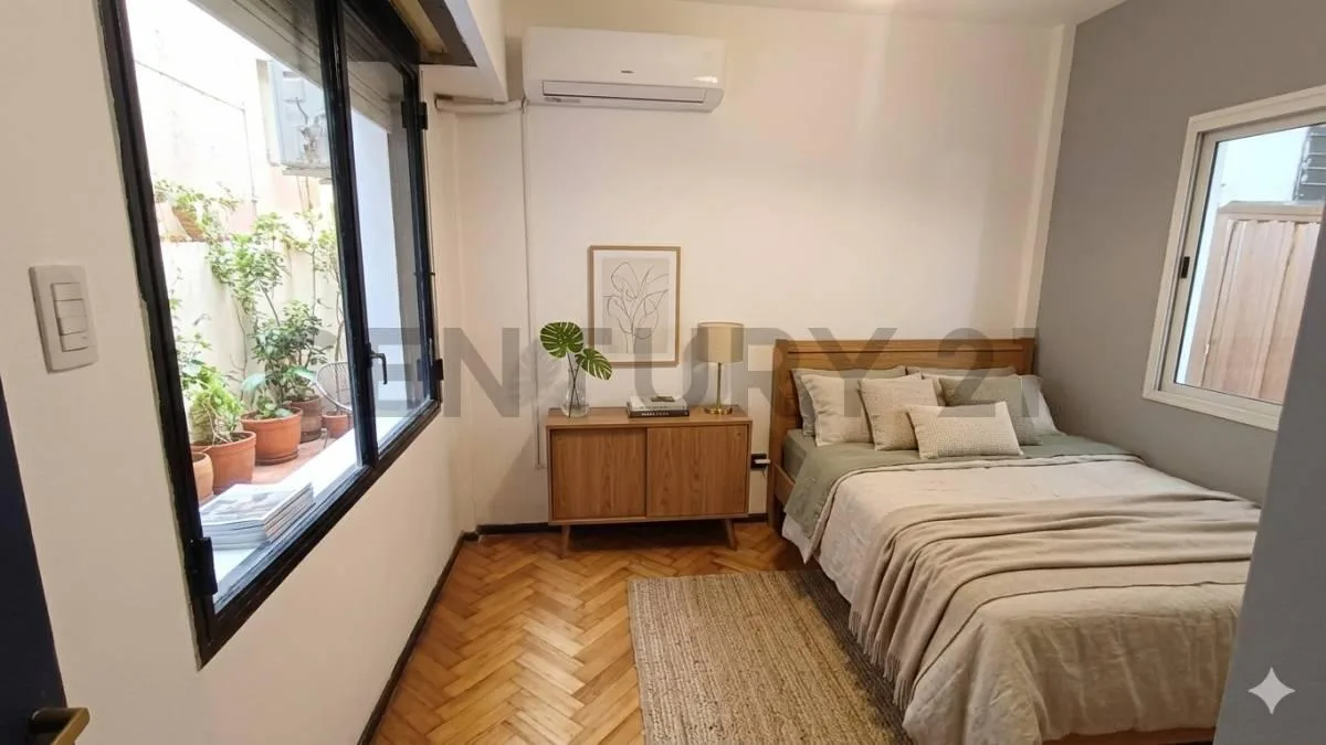Apartamento de dois ambientes (1 estúdio/1 dormitório) reformado, no térreo, com pátios internos cobertos. O living conta com saída direta para um pátio coberto. Cozinha completa com área de serviço/lavanderia em um segundo pátio coberto. Quarto com vista para os pátios, guarda-roupa embutido e banheiro completo com banheira. Água quente por aquecedor a gás (calefón) e ar-condicionado frio/calor já instalado. Condições de ingresso: 1 mês de adiantamento e 1 mês de depósito, com ajuste trimestral
