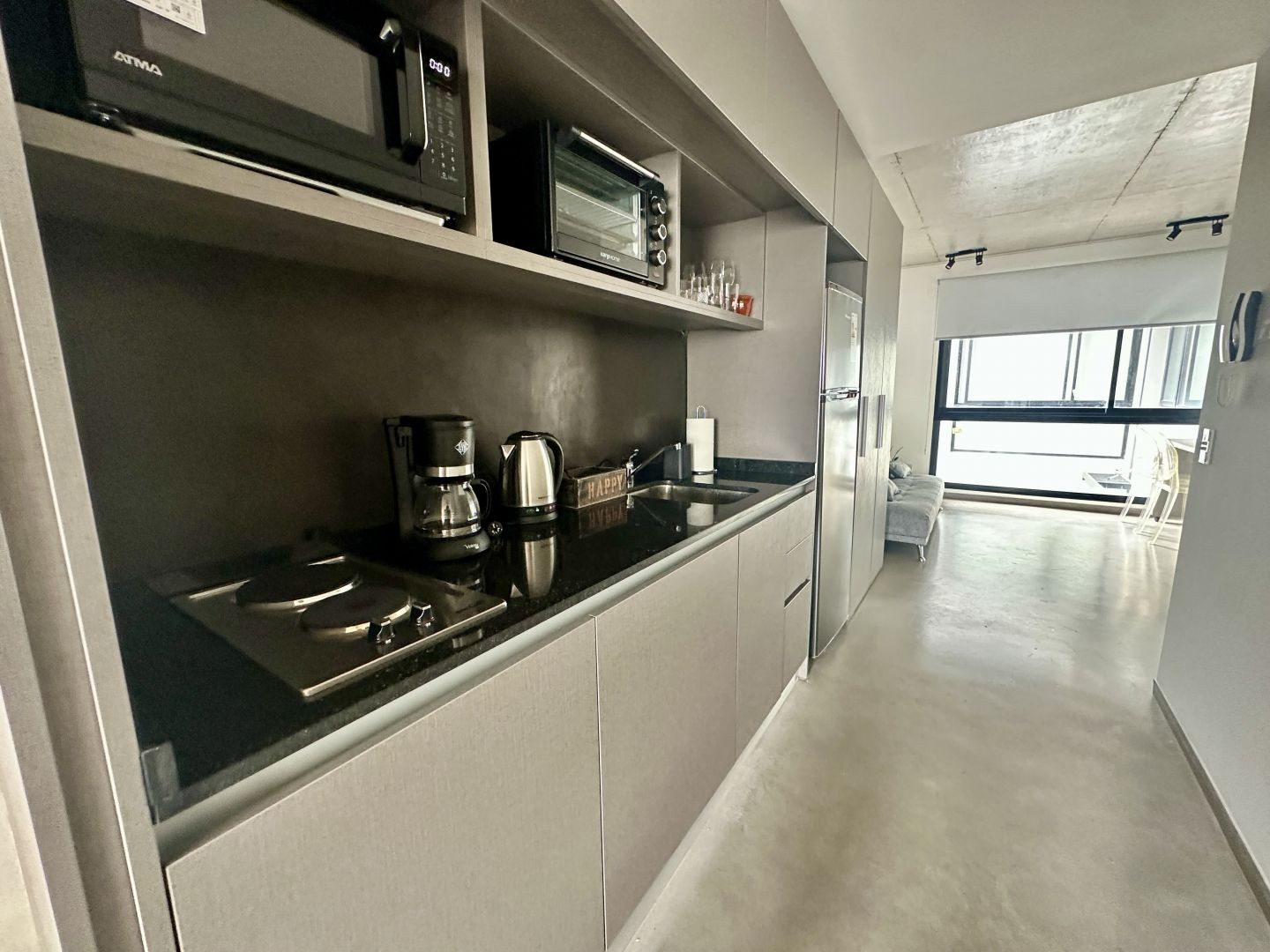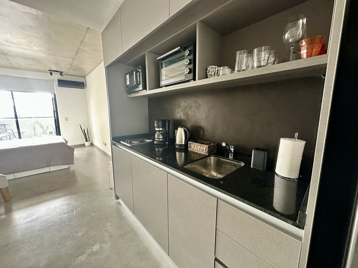 Apartamento de 2 ambientes em Balvanera. Planta com ambiente divisível, com área de dormitório com janela. Cozinha integrada à área principal.